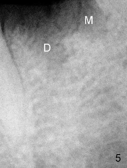 Fig.5 is taken immediately post extraction to show the septum between the mesial (M) and distal (D) sockets.