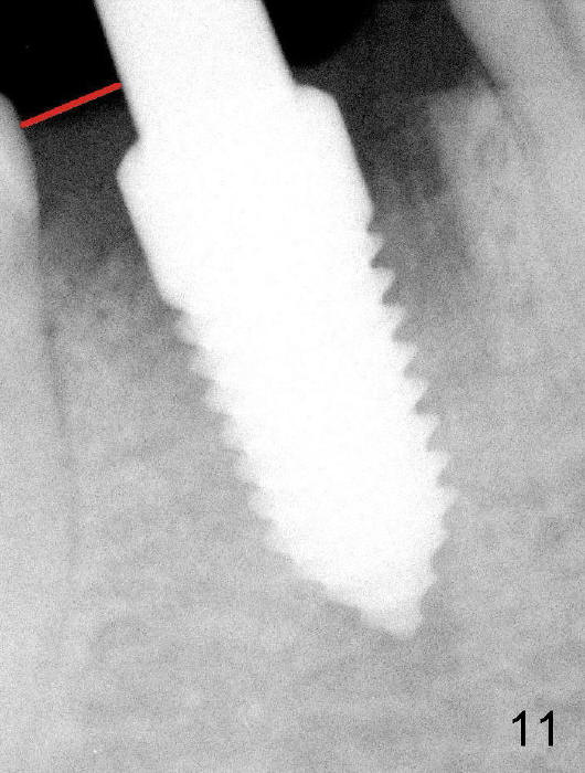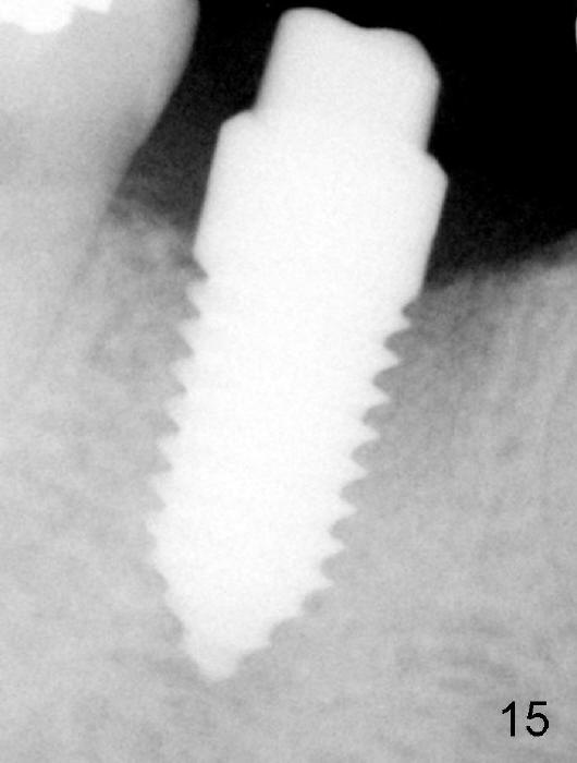 Fig.11: immediately post implantation (6x14 mm one piece). Fig.15: increased bone density in the mesial and distal sockets 3.5 months postop.