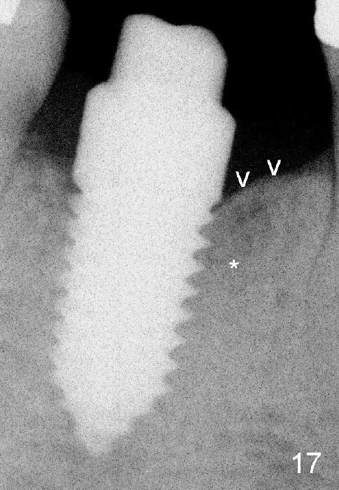 Fig.11: immediately post implantation (6x14 mm one piece). Fig.15: increased bone density in the mesial and distal sockets 3.5 months postop. Fig.17: the density of the mesial socket increases (*) with formation of the cortex (lamina dura (v)) coronally 8.5 months postop.