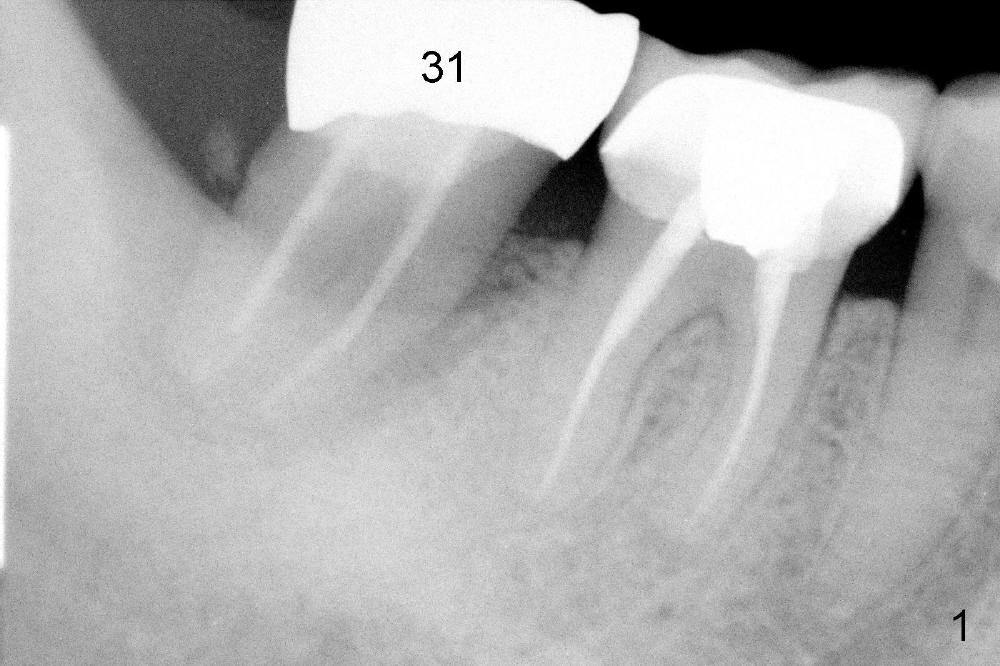 A 62-year-old lady has an advanced endo-perio disease associated with the tooth #31 (Fig.1). IAN is not distinct in the preop PA. IAN is assumed far away from implant area. The implant is planned to be placed along the long axis of the tooth for the best restorative result (Fig.2). The tissue-level implant is placed ~ 3 mm above the distal crest so that implant threads may be less likely exposed postop. Is it a good treatment plan?
