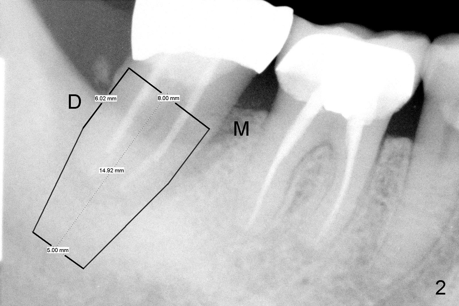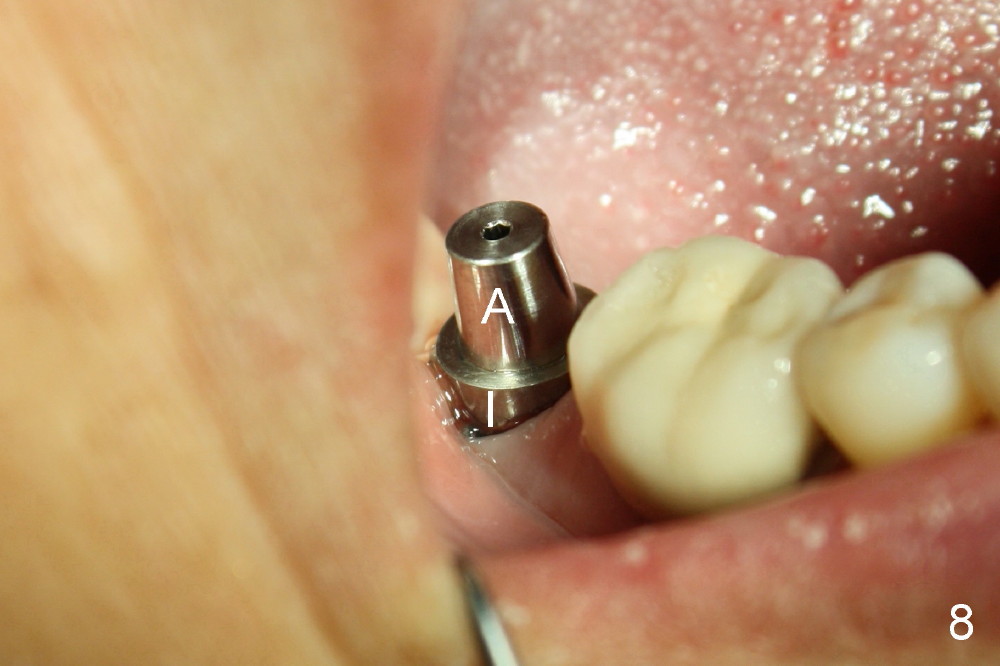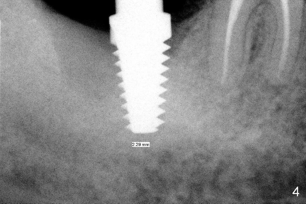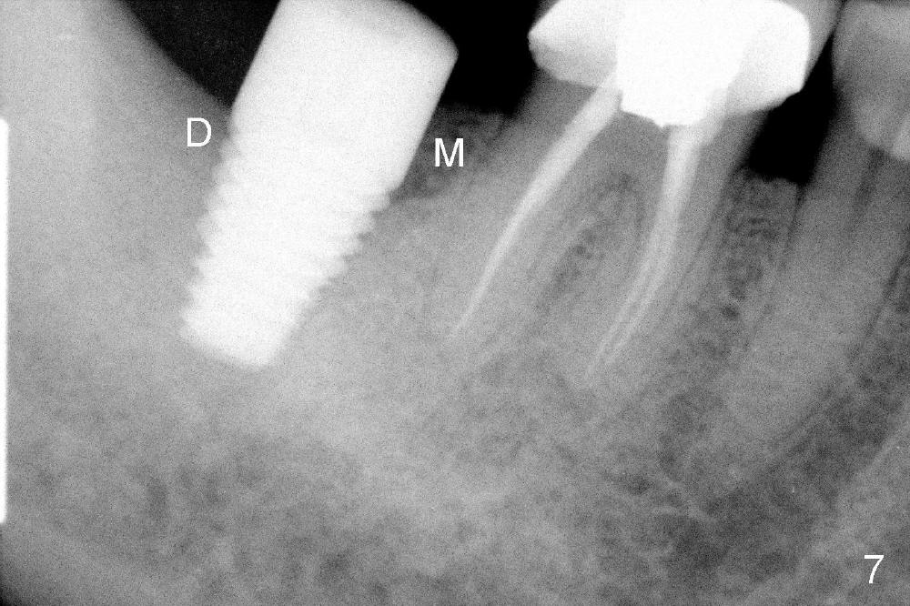 No. First at all, CT should be taken when 2D image does not show IAN. Fortunately, the surgery happens to be executed better than the plan. Clindamycin is used for socket soaking for 5 minutes. The initial osteotomy should be not exceeded 6 mm from the distal surface of the first molar (Fig.3: 5.92 mm). The 2 mm pilot drill (D) penetrates the mesial slope of the socket (red line) for 3-4 mm. There is 2.72 mm from IAN (yellow line: upper border of IAN canal). If the implant is placed along the long axis of the tooth, the initial osteotomy should start at the apex of the socket. The same pilot drill (black outline) penetrates the nascent bone for the same distance (3-4 mm) for primary stability, IAN may be invaded! The patient is a severe gagger. She manages to allow us to take this PA (Fig.3) and the next one (Fig.4 with 6x14 mm tap in place, primary stability having been achieved). To close the socket, a 7x14 mm implant is placed. Immediately postop PA is taken twice without success. The socket is closed with 2 sutures and heals around the implant 8 days postop (Fig.5,6). PA is taken 2 months postop (Fig.7). The implant is not placed as deep as planned. It is stable without paresthesia of the lower lip. An abutment is placed (Fig.8: A) nearly 3.5 months postop.