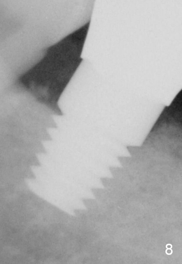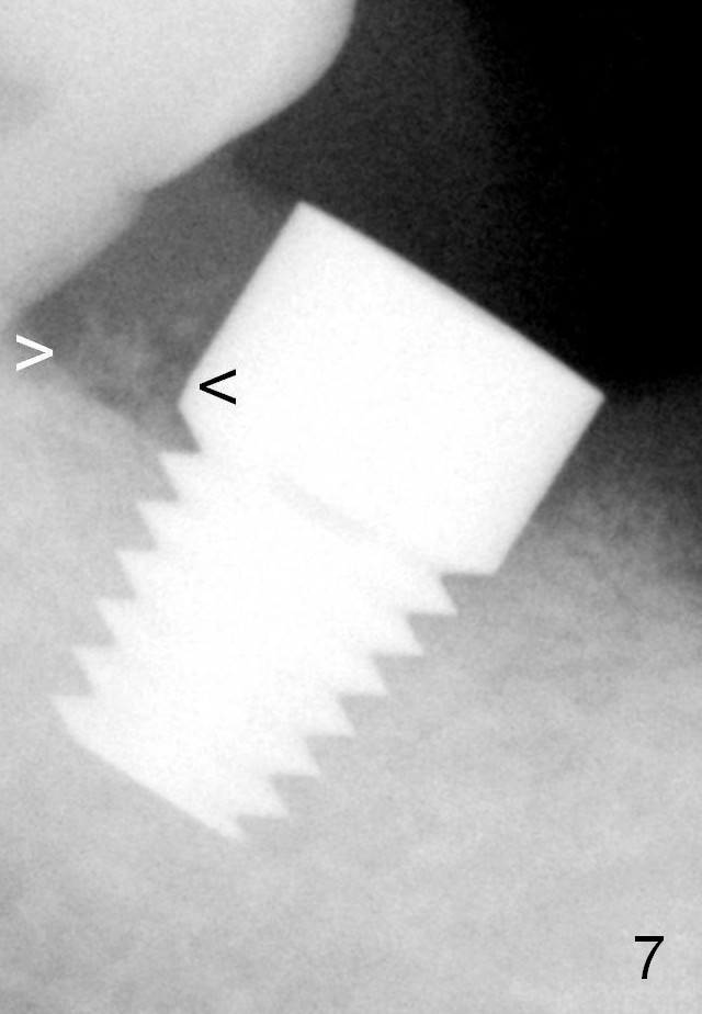 The implant remains stable 5 months postop (Fig.7). Apparent new bone is forming toward the distal coronal threads (between arrowheads).