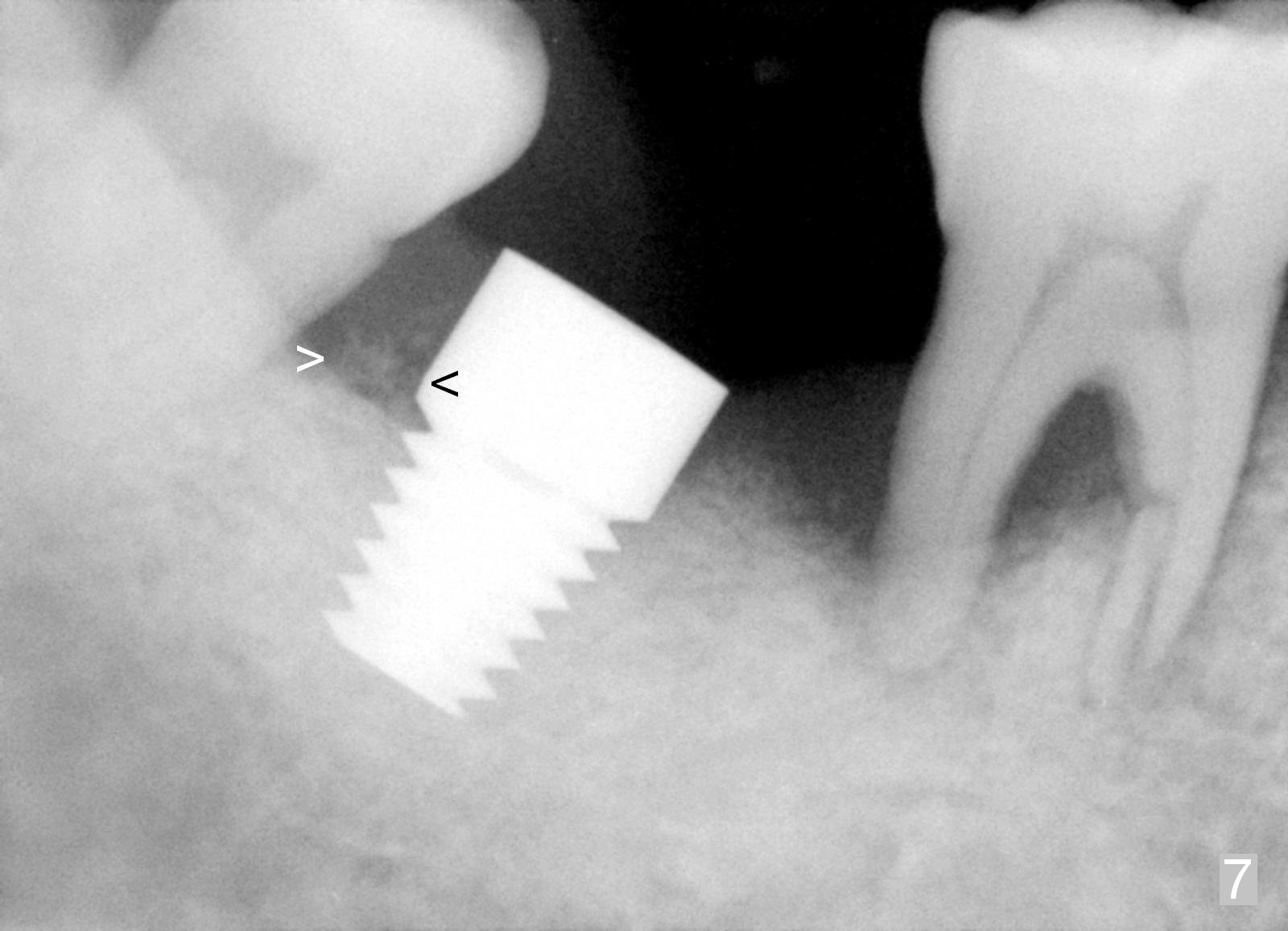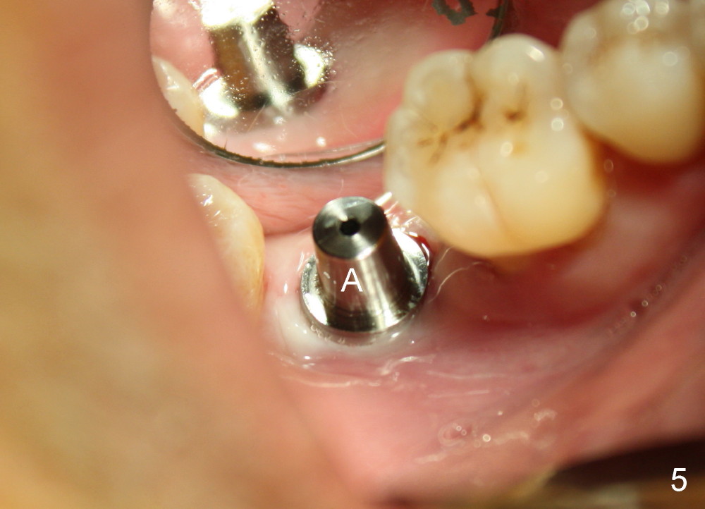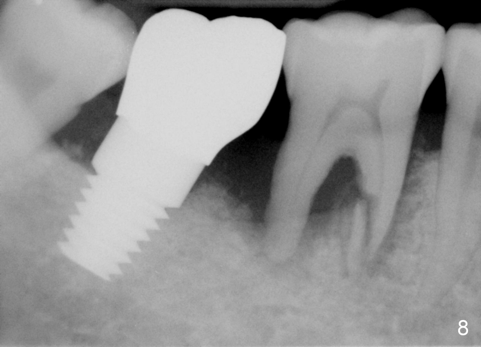 Luckily the patient returns for #31 implantation 4 months post socket preservation. Bone forms in the alveolus and above (Fig.1 black and white arrowheads, respectively). A 6 mm tissue punch is used to open the wound (Fig.2). Osteotomy forms using bone expanders, reamers and taps (Fig.3: 6x14 mm tap). Without infection, local anesthesia is more easily achieved than immediate implant when infection exists. The depth is controlled more readily with delayed implantation. Following adjustment of trajectory, a 7x11 mm implant is placed with insertion torque 60 Ncm (Fig.4 I). Fig.5 shows that the implant obliterates the wound; an abutment (A) is placed to retain perio dressing. With formation of new bone from socket preservation, insertion torque seems to be more easily obtained with the short implant. There is no space to re-use the harvested bone (Fig.6). The implant remains stable postop. Apparent new bone is forming toward the distal coronal threads 5 months postop (Fig.7). The bone around the implant remains stable 17 months post cementation (Fig.8), although there is an episode infection at the neighboring tooth (#30). The patient is more eager to have implants for the maxilla, since the flipper has lost. After implant placement at #7, the pain at #30 becomes more severe.