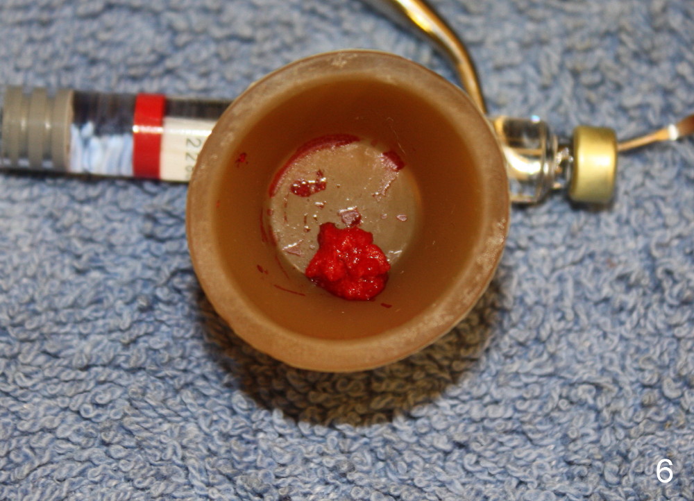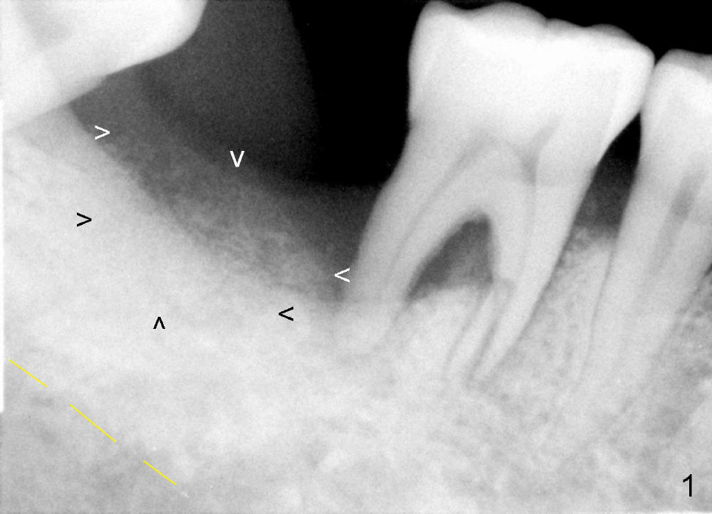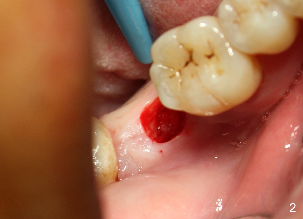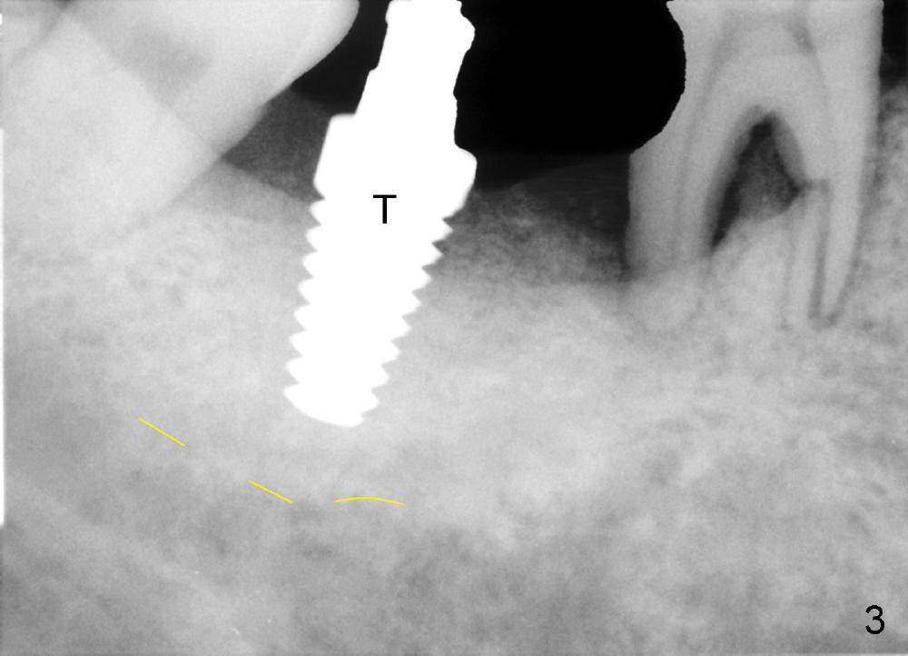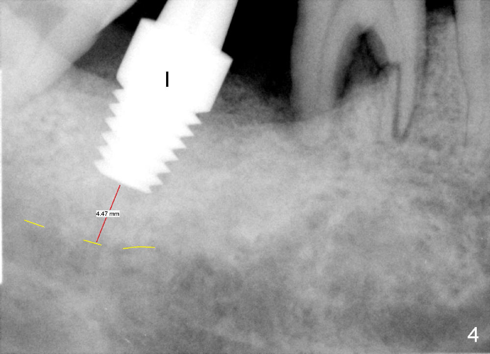Luckily the patient returns for #31 implantation 4 months post socket preservation. Bone forms in the alveolus and above (Fig.1 black and white arrowheads, respectively). A 6 mm tissue punch is used to open the wound (Fig.2). Osteotomy forms using bone expanders, reamers and taps (Fig.3: 6x14 mm tap). Without infection, local anesthesia is more easily achieved than immediate implant when infection exists. The depth is controlled more readily with delayed implantation. Following adjustment of trajectory, a 7x11 mm implant is placed with insertion torque 60 Ncm (Fig.4 I). Fig.5 shows that the implant obliterates the wound; an abutment (A) is placed to retain perio dressing. With formation of new bone from socket preservation, insertion torque seems to be more easily obtained with the short implant. There is no space to re-use the harvested bone (Fig.6). The implant remains stable postop. Apparent new bone is forming toward the distal coronal threads 5 months postop (Fig.7). The bone around the implant remains stable 17 months post cementation (Fig.8), although there is an episode infection at the neighboring tooth (#30). The patient is more eager to have implants for the maxilla, since the flipper has lost. After implant placement at #7, the pain at #30 becomes more severe.