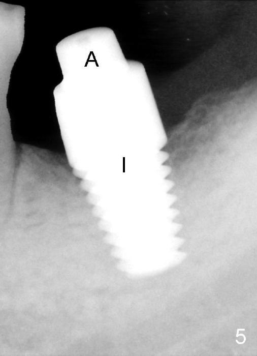 The apical space disappears when a 7x14 mm implant (Fig.5 I) is placed. A: abutment.