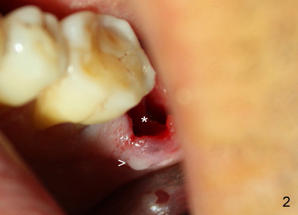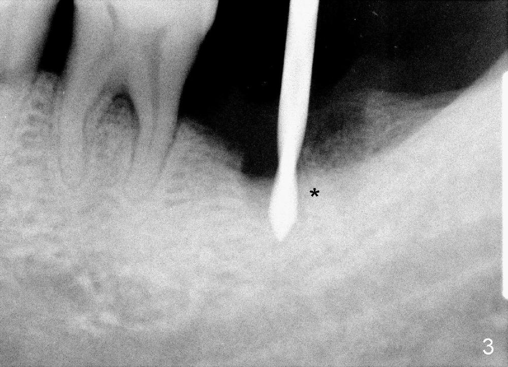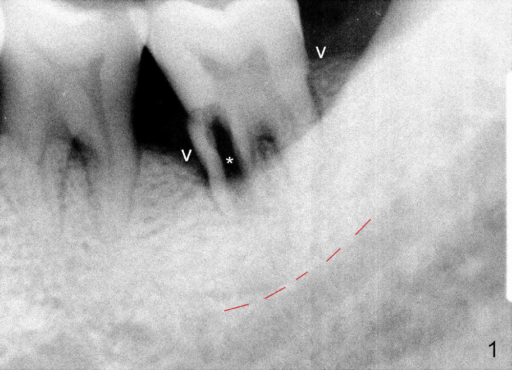 A 51-year-old man has generalized chronic periodontitis. The mesial root of #18 has vertical fracture (Fig.1*) with infection. The patient agrees extraction (Fig.2) and immediate implant. The septum is thin. The pilot drill drops into either the mesial (Fig.3) or distal sockets. Furthermore it is difficult to control pain probably due to severe infection (Fig.2 >: mesiobuccal erythema and edema). Repeated local infiltration does not alleviate pain associated with drilling. Block anesthesia has to be administered (one carpule of 2% Lidocaine with 1:100,000 Epinephrine). Damage to the inferior alveolar nerve (Fig.1 red dashed line) increases. On the other hand, osteotomy through the socket of the tooth with periodontits is easier because of shallow socket. Retraction of the buccal gingiva can reveal the bottom of the socket. We will increase the depth slowly until a tap obtains initial stability. The worst scenario is that active hemorrhage from the socket bottom is encountered initially. The nerve injury can be reduced minimally.