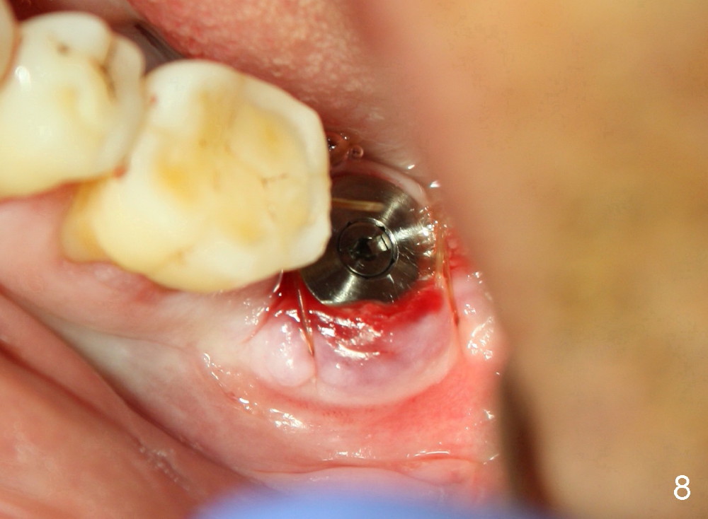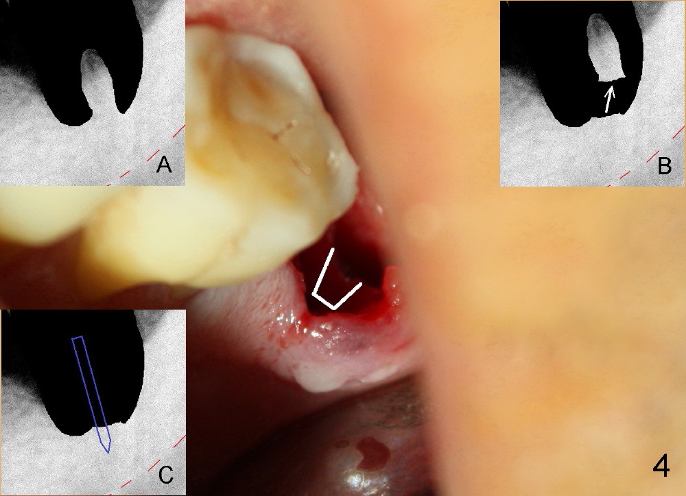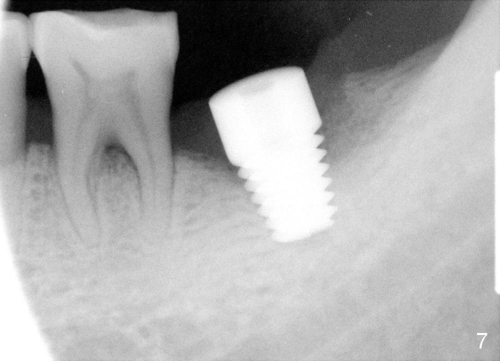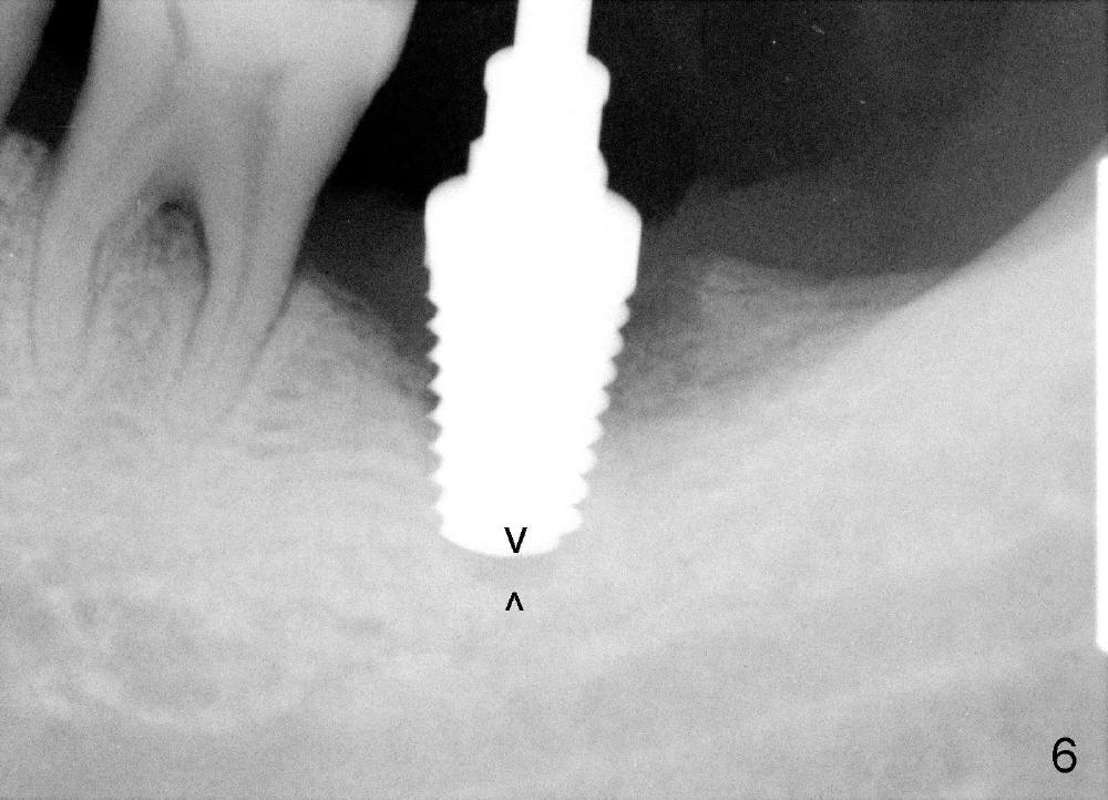 How about flatten the septum (Fig.4 white lines; from inset A (post extraction) to B)? When the septum is level with the mesial and distal sockets, a drill easily penetrates the middle of the socket (Fig.3 inset C). With strict control of depth, the osteotomy increases until a 6x14 mm tap gets initial binding to the socket (Fig.5: depth 11 mm). After increase in the depth by 1-2 mm, PA is taken with a 7x14 mm tap (Fig.6). There is a gap that the tap or the corresponding implant can engage further (between arrowheads). After increase in the diameter in the bottom of the osteotomy, a 7x11 mm implant is placed with insertion torque between 45 and 50 Ncm; the threads of the implant have tight contact with the bone (Fig.7). With the large diameter implant, the socket opening is closed without too much tension (Fig.8). The wound is protected with perio dressing. Postop there is no paresthesia. Pain is controlled by Hydrocodon/Acetaminophen. A long acting local anesthetic (Marcaine) should have been used immediately postop. Next morning, the patient is pain free. A short implant should be used in a critical area such as the lower 2nd molar where the inferior alveolar nerve is nearby. However, the implant is found unstable 1 month postop.
