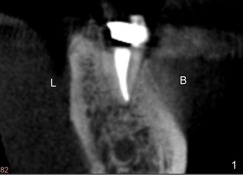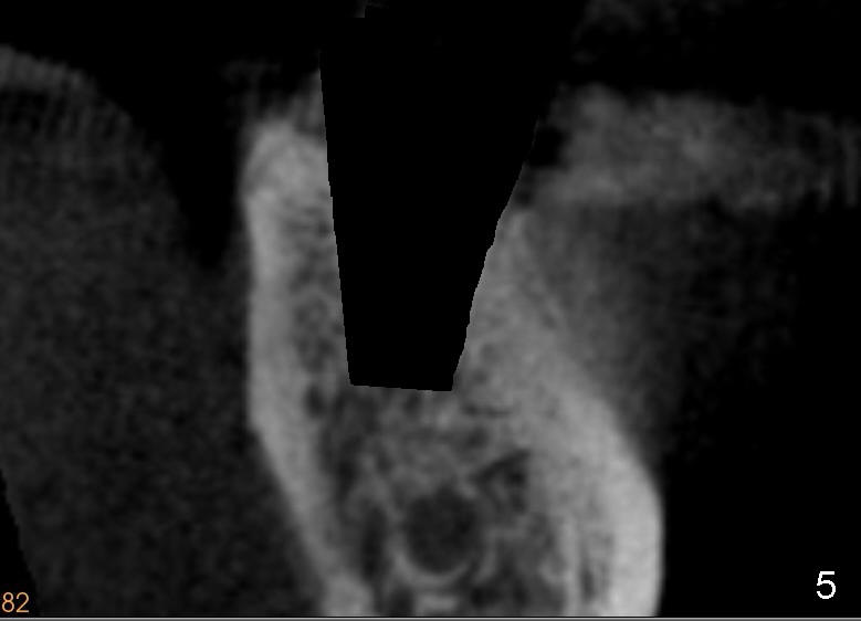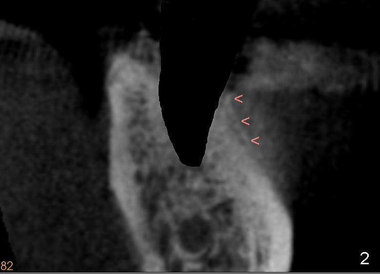 The root of the lower molar is more or less situated buccally, as shown in Fig.1 (coronal section of the distal root of a 2nd molar). If osteotomy follows the path of the original socket (black shadow in Fig.2 (Fig.1 after extraction)), the buccal plate (<) would be thin and low when an implant is placed.