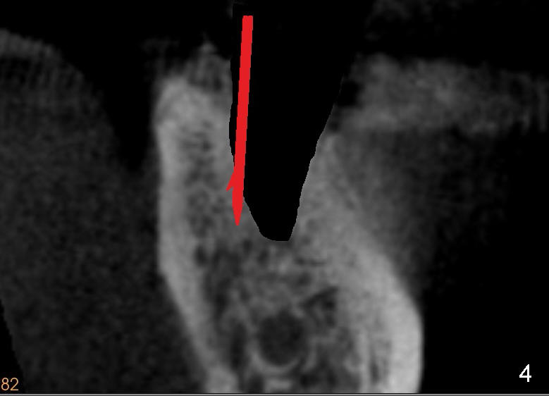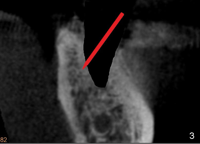 To overcome this problem, a pilot drill penetrates the buccal slope of the lingual wall (Fig.3 red line). Once the pilot drill gets "bite", change its direction to finish osteotomy (Fig.4). When subsequent drills are being used, lean each drill lingually, against "natural" tendency of the drill sliding buccally.