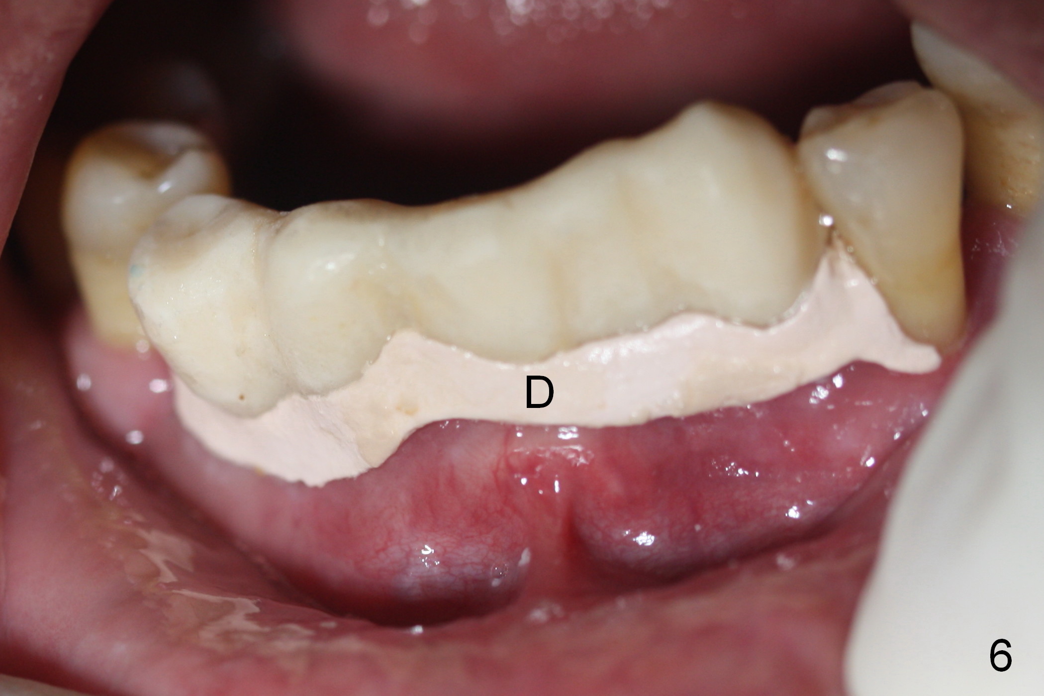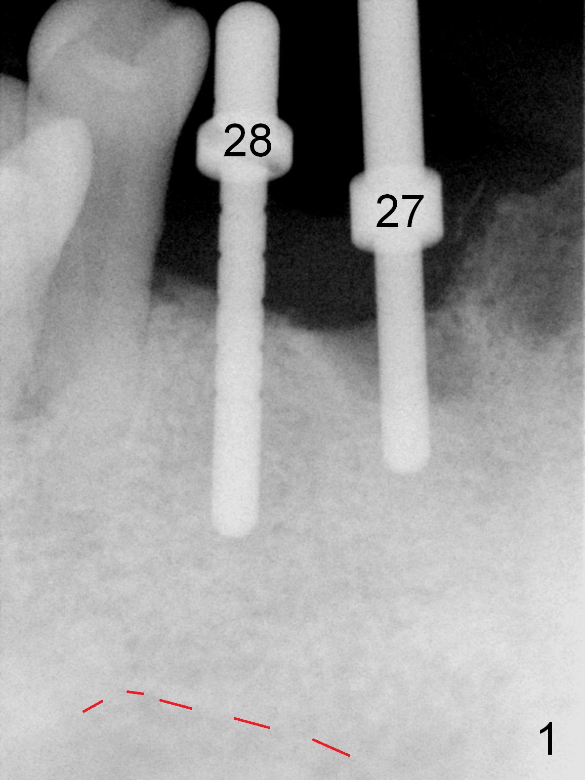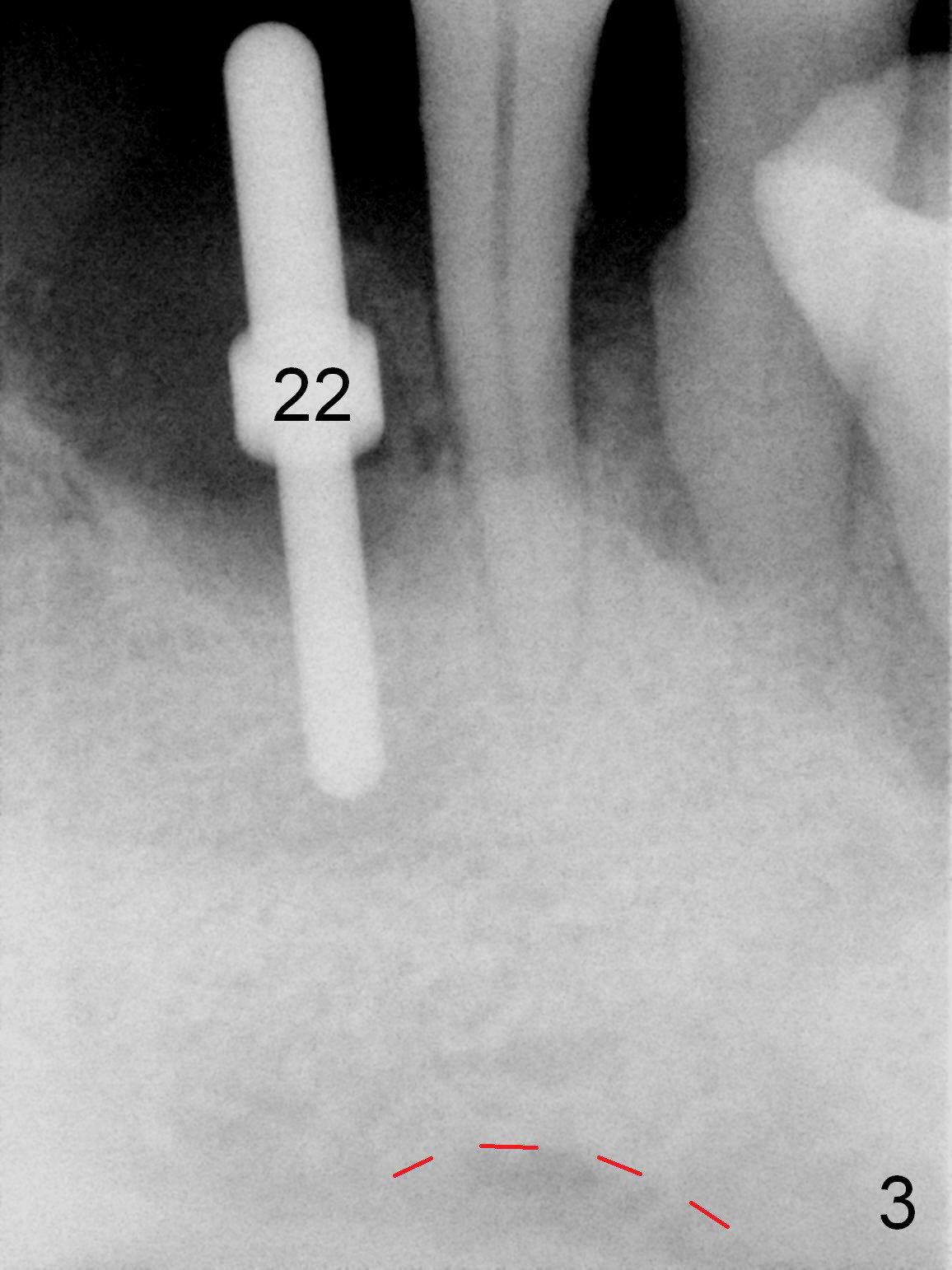 As expected, the bone density in the mandibular anterior region is found to be high during initial osteotomy (Fig.1-3). Five implants are placed at the sites between #22 and 28 (Fig.4,5): 3x14(2) mm 1-piece (bone-level) implants in the incisor region; 4.5x17 mm 2-piece (tissue-level) ones in the canine/premolar area. All of the implants are placed as lingual as possible. Bone graft is placed (*). Red dashed line: the superior border of the Inferior Alveolar Canal. Immediate splinted provisional bridge is fabricated. One week postop, periodontal dressing remains attached to the provisional and the gingiva.