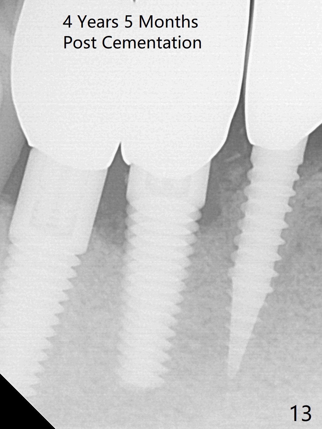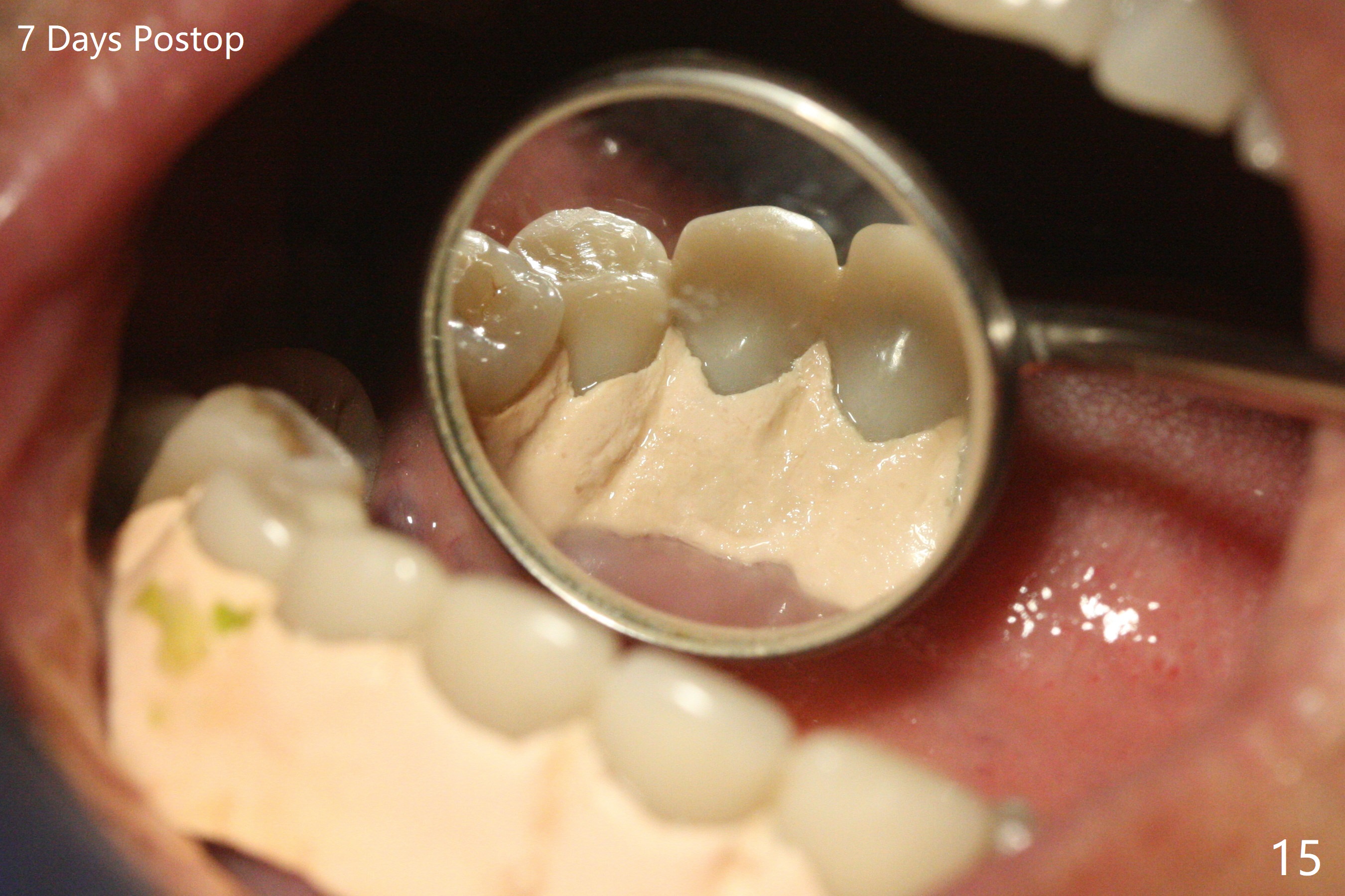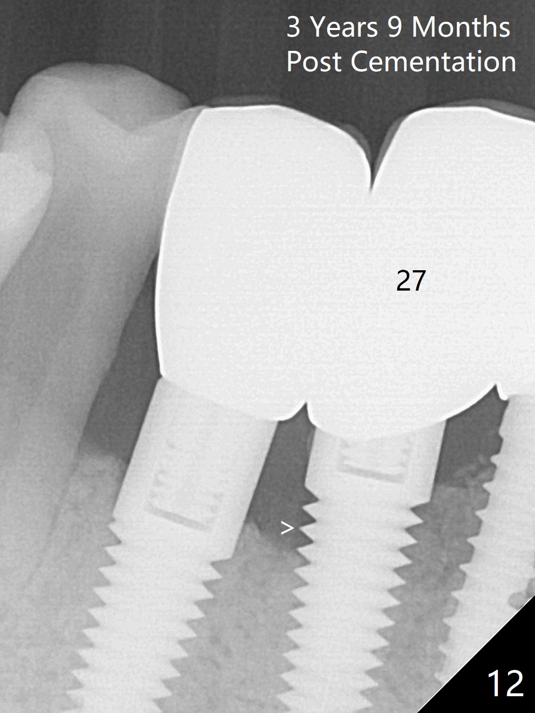The implants remain asymptomatic years months post cementation (Fig.12), while the one at #27 is associated with buccal and lingual swelling and hemorrhage and bone loss (Fig.13). There is bone loss distal to #27 without symptom 3 years 9 months post cementation (Fig.12). Periimplantitis develops buccal and lingual 4 years 5 months post cementation (coronavirus, Fig.13). Sticky bone and PRF are used after debridement. There is no discomfort 7 days postop (Fig.14,15).