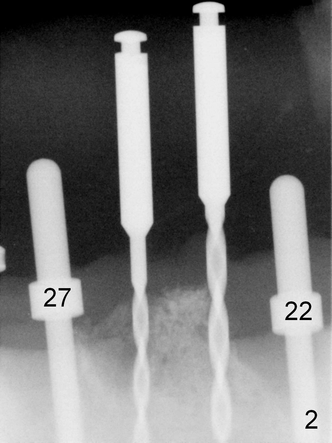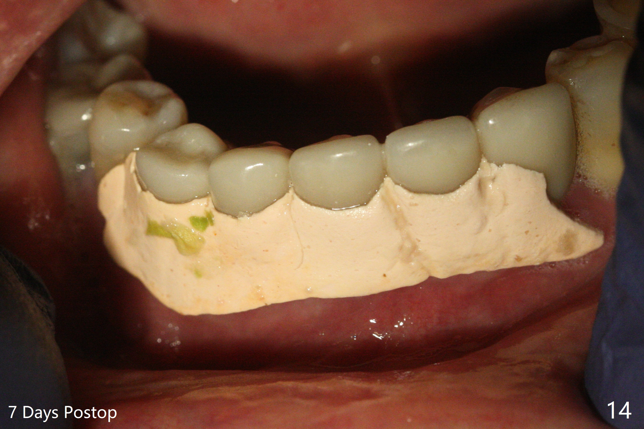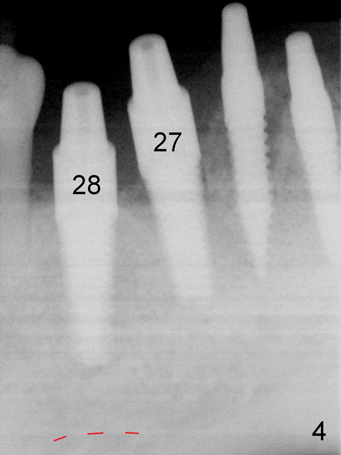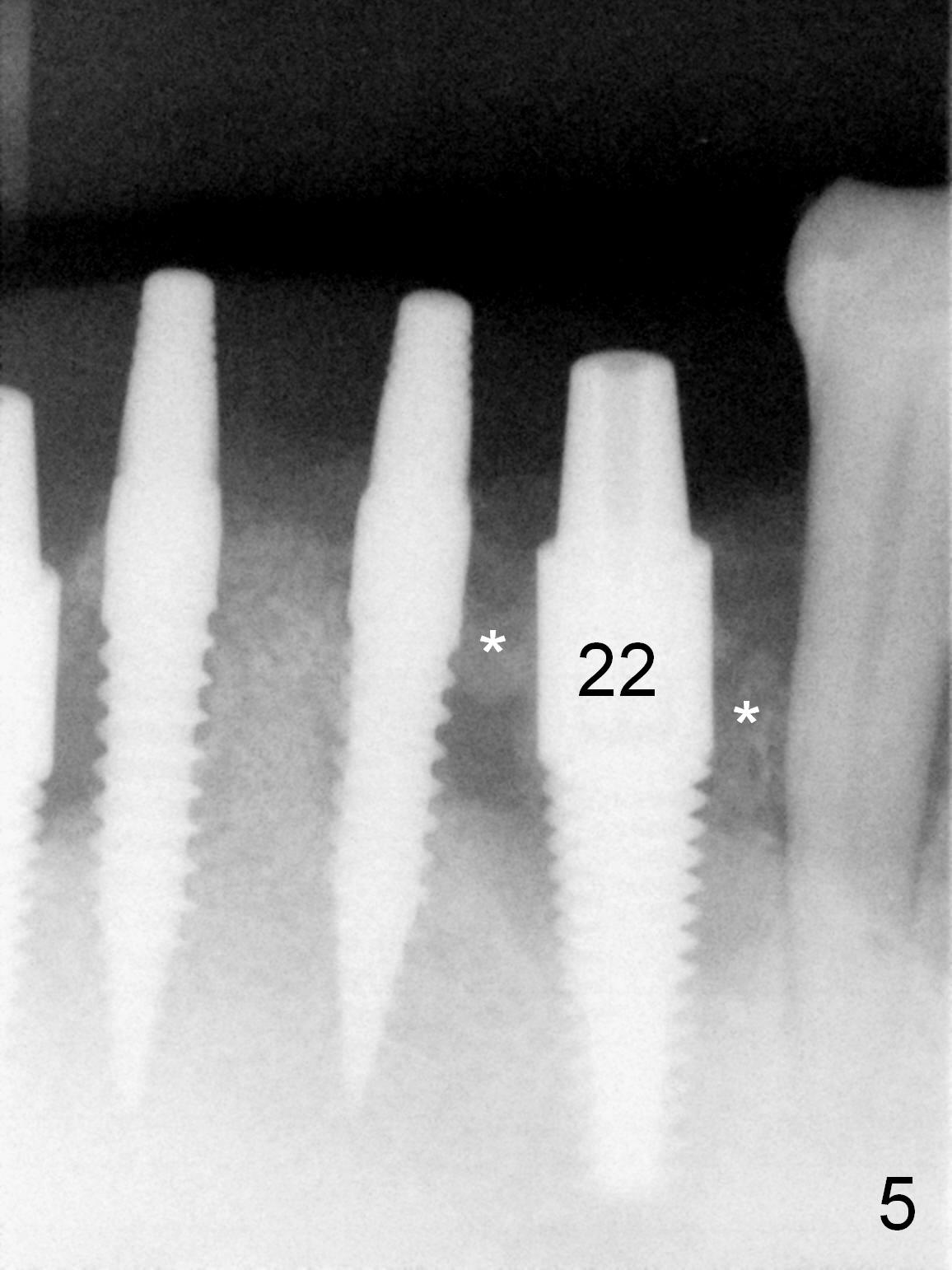 The implants remain asymptomatic years months post cementation (Fig.12), while the one at #27 is associated with buccal and lingual swelling and hemorrhage and bone loss (Fig.13). There is bone loss distal to #27 without symptom 3 years 9 months post cementation (Fig.12). Periimplantitis develops buccal and lingual 4 years 5 months post cementation (coronavirus, Fig.13). Sticky bone and PRF are used after debridement. There is no discomfort 7 days postop (Fig.14,15).