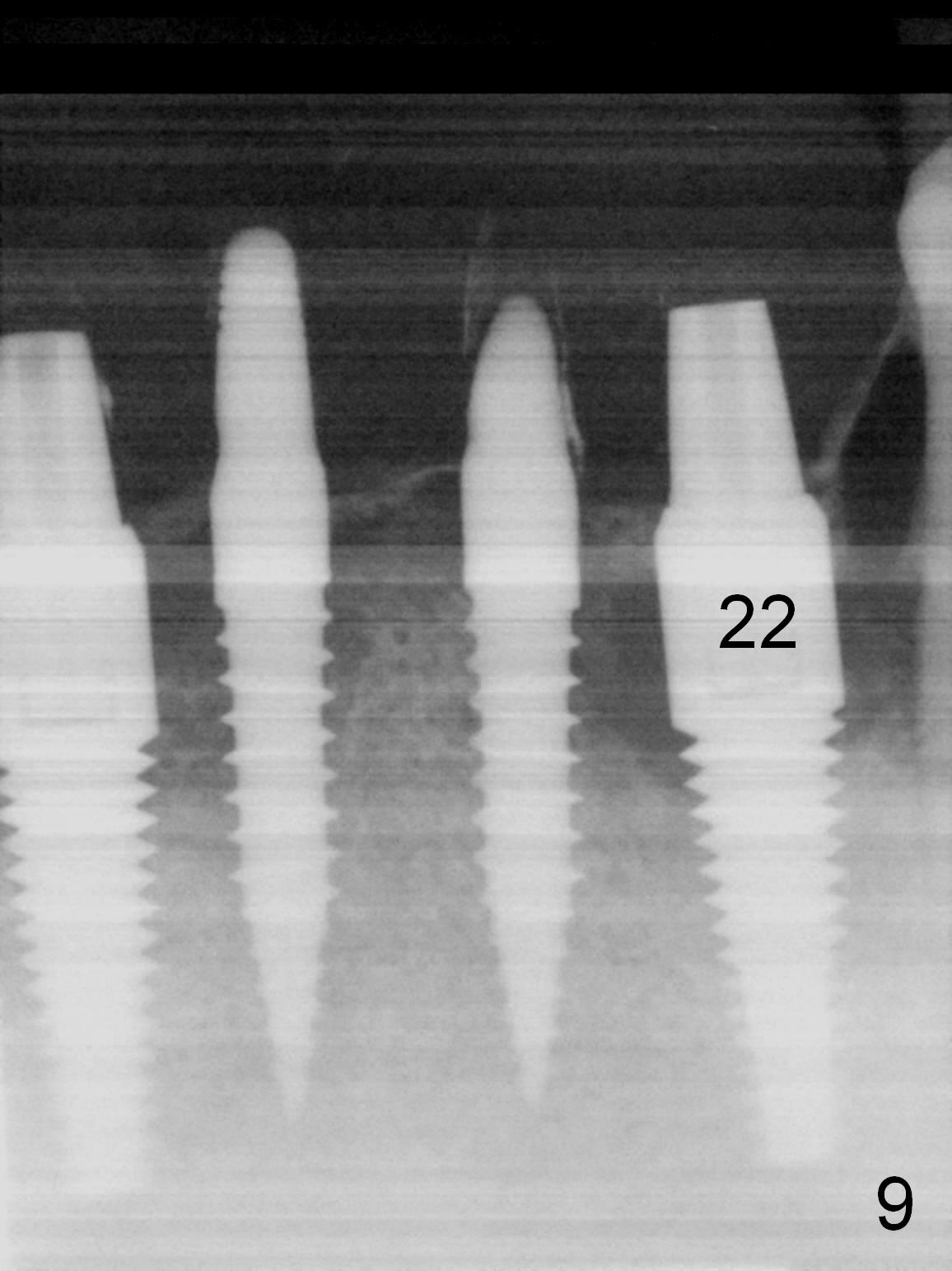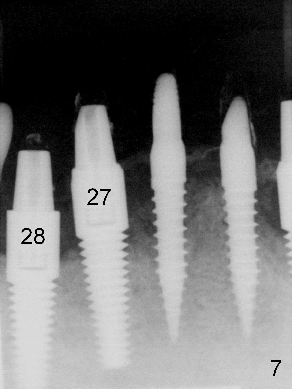 The patient returns for restoration 4.5 months postop (Fig.7-9). There appears bone growth around the implants. Impression is taken together with the implants at #4 and 6.