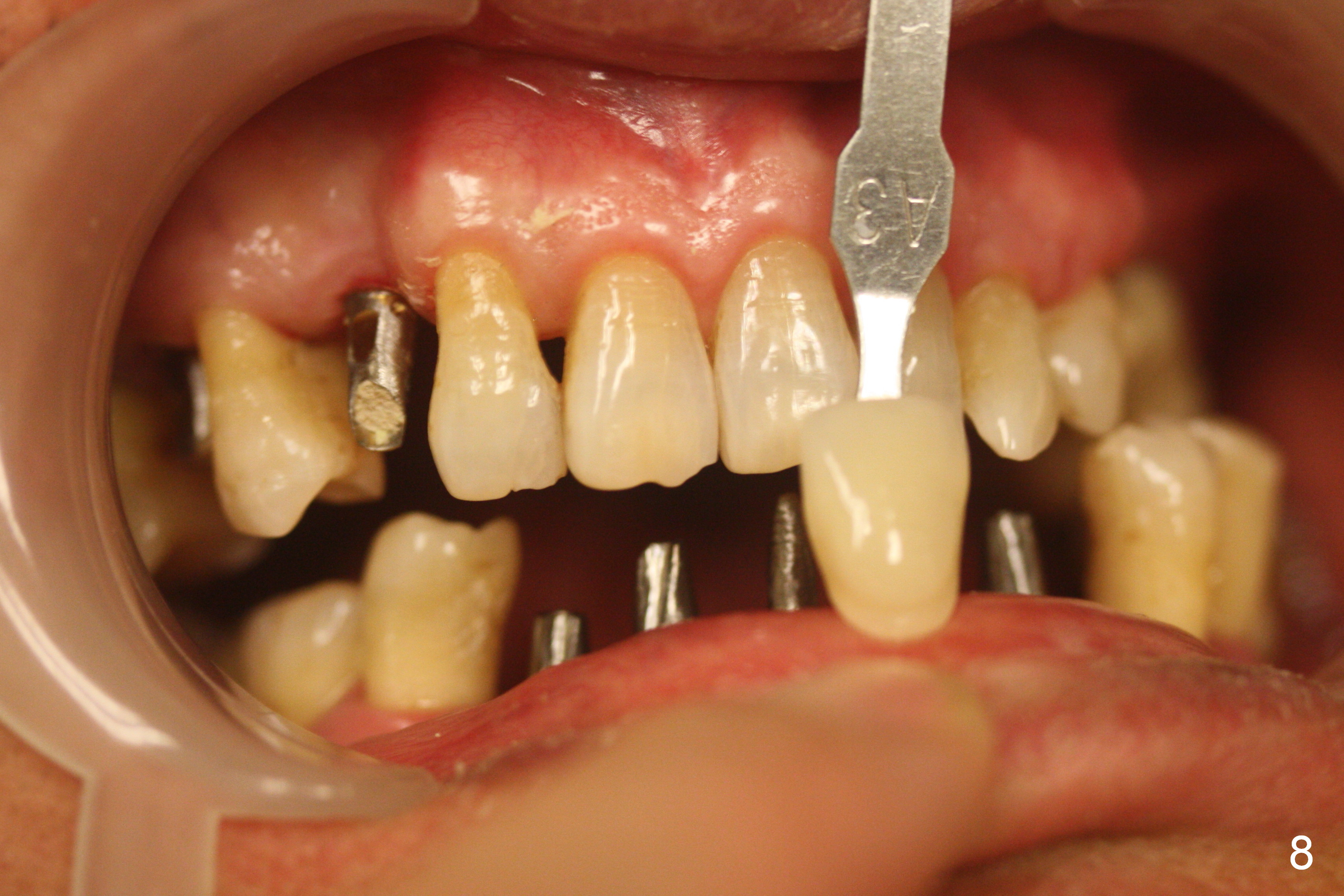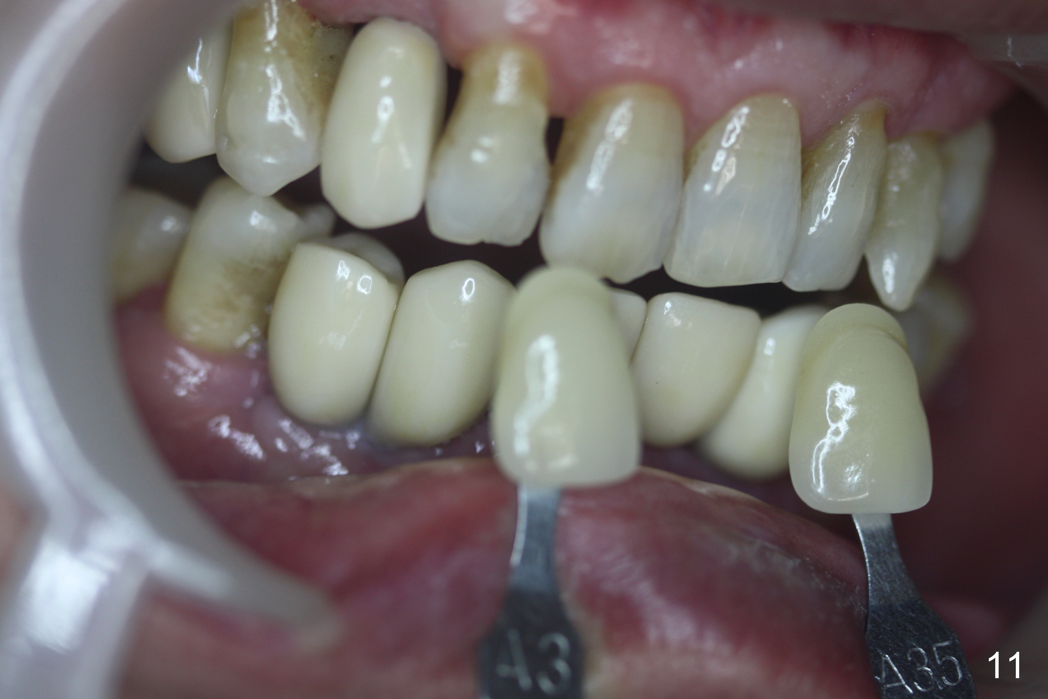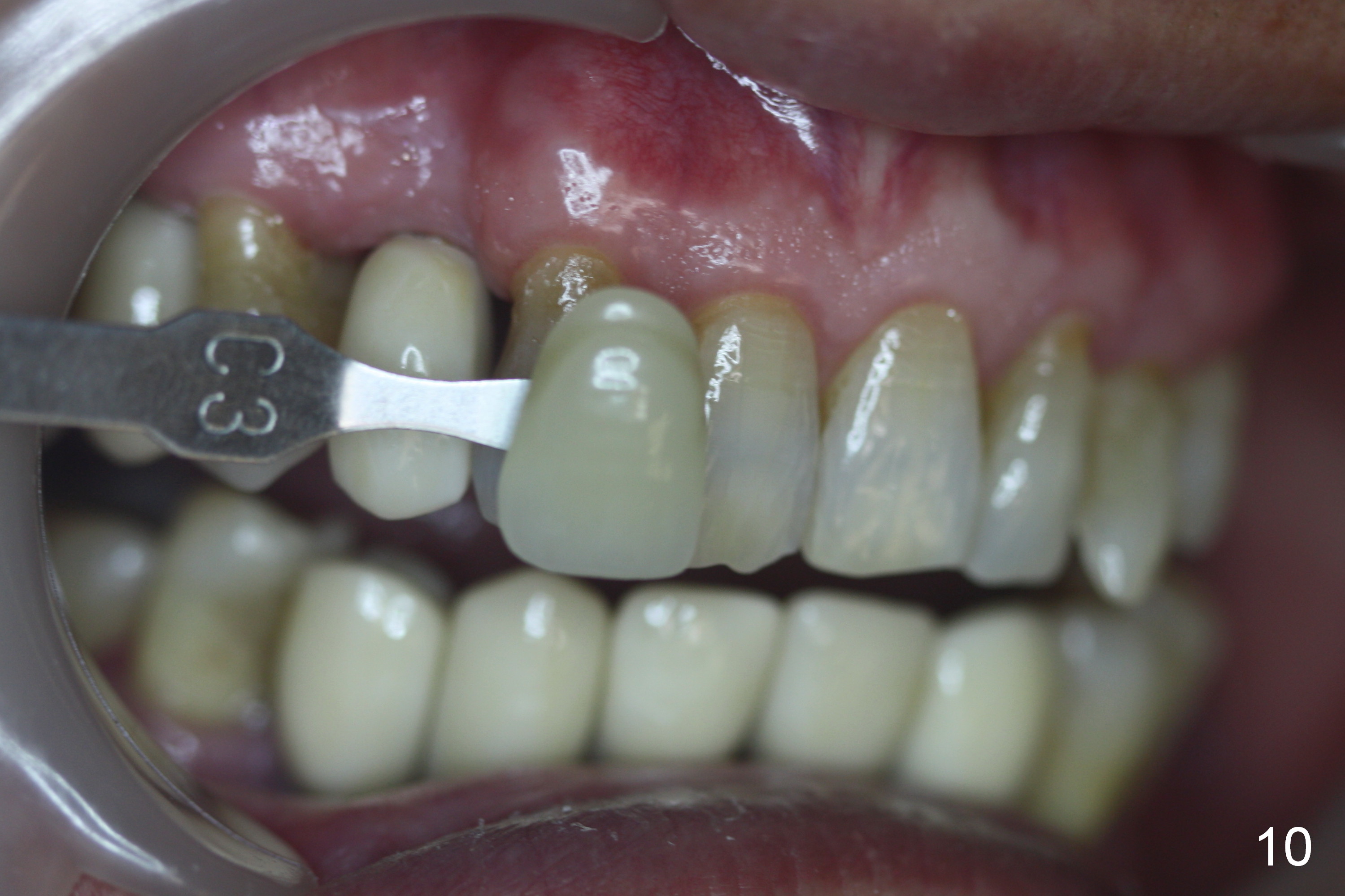 When the final crowns are seated, the shade is off. It appears that C3 is appropriate (Fig.10,11). Please make the crowns more transparent.