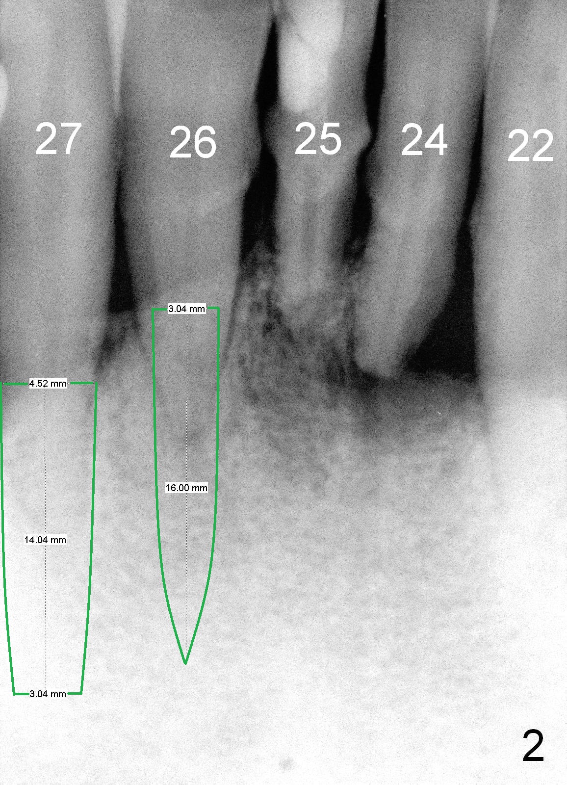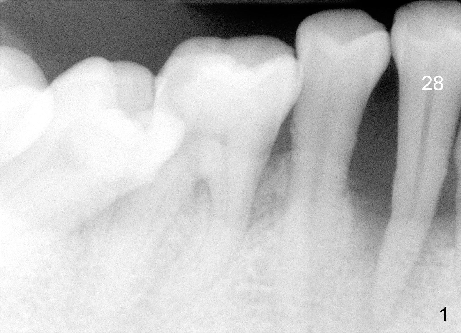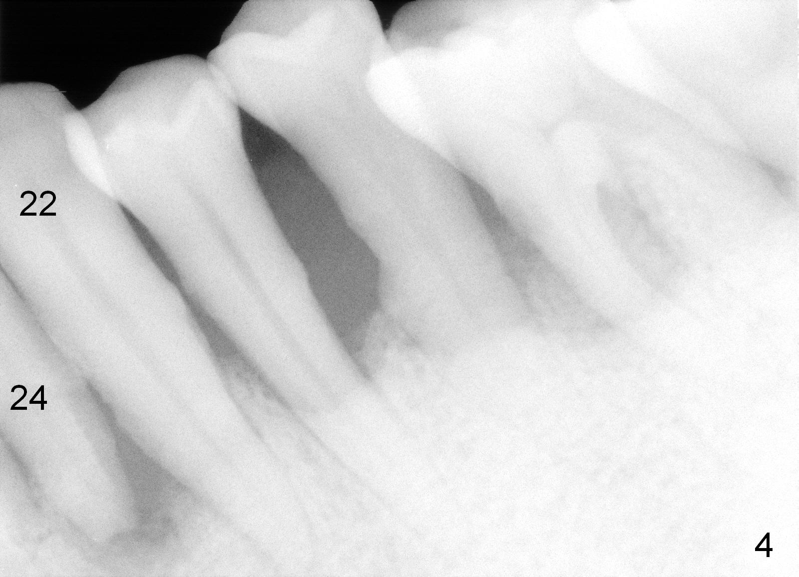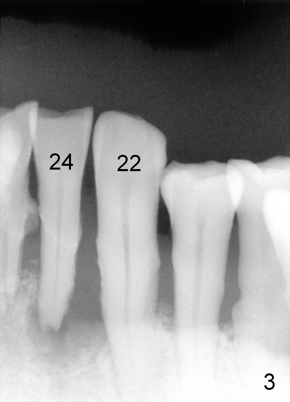 A 62-year-old man (CZ) has severe generalizd chronic periodontitis and occlusal trauma. Full mouth extraction and reconstruction is required. The patient prefers extraction by stage. The lower anterior segment reconstruction is our first treatment: from #22-28. The tooth #28 is exfoliated now (Fig.1 (full mouth X-ray was taken 4 years ago), 5). There are 3 incisors left. Two-piece implants are going to be placed for the canines and premolar, while 2 of 1 piece implants in the incisor sockets (treated with Metronidazole with Epinephrine gauze) for a bridge (Fig.2). Straight 1 piece 3 mm implants are routinely placed, whereas angled or 2.5 mm ones are backup. Two of 1.2 mm pilot drills and 3 of marked parallel pins may be needed.
