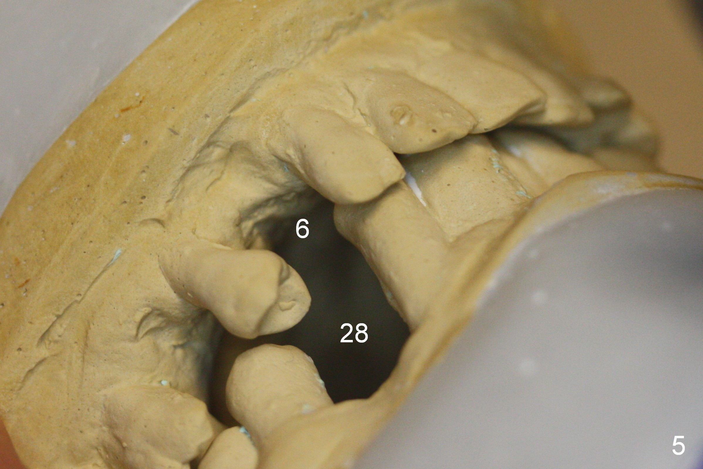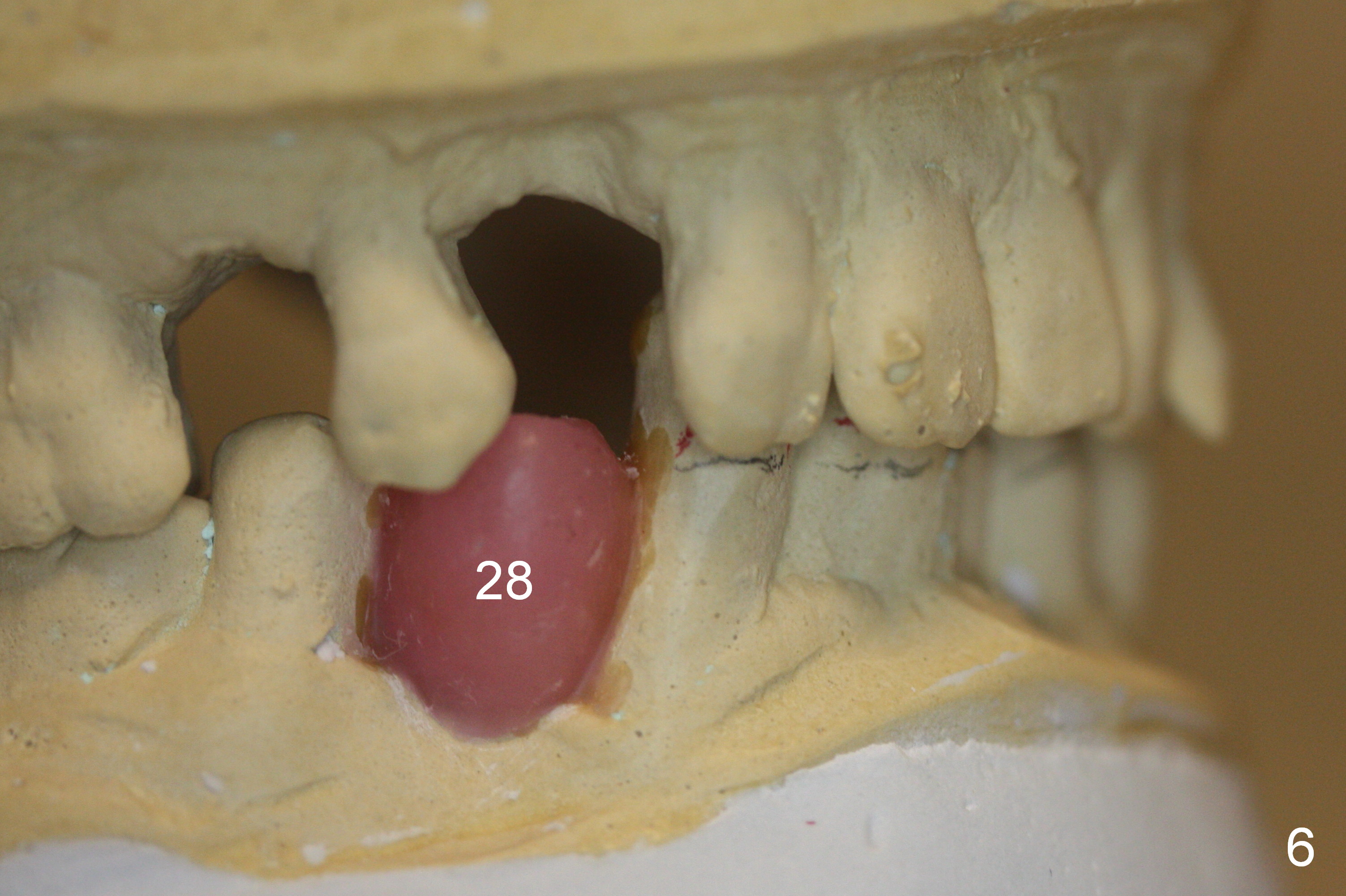 The waxed-up tooth at #28 appears to be too wide, probably due to mesial shifting of the anterior tooth (Fig.6). An implant will be placed at #28 prior to anterior tooth extraction so that the neighboring teeth will be used as trajectory guides. It will be placed as distal and lingual as possible. Surgical and restorative stents have been fabricated with change into normal overbite (Fig.6,7 red line).