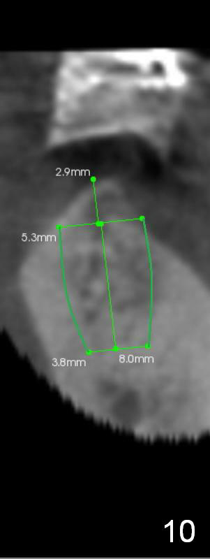 The implant at the site of #18 could be placed at the crestal level with bone graft (Fig.9: 5x10 mm). Or a shorter implant is placed deeper with or without grafting (Fig.10: 5.3x8 mm).