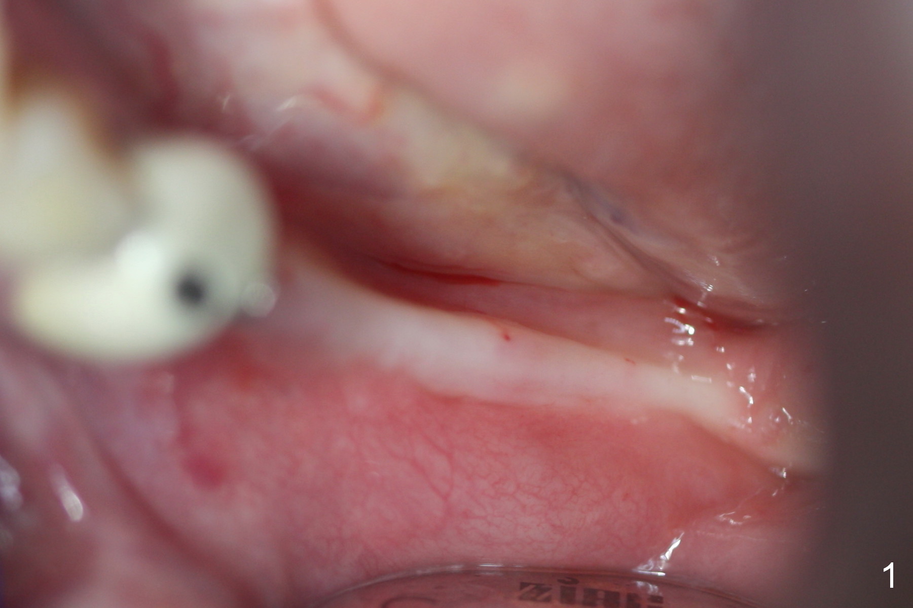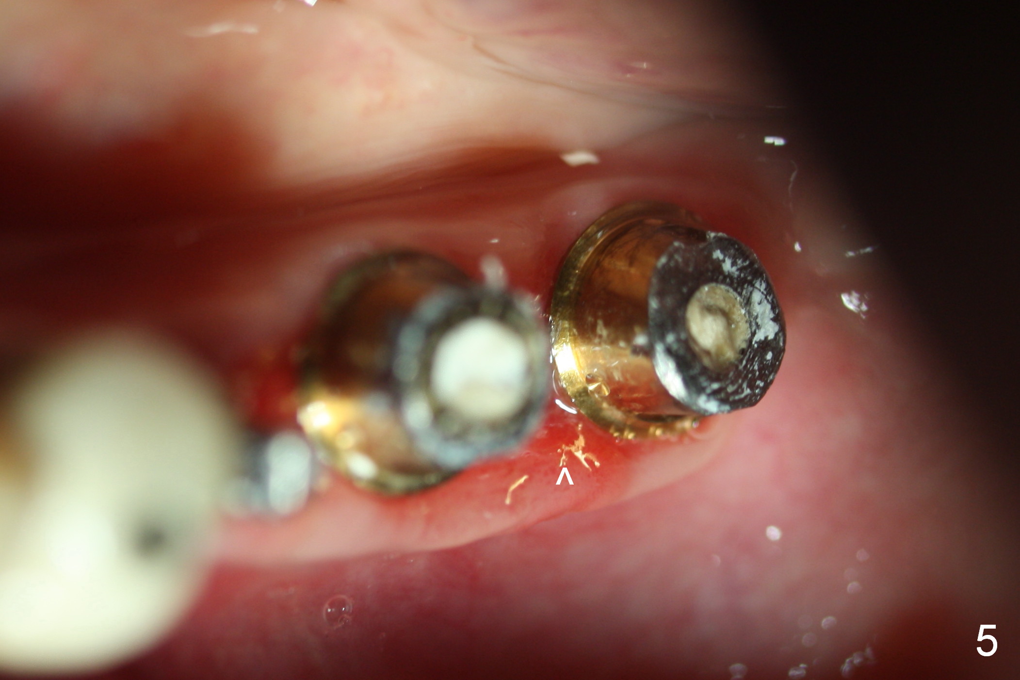 A 3x11 mm 1 piece implant is placed at the site of #20 with insertion torque > 60 Ncm (Fig.3). When a 4.1x10 and 4.5x12 mm drills are being used at the sites of the #18 and 19, respectively, the buccal and lingual crestal bone starts to be perforated ~ 2 mm apicocoronally.