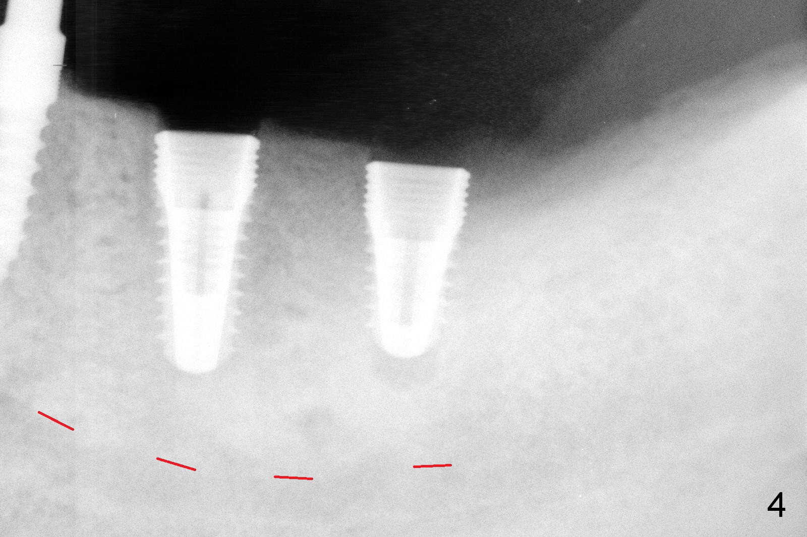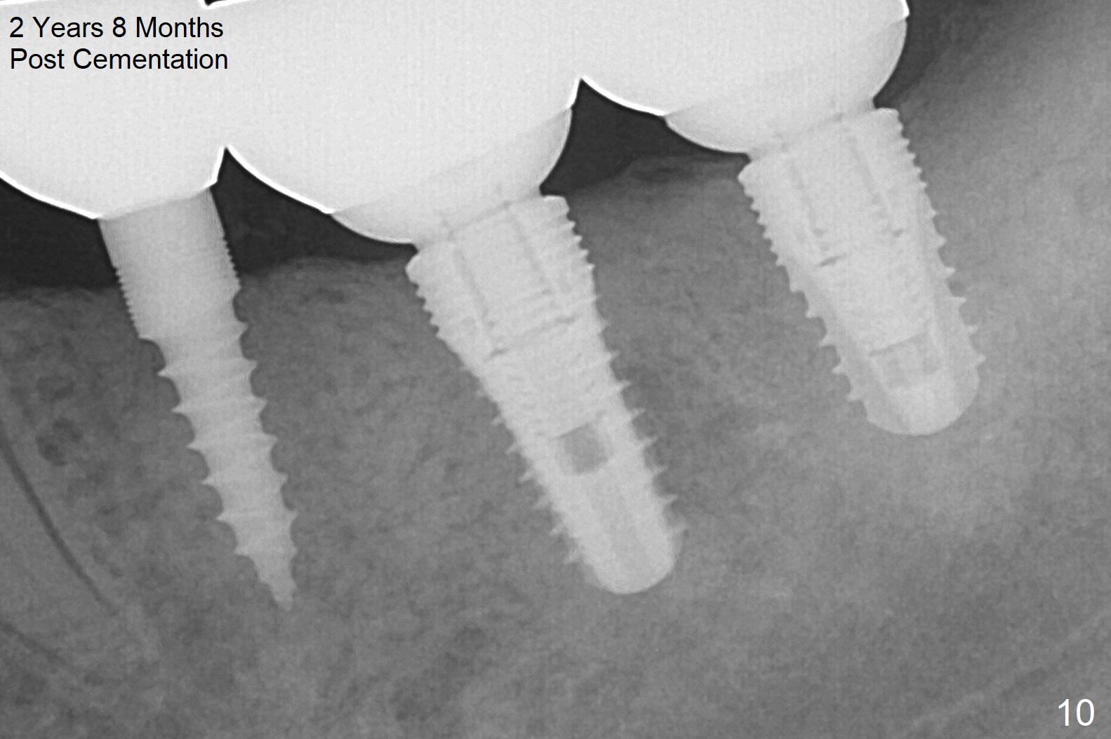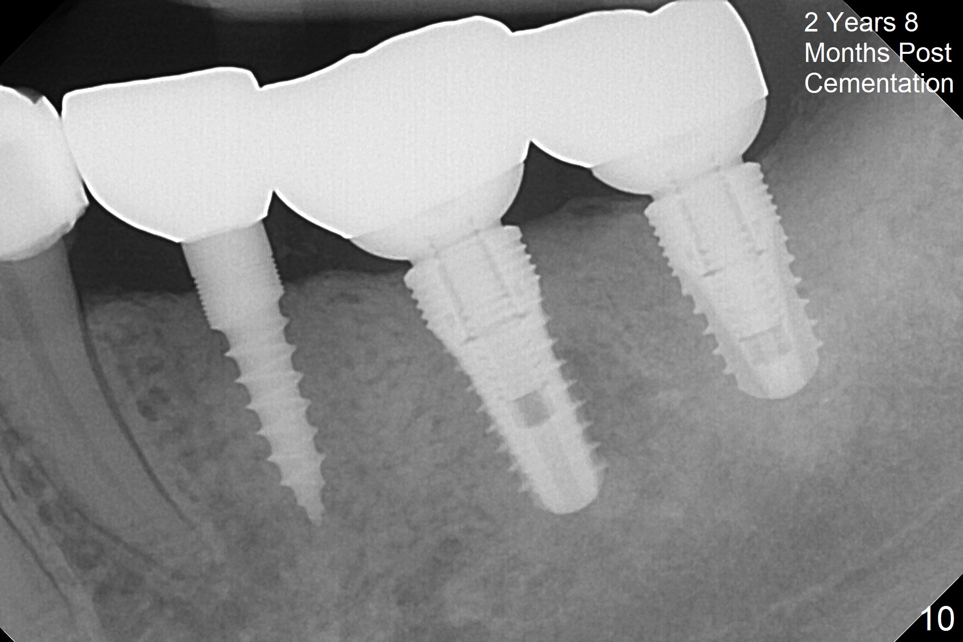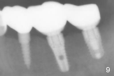 The patient is doing well postop, but 1 month postop, she complains of pain in the left submandibular area. When the immediate provisional is removed, the gingiva between the implants is erythematous (Fig.5 ^). The provisional is modified with accentuated grooves between the margins of the implants (Fig.6 *) with oral hygiene instruction. In fact the provisional is not cemented so that it is easy for self cleansing. There is crestal bone resorption 3 months postop (Fig.7,8). No further bone loss 1 year post cementation (Fig.9, cropped from pan). The bone density around the implants increases 2 years 8 months post cementation (Fig.10).
