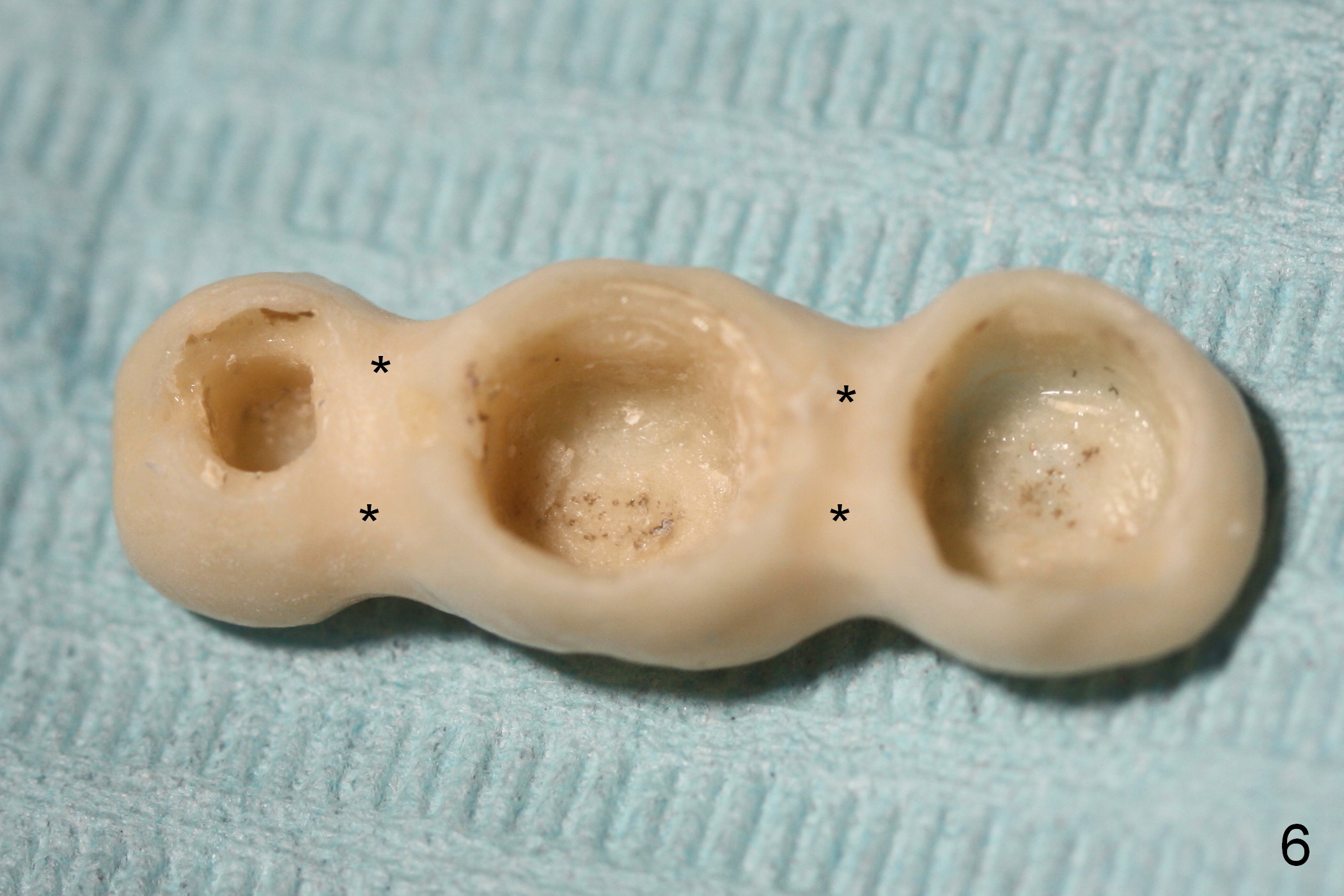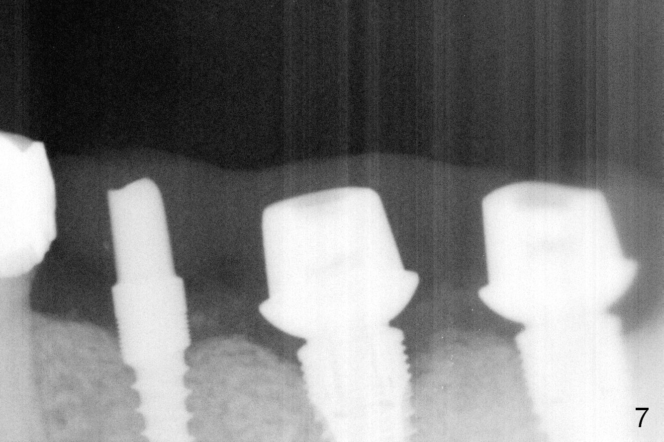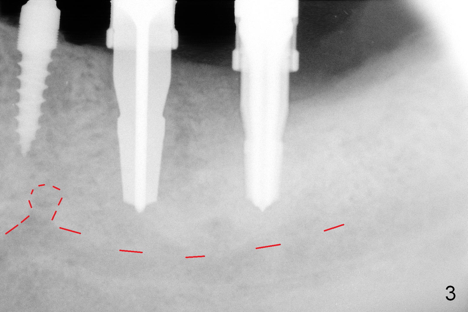 The patient is doing well postop, but 1 month postop, she complains of pain in the left submandibular area. When the immediate provisional is removed, the gingiva between the implants is erythematous (Fig.5 ^). The provisional is modified with accentuated grooves between the margins of the implants (Fig.6 *) with oral hygiene instruction. In fact the provisional is not cemented so that it is easy for self cleansing. There is crestal bone resorption 3 months postop (Fig.7,8). No further bone loss 1 year post cementation (Fig.9, cropped from pan). The bone density around the implants increases 2 years 8 months post cementation (Fig.10).