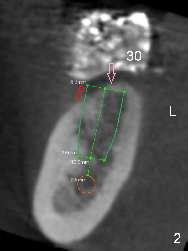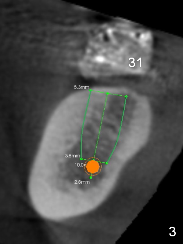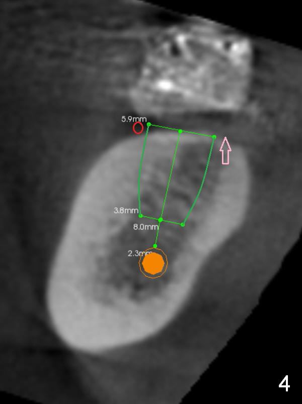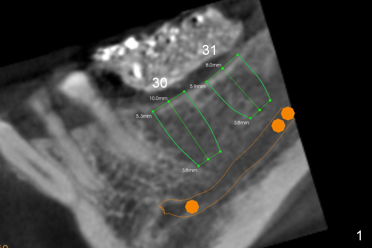 The lower right ridge is not as narrow as the lower left one, but the length of osteotomy should be controlled tightly. Fig.1 is a sagittal section, while Fig.2-4 are coronal sections at the sites of #30 and 31. It appears that the length of the implants at sites of #30 and 31 should be 10 and 8 mm, respectively.