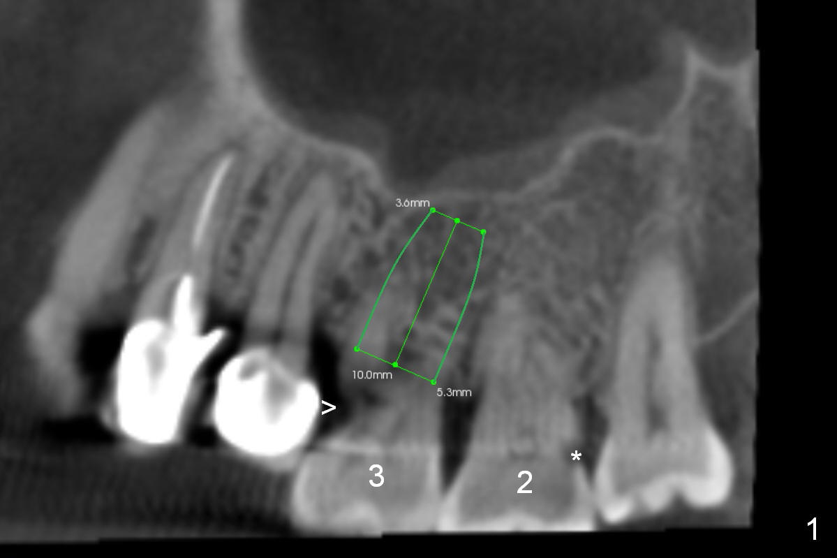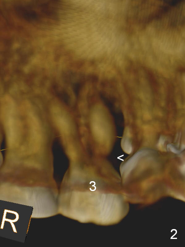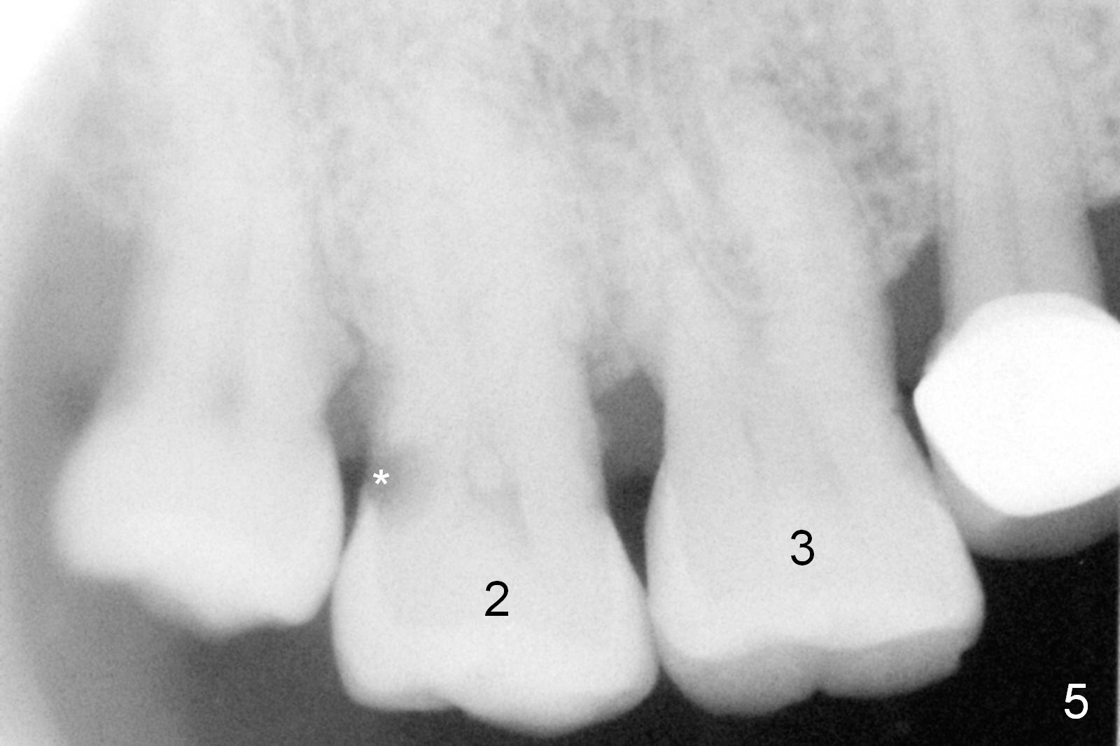 Re-examination clinically and radiologically reveals that there is no caries involving the tooth #3 (Fig.5). It appears that CBCT may have artifact. Treatment planning for intrusion should be modified. Mini-implants will be employed after #2 DO composite. Prepare Anchor mini-implant kit, 2 of 10 mm and 1 of 8 mm mini-implants, anesthetics and #15 scalpel. Scaling & root planing will be performed.