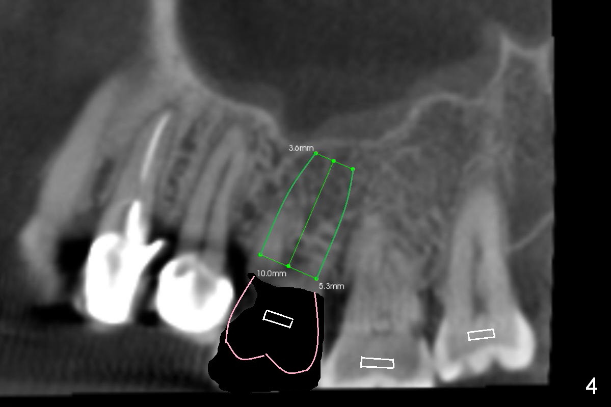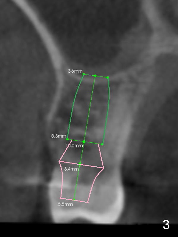 In addition to supraeruption of the teeth #2 and 3, the caries in the mesiobuccal root of #3 seems to be beyond salvation (Fig.1,2 arrowhead). When the implant at #3 is osteointegrated, a provisional restoration is placed (Fig.4 pink). Brackets (white boxes) are placed at differential levels among #1-3 to initiate regional orthodontic treatment using #3 as an anchorage. Mini-implants are placed if necessary. The tooth #1 is extracted after the limited ortho. Scaling & root planing will be done first.
