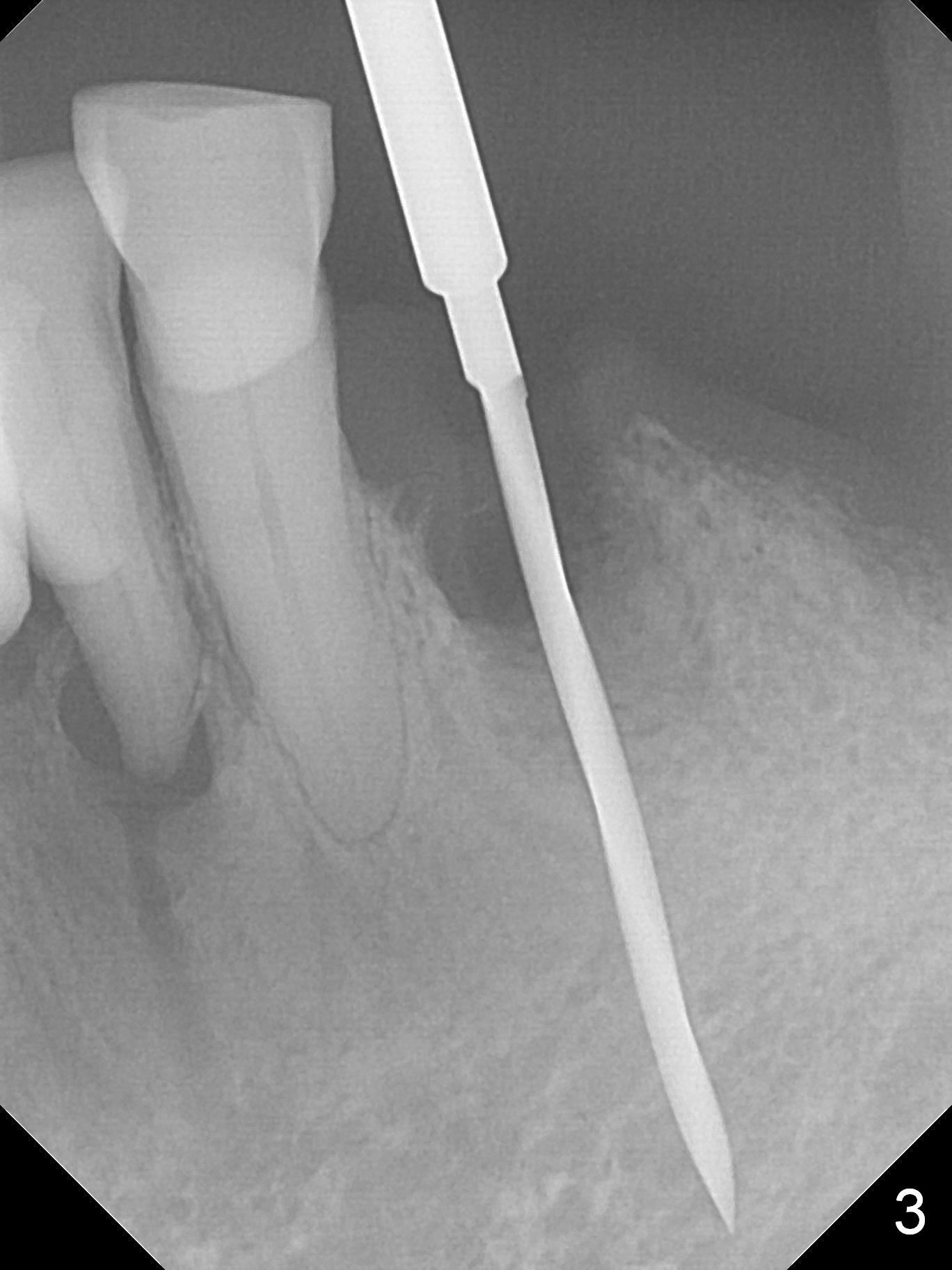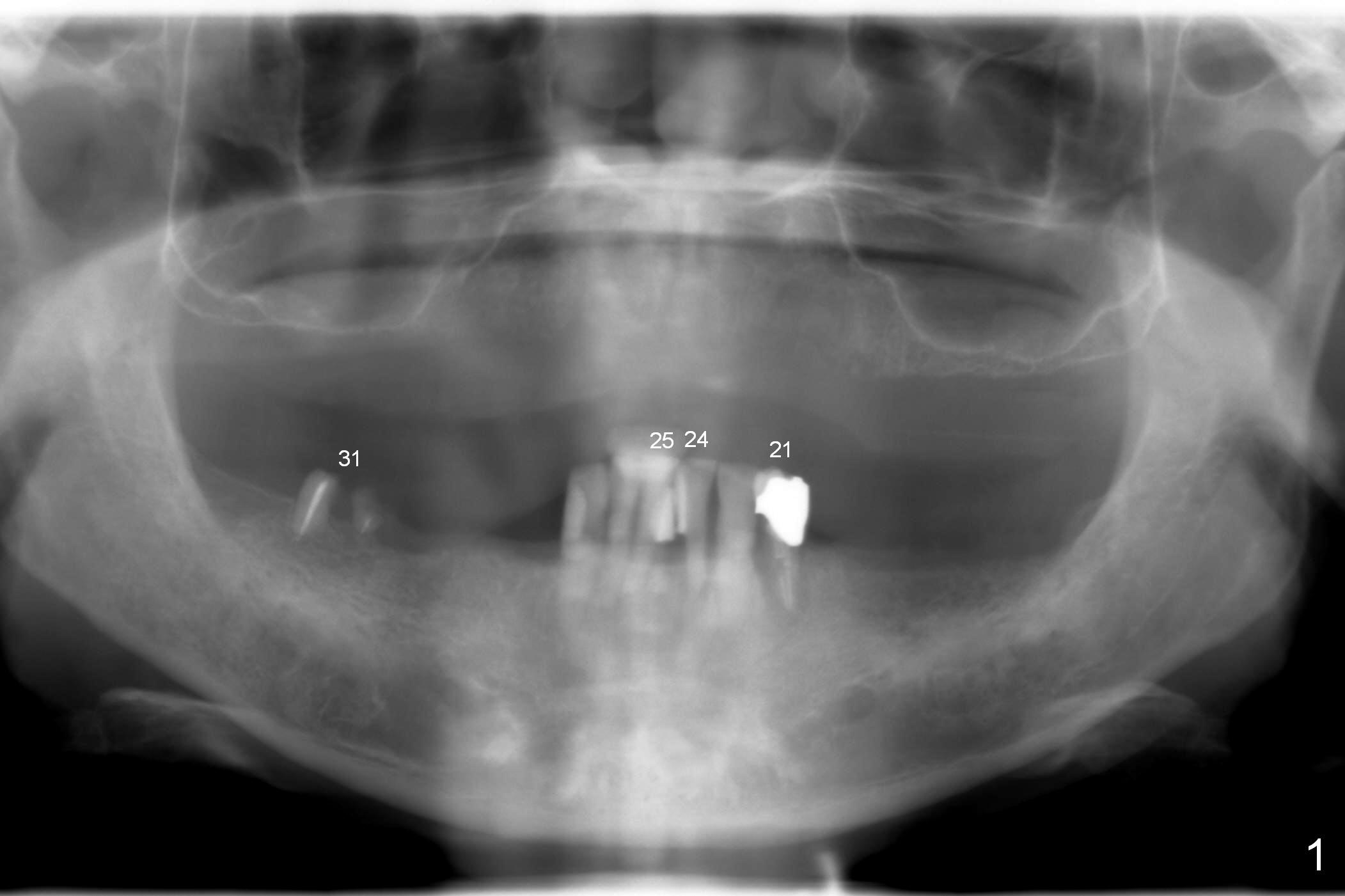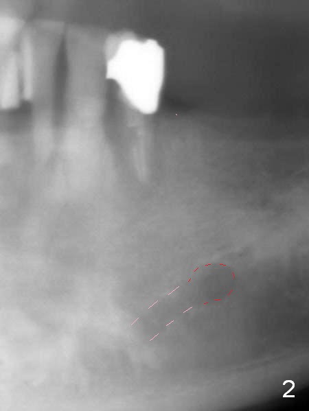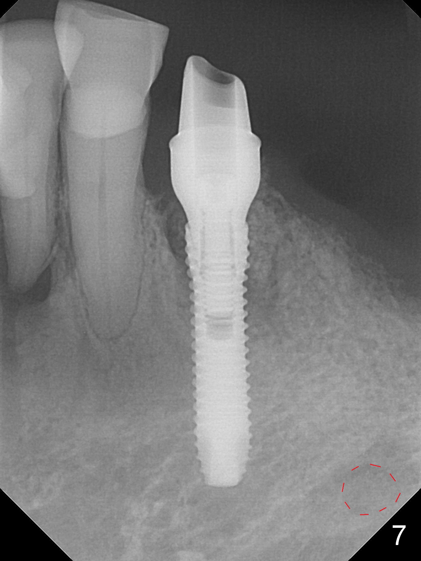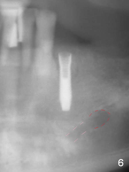 A 72-year-old man presents to clinic for implants because of pain associated with wearing the lower partial. The teeth #21, 24, 25 and 31 seem to be non-salvageable and are going to be replaced by implants so that the lower RPD can be reused (Fig.1). The edentulous ridge is atrophic (Fig.9 *). The upper complete denture appears to be functional. Since the tooth #21 is symptomatic (Fig.2) and the patient has chronic TMJ dislocation, the affected tooth is extracted first (Without antibiotic socket treatment) for immediate implant (Fig.3 (1.5 mm drill (placed more lingually)). The lower RPD is used as a surgical guide (Fig.4 (3 mm drill in place)). When a 3.8x16 mm implant is placed with bone graft (Fig.5 *), the underlying neurovascular bundle is undetected. A small field of panoramic X-ray is retaken; it seems that there is enough clearance from the Mental Foramen (Fig.2,6,7 (red dashed line)) and the Incisive Canal (pink dashed line). The implant is then placed 2 mm more apically (Fig.7) to reduce the chance of periimplantitis since the buccal plate is lost. A 5.5x5(5) mm abutment is placed (Fig.5) with more graft. The access of the abutment is left open so that a part of periodontal dressing is inserted for additional retention (Fig.8,9). The RPD is placed back for adaptation of the dressing. The patient is advised not to wear the RPD postop to reduce micromovement.