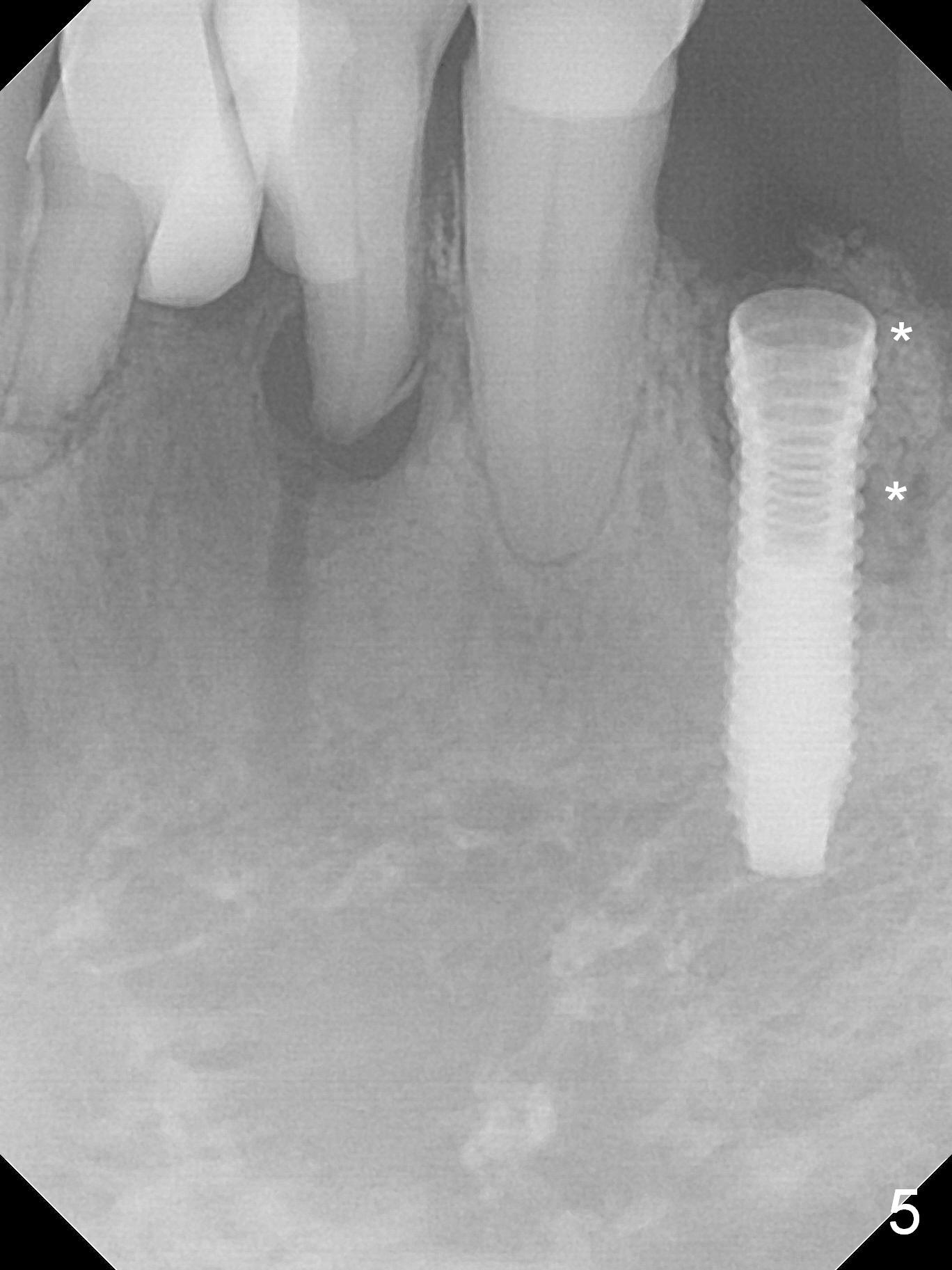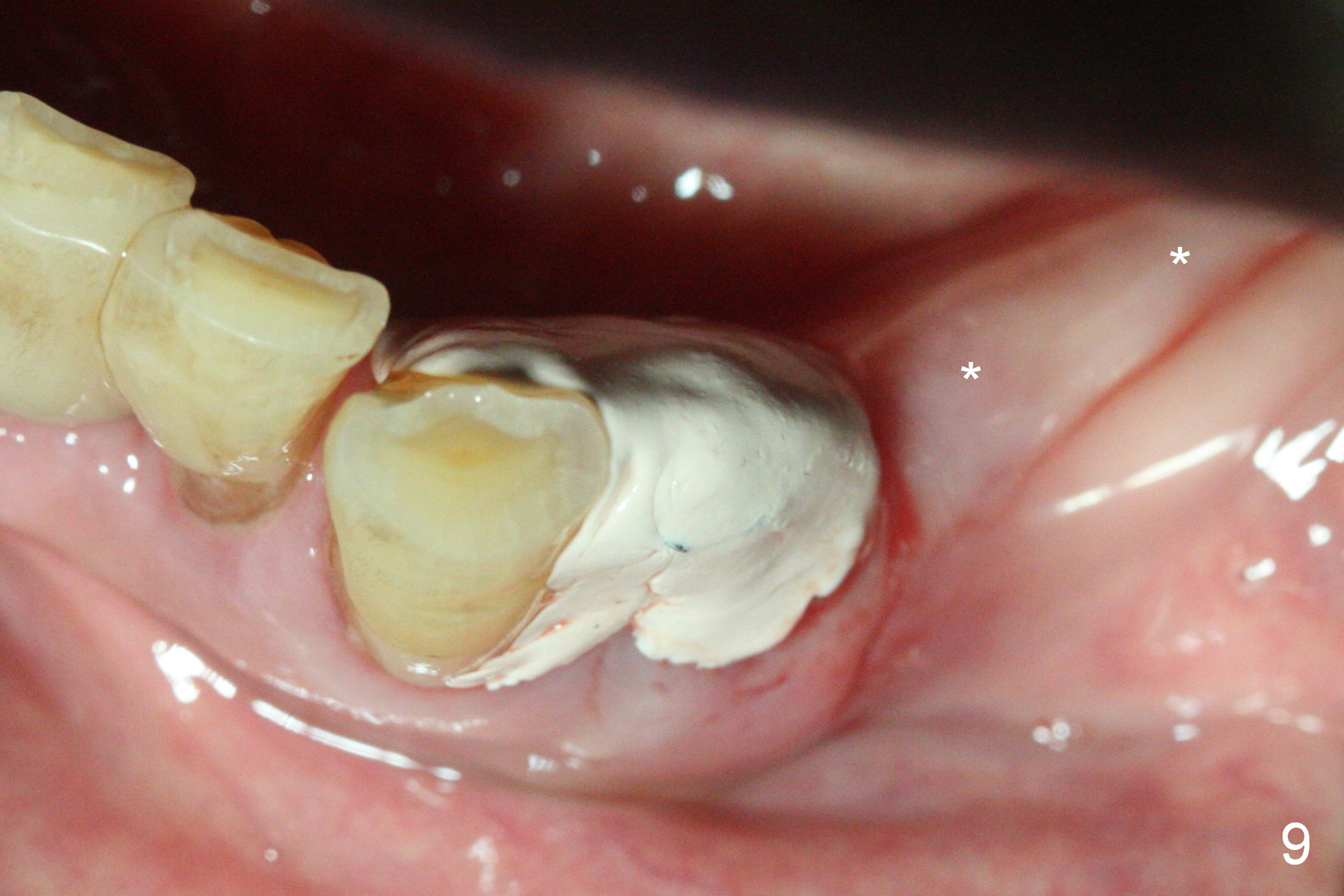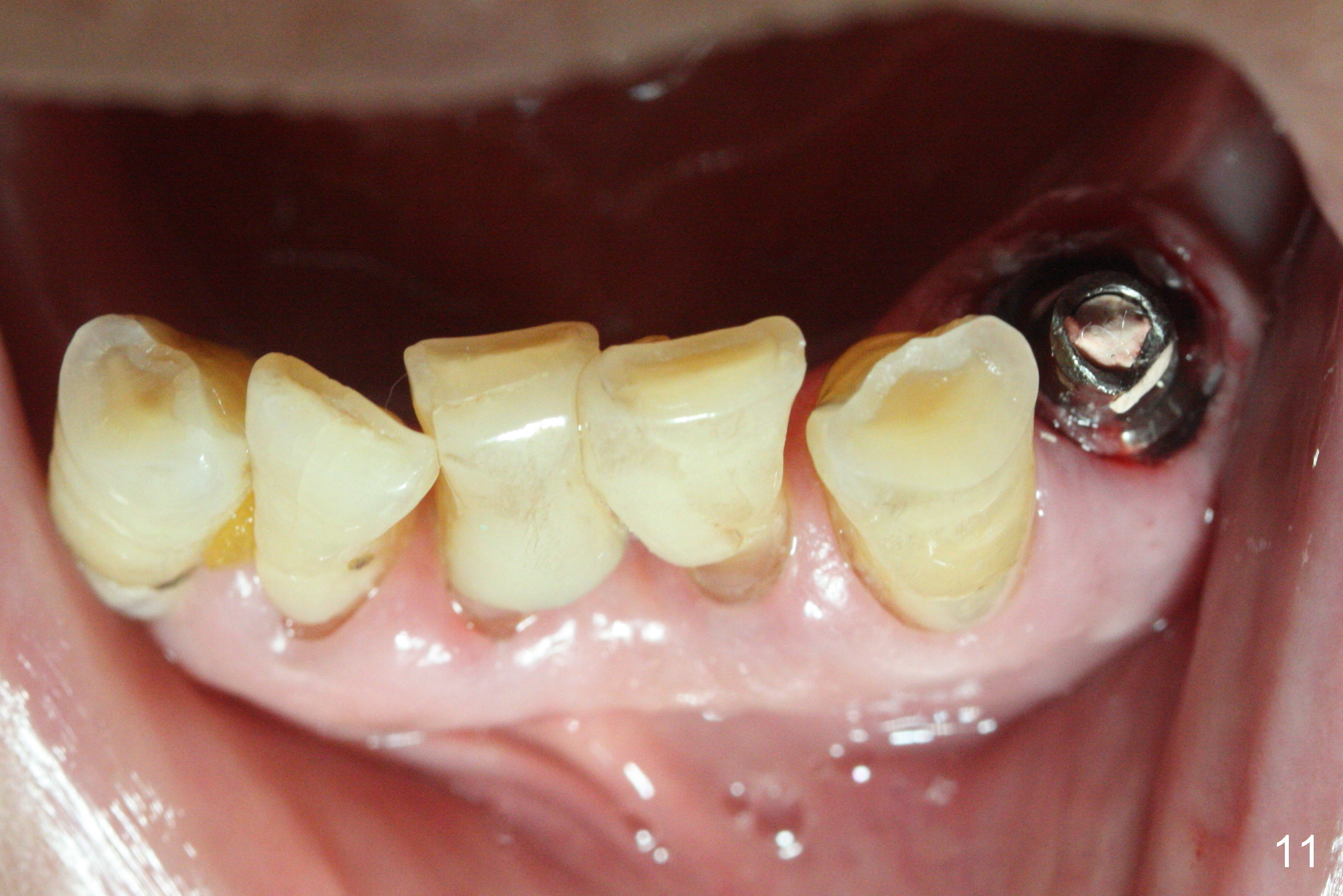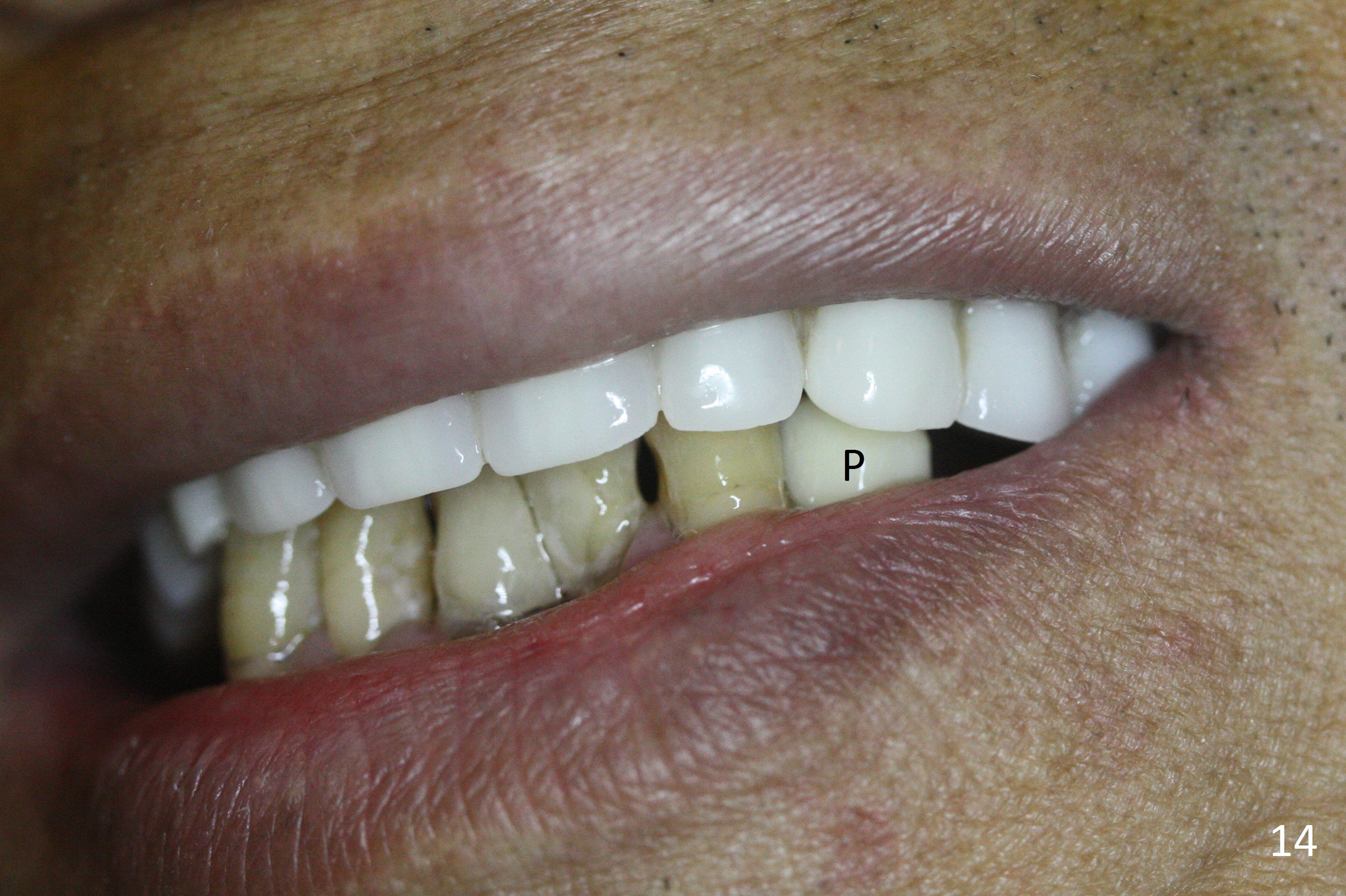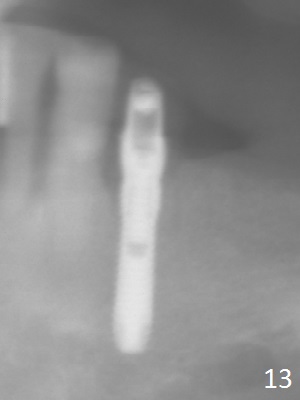 The patient returns 2 days postop because of hemorrhage (Fig.10,11 * after removal of loose periodontal dressing). Periodontal dressing is repacked (Fig.12). The hemorrhage may be due to incomplete removal of granulation tissue or invasion of the Incisive vessel intraoperatively, although there is no pain or paresthesia postop. Soft food is recommended without the upper complete denture. A provisional is fabricated (Fig.14 P) nearly 3 months postop (after changing the 5.5x5(5) mm abutment to 4.5x5(4) mm, Fig.13) when an implant is being place is #31.