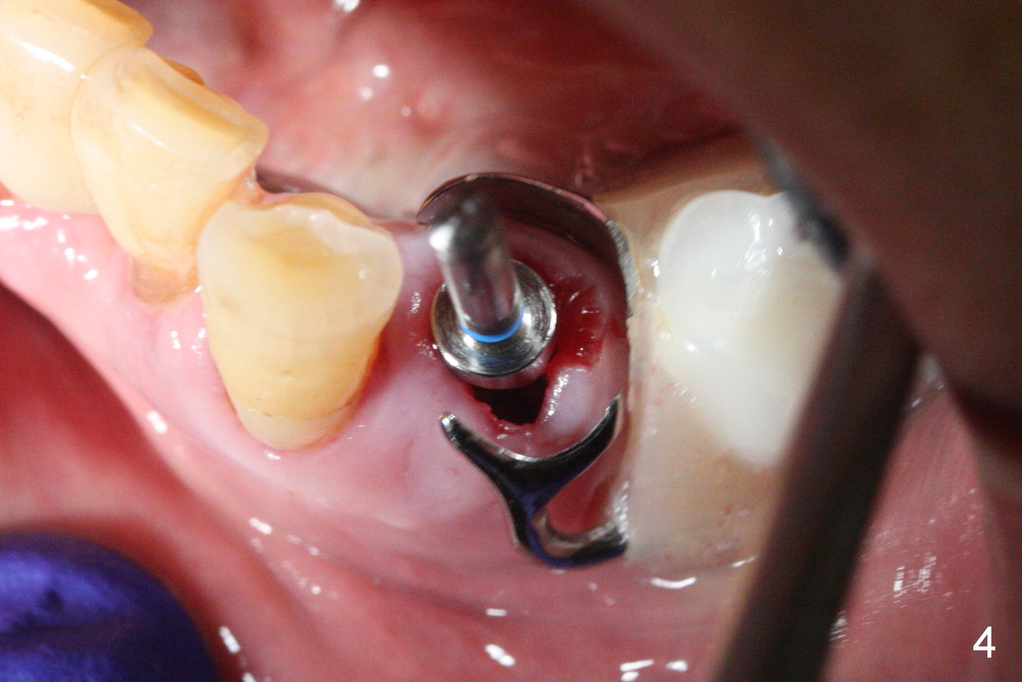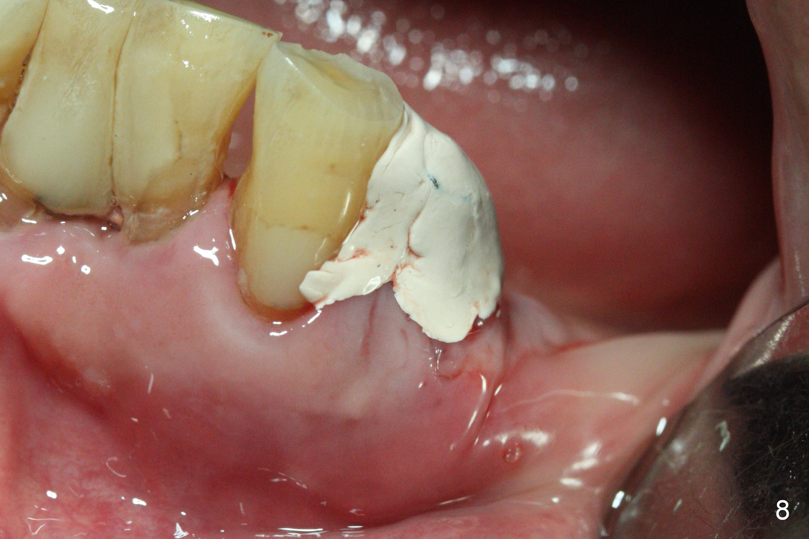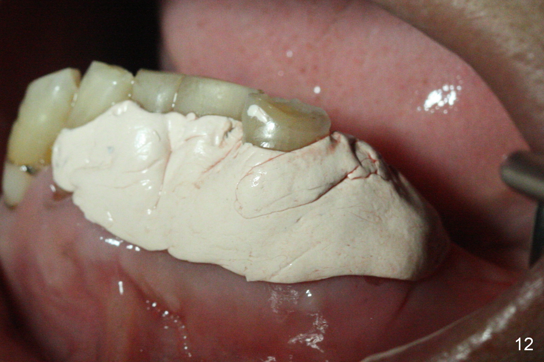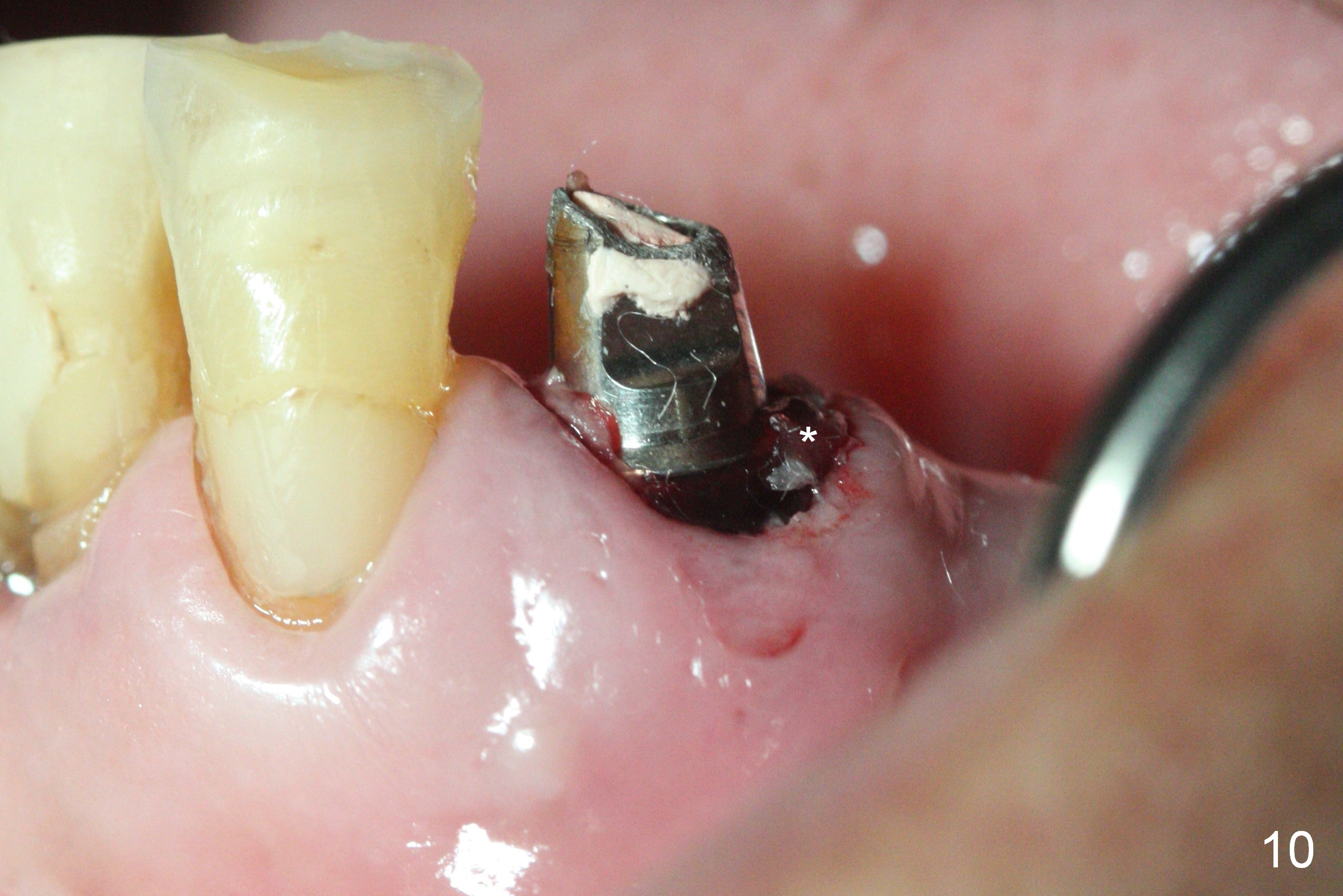 The patient returns 2 days postop because of hemorrhage (Fig.10,11 * after removal of loose periodontal dressing). Periodontal dressing is repacked (Fig.12). The hemorrhage may be due to incomplete removal of granulation tissue or invasion of the Incisive vessel intraoperatively, although there is no pain or paresthesia postop. Soft food is recommended without the upper complete denture. A provisional is fabricated (Fig.14 P) nearly 3 months postop (after changing the 5.5x5(5) mm abutment to 4.5x5(4) mm, Fig.13) when an implant is being place is #31.