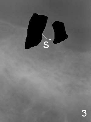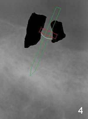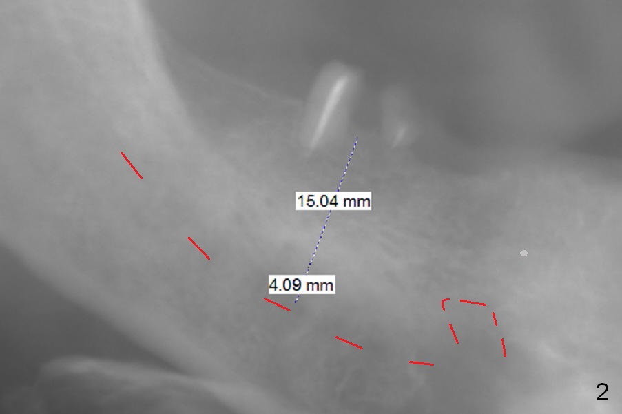 A 72-year-old man will return for #31 immediate implant several months after that at #21 (Fig.1,2). After extraction (no Antibiotic), separation of the gingiva (Fig.1) from the septum (Fig.3 S (white curved line: the upper border of the septum)) and use of starter drill, place the 13 mm stopper (Fig.4 red) in the 2 mm initial drill (green) against the septal top as a reliable landmark for osteotomy.