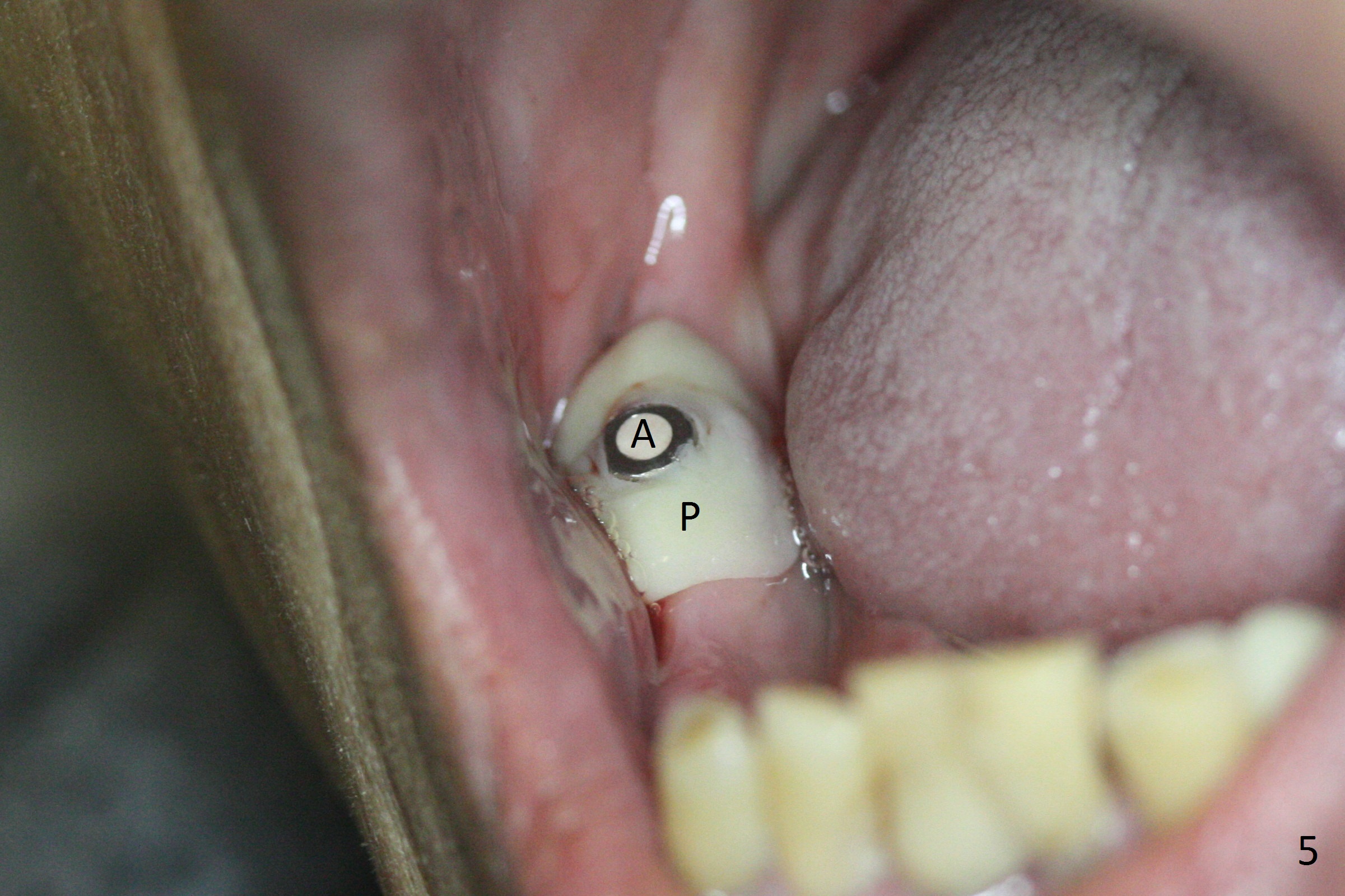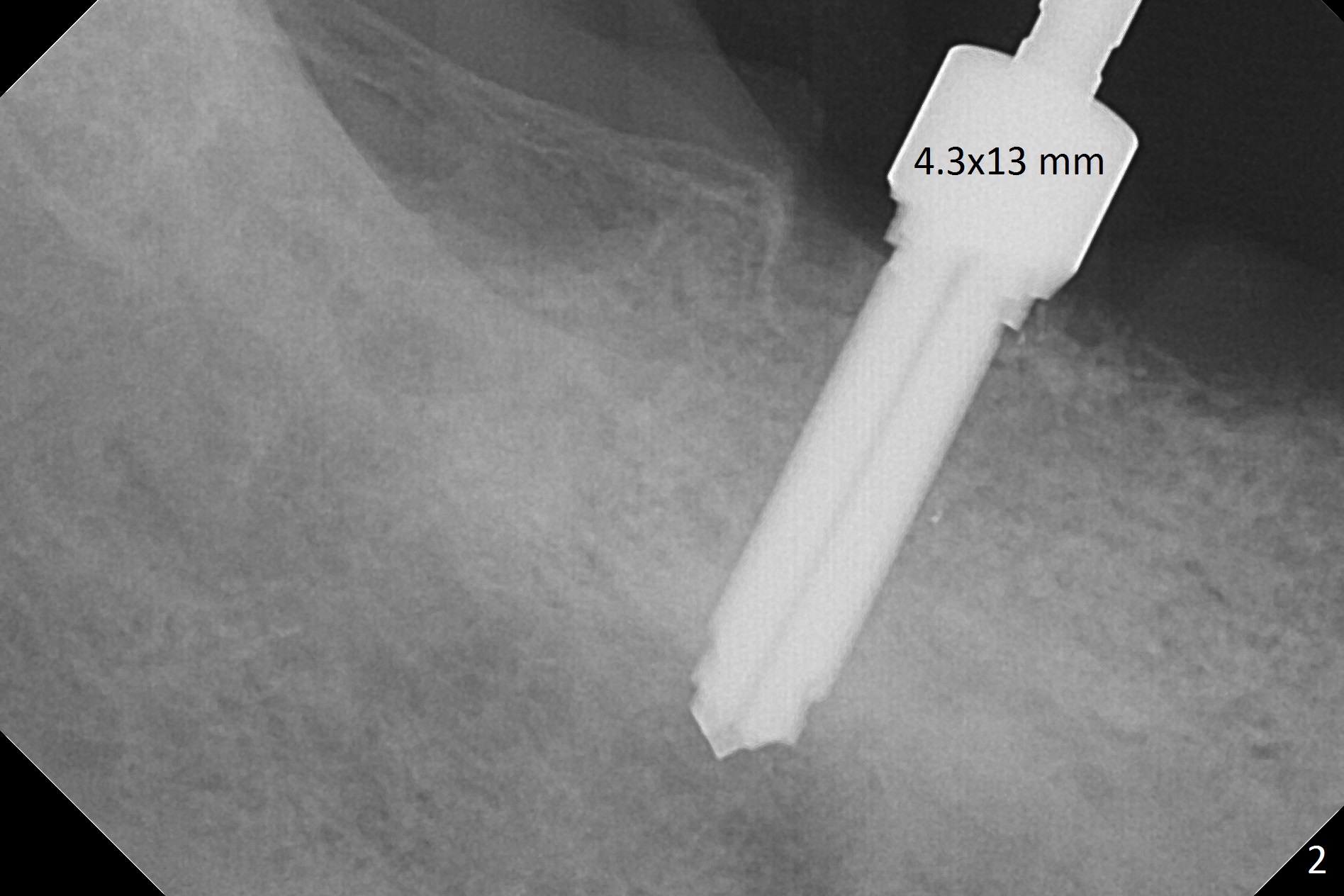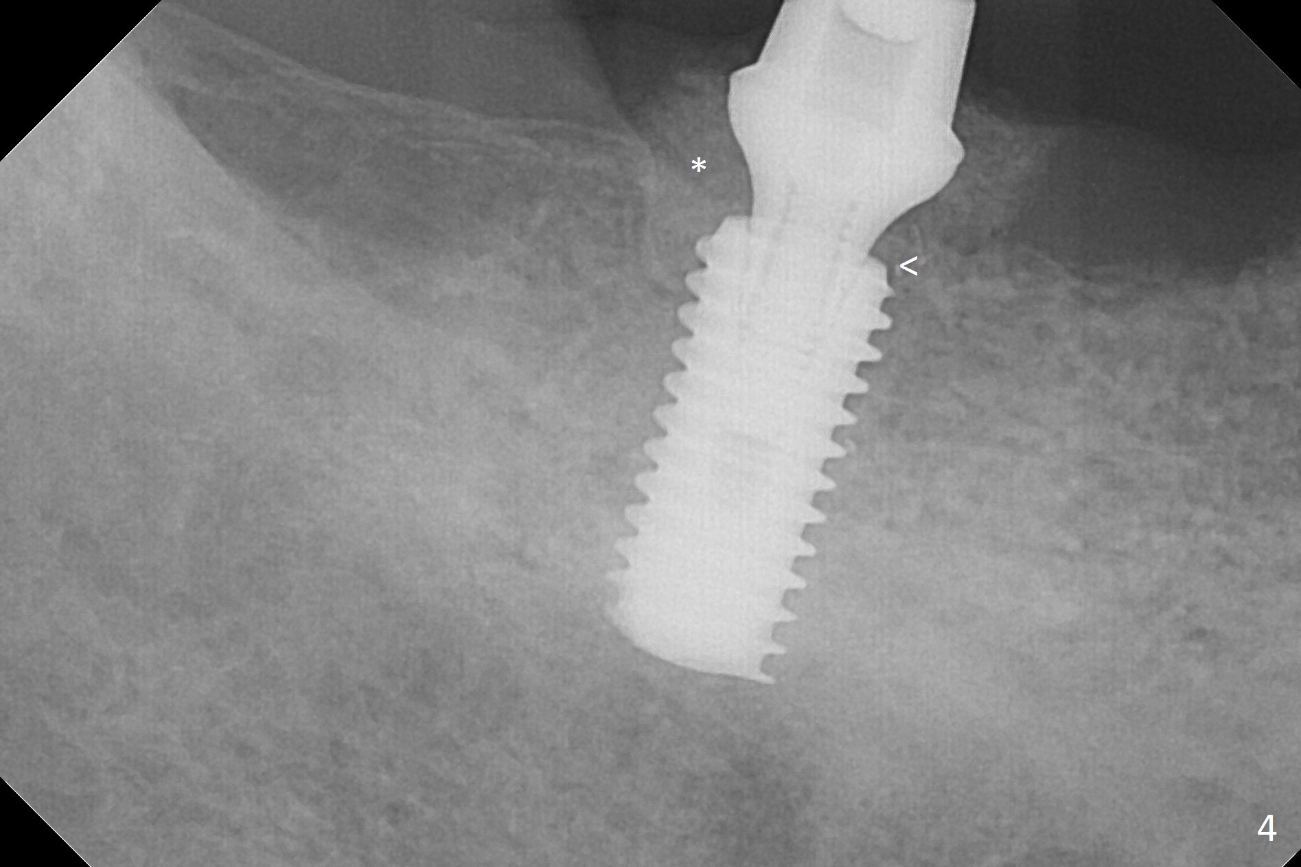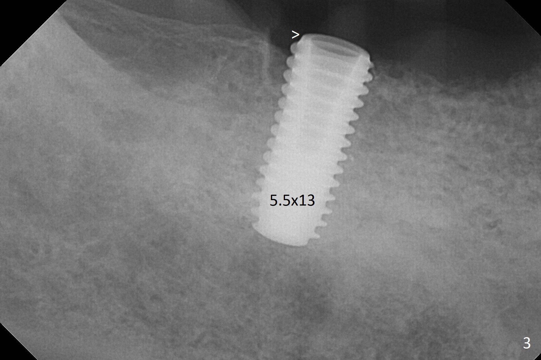 There are 2 challenges associated with #31 implant placement: indistinct Inferior Alveolar Canal (Fig.1-4) and difficulty in fabrication of a provisional (Fig.5). After placing a 5.5x13 mm implant (Fig.3 supracrestal (<)), it is removed for apical resection for ~ 2 mm; when it is reseated, it is subcrestal (Fig.5 <). A simplified temporary provisional (Fig.5 P) is fabricated around a 6.5x4(4) mm abutment (A) without adapting the lower RPD. The patient is advised not to wear the latter. When the socket heals, there will be 2 options: no provisional or a new one. The latter should have good retention to the abutment and no contact with the lower RPD in and out.