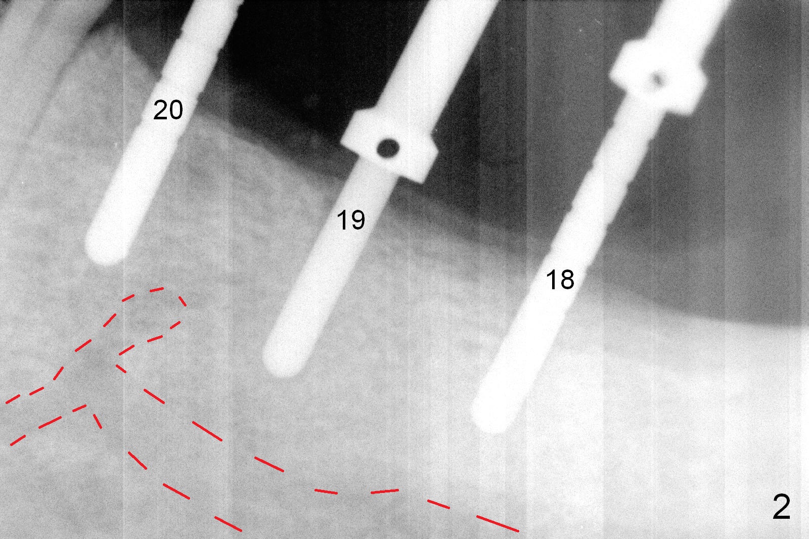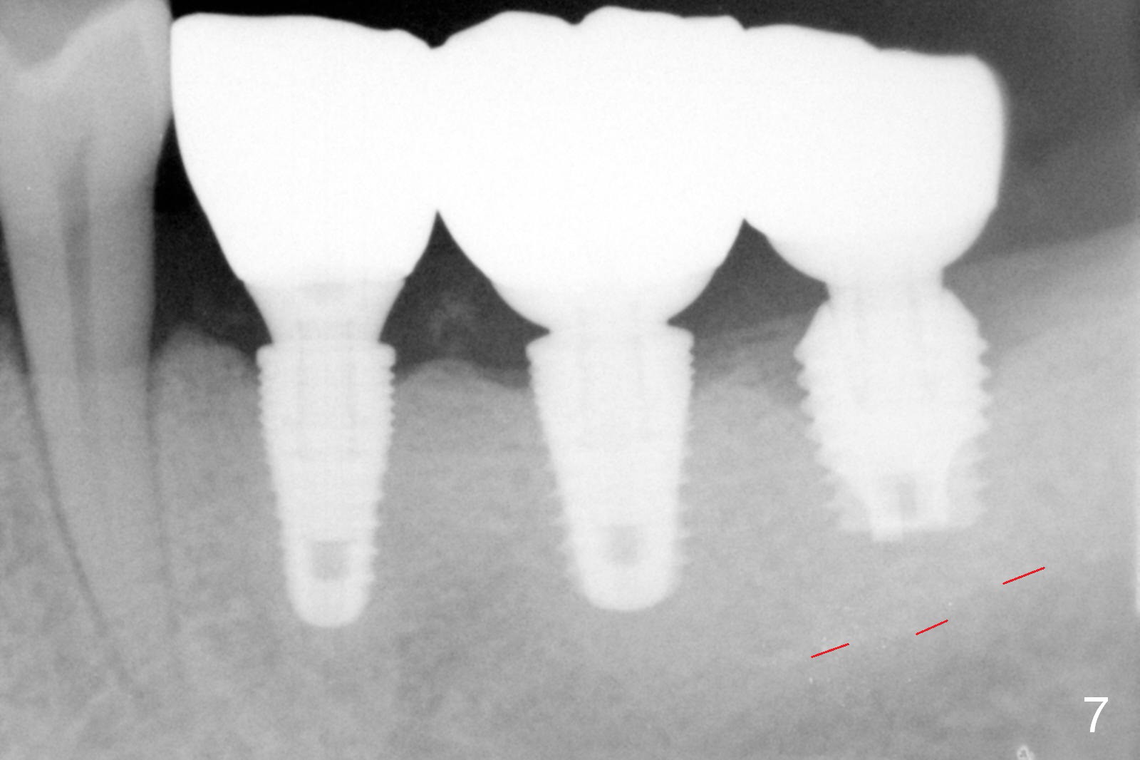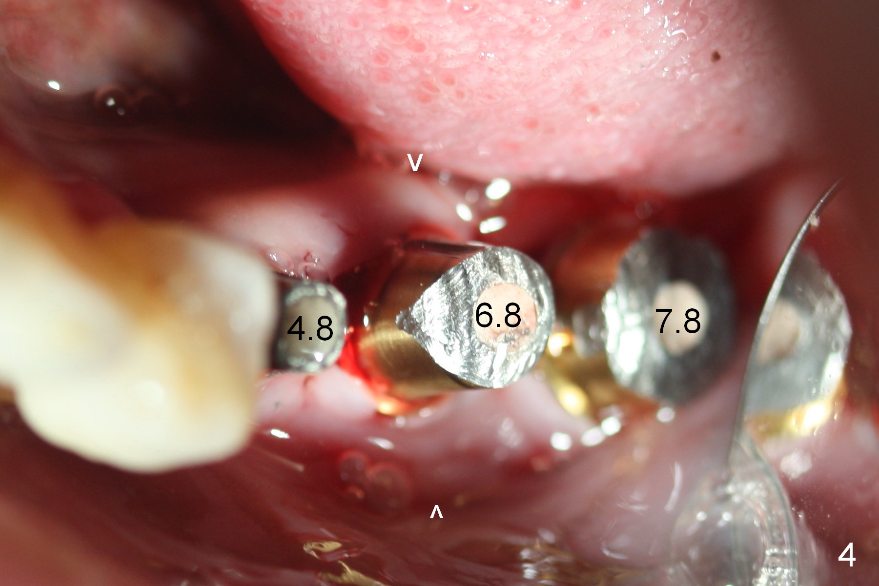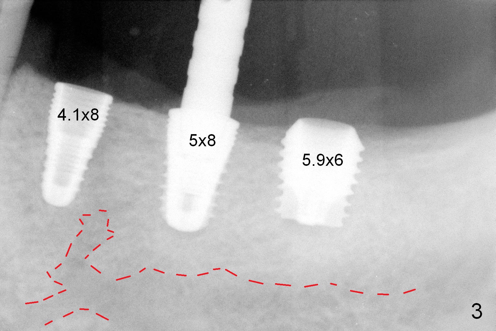 Although bone height is limited, the crest of the lower left area appears to be wide (Fig.1 arrowheads). Initial osteotomy depth is 6 mm (at #18) and 8 mm (19,20) with sufficient clearance from the Inferior Alveolar Canal (Fig.2 red dashed line). The size of the implants at the sites of #18-20 is shown in Fig.3 in millimeters. The insertion torque is around 50 Ncm. When abutments are immediately placed (the diameter and size shown in mm in Fig.4,5) and autogenous bone is packed around the implants/abutments, the ridge looks particularly wide (arrowheads). A splinted immediate provisional is fabricated.