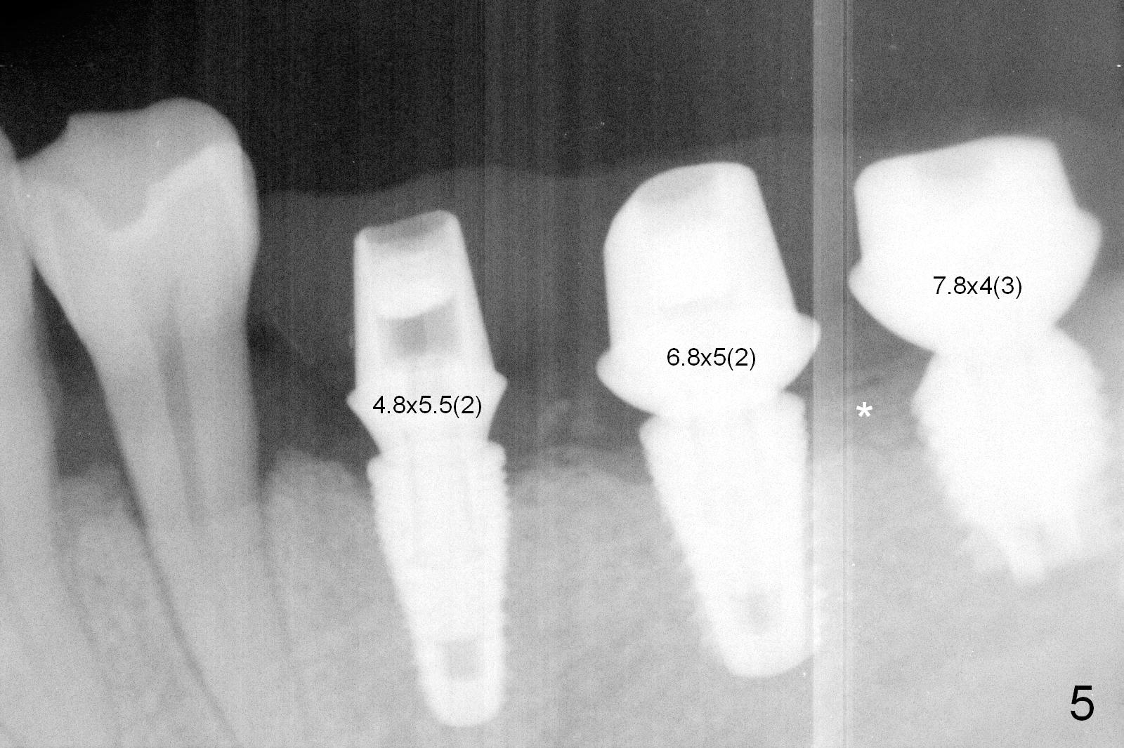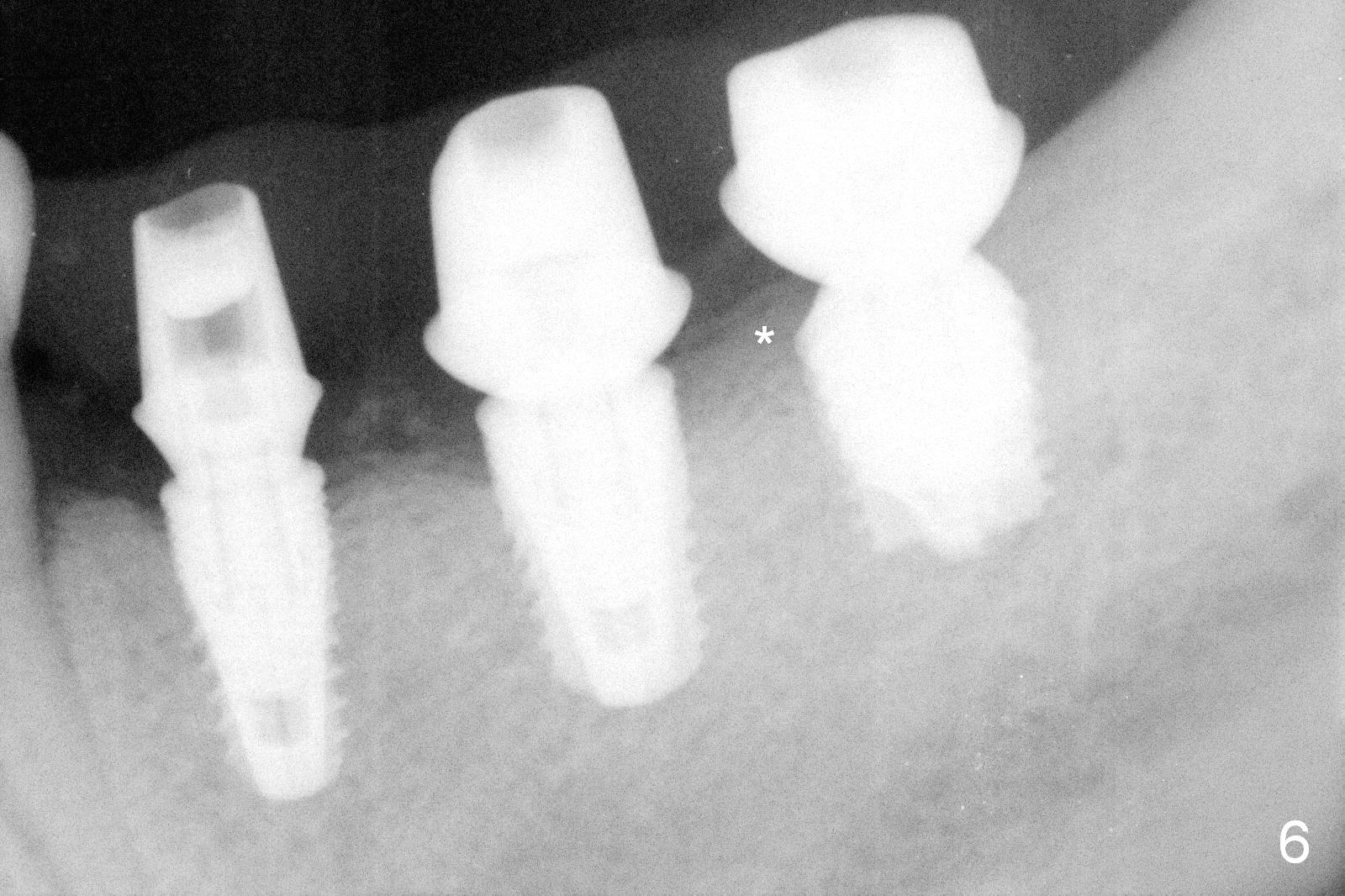 The patient returns for final restoration 4 months postop. He is a smoker with poor oral hygiene. The provisional is fractured at #19 (distobuccal). There is a gap mesial to #18 abutment. It appears that there is mild bone loss, particularly mesial to the implant at #18 (Fig.5,6 *). The implants should have been placed deeper to prevent periimplantitis. When the abutment at #18 (7.8x4(3) mm) is removed, there is food debris mesial, although the gingiva remains healthy. A smaller abutment with shorter cuff is placed (6.8x4(2) mm) before impression.