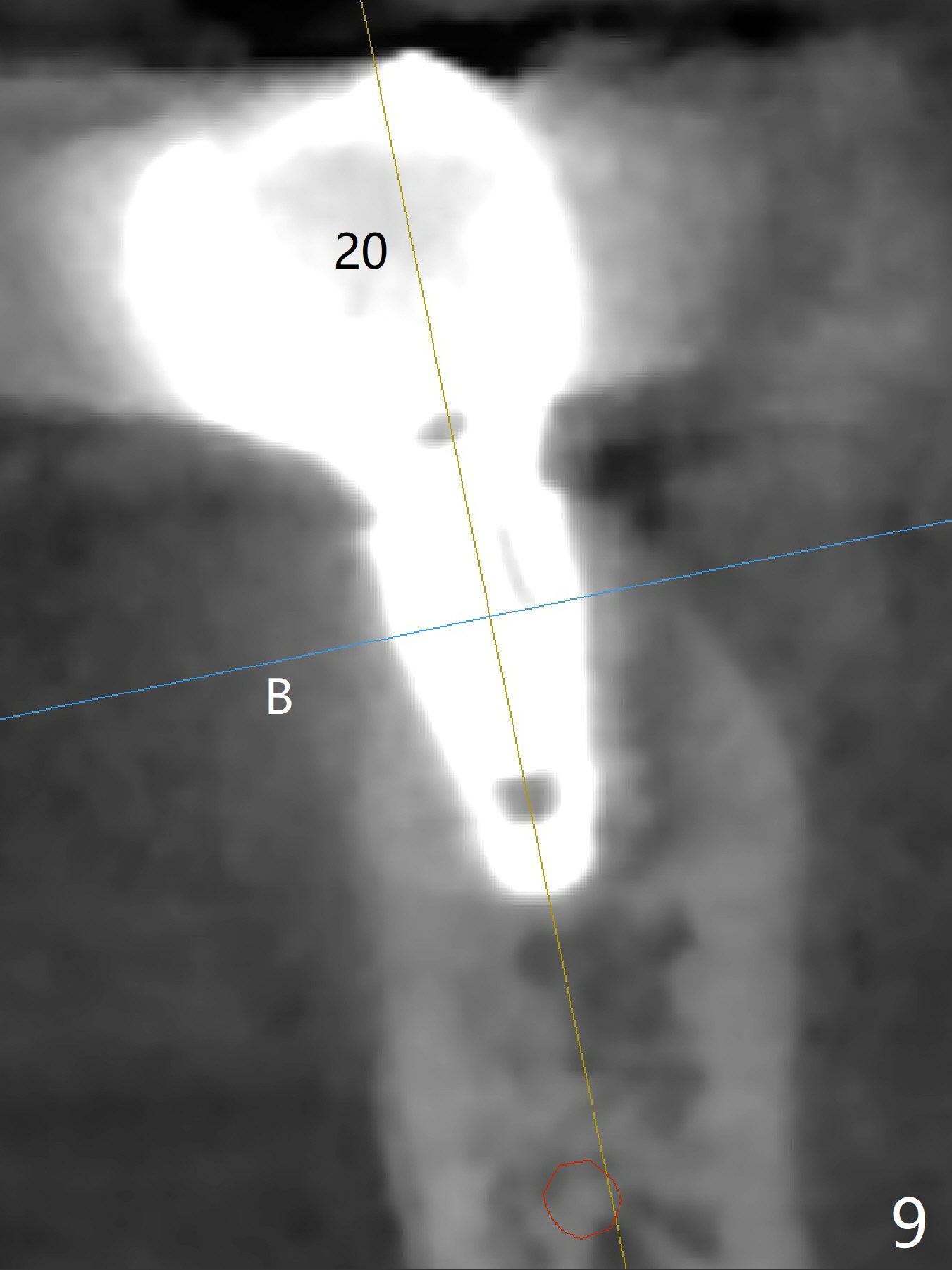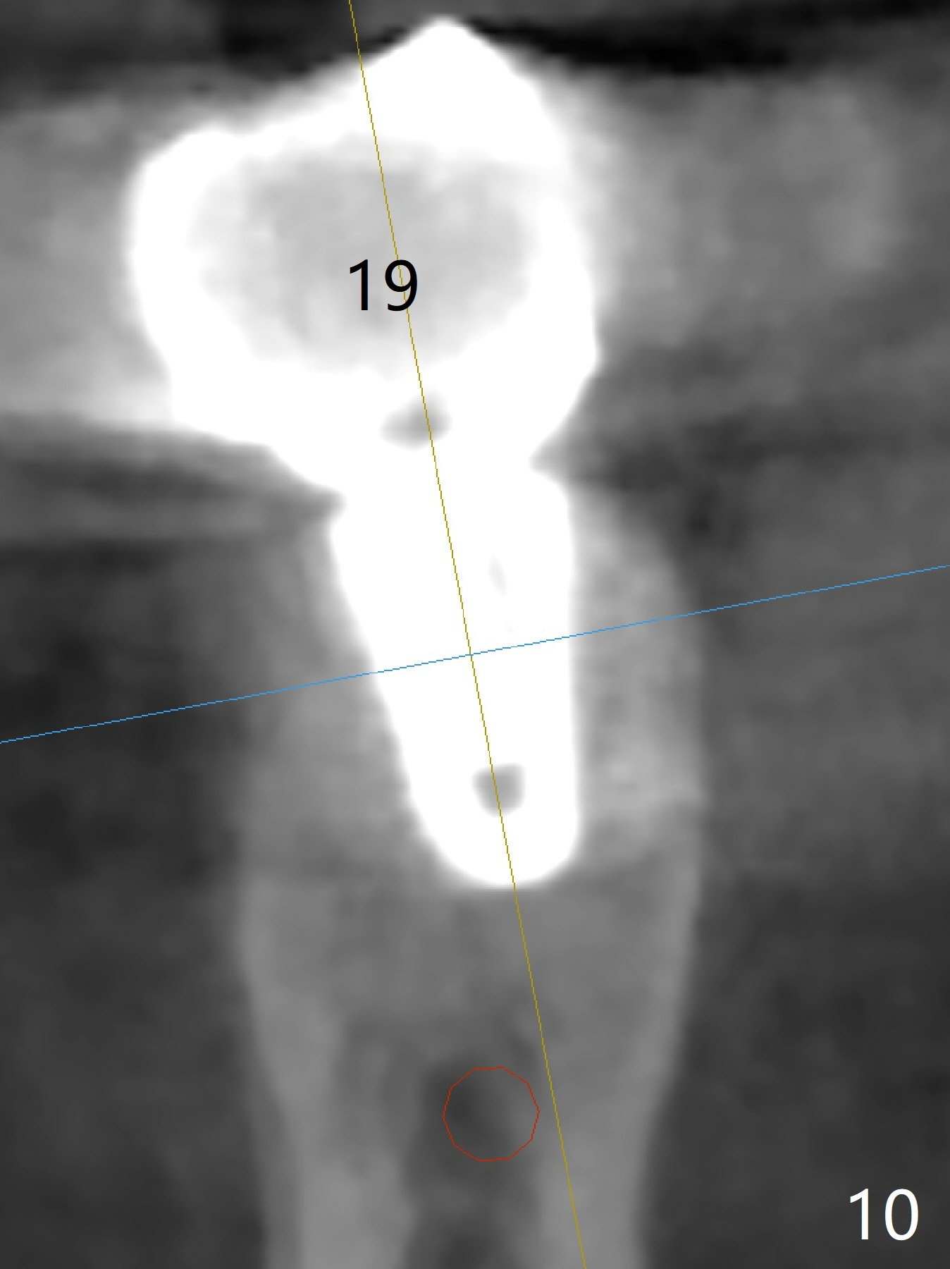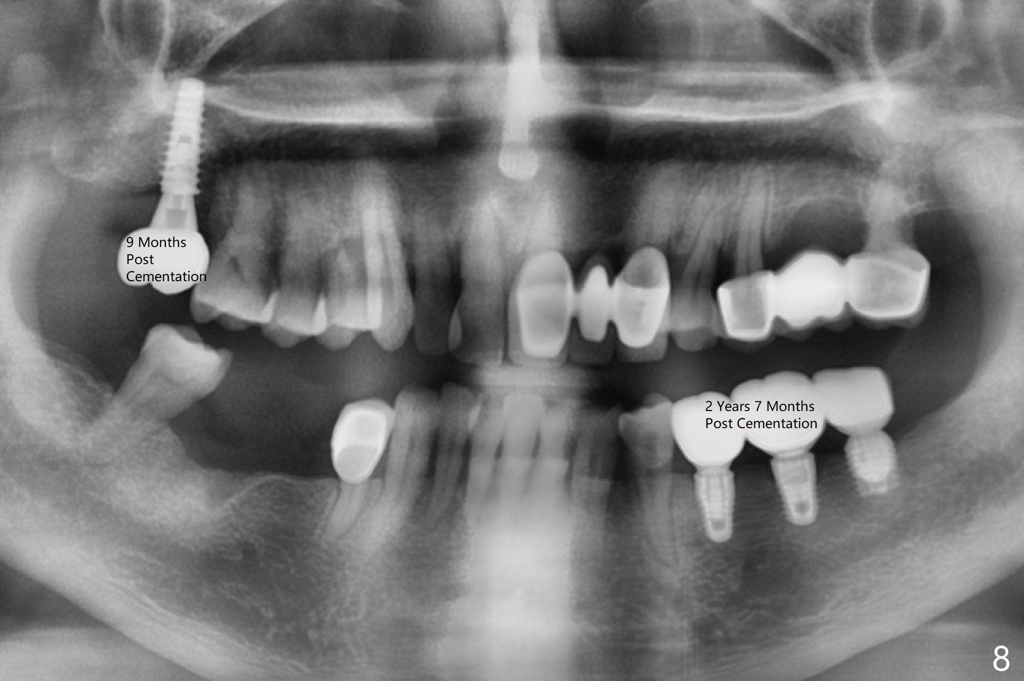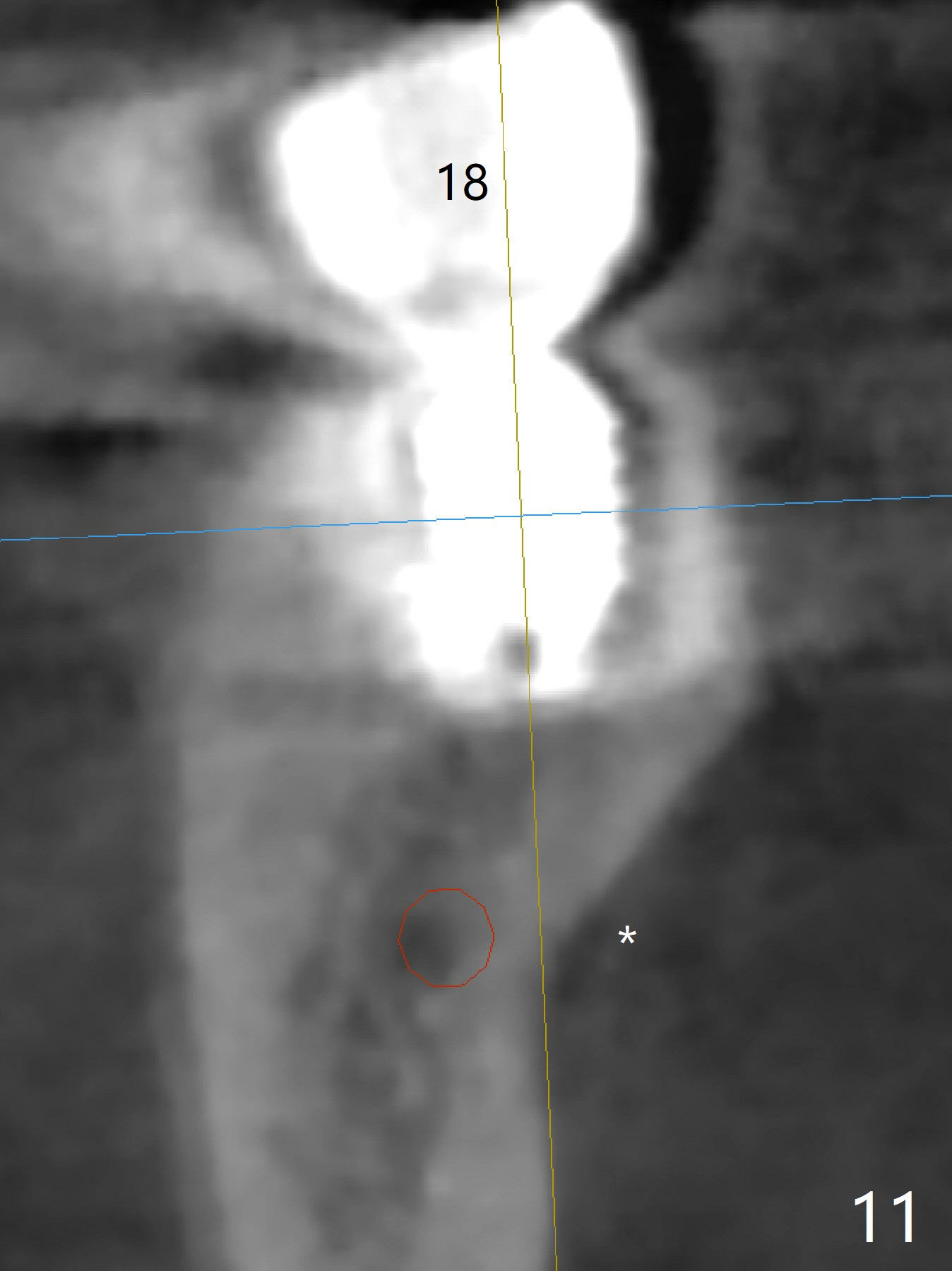 Five months post cementation, the patient returns because of loose abutment screw at #18. Bone resorption is noted (Fig.7 arrowheads). His oral hygiene is fair. He refuses implant at #2, saying that he dares not to chew on the left. When the screw became loose again 3 months later, he accepted the treatment. While he was returning to his home country, the lower right bridge was sectioned and the tooth #30 was removed. He is thinking of 2 implants at #29 and 30 (Fig.8). Bone loss appears not to get worse at #18-20 (Fig.9-11 (CBCT coronal sections, 2 years 7 months post cementation)). The implant at #19 is loose with a gap between the implant and the bone 3 years 5 months post cementation (Fig.12 *). SM implant does not last under stress (bruxism) and rigid implant/abutment connection.