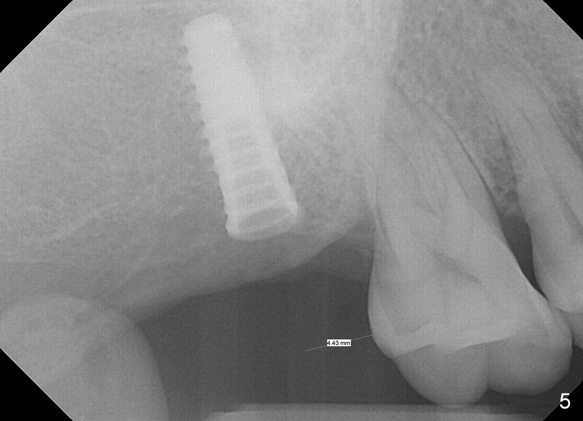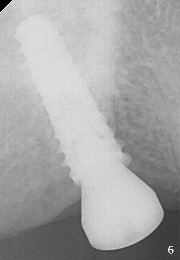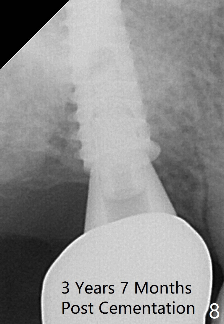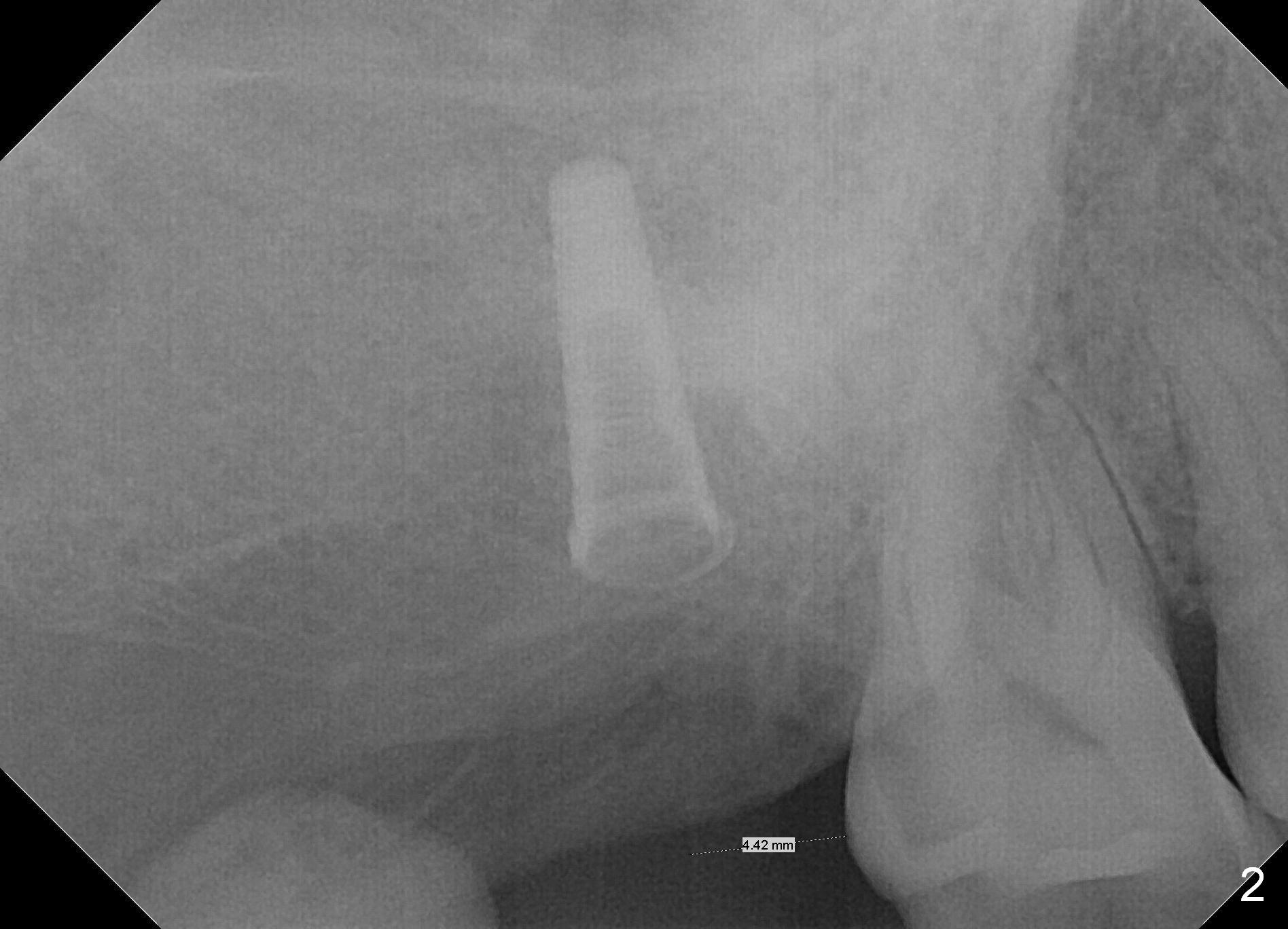 The edentulous ridge at the site of #2 is wide. Magic split is used to gain access, test bone density and start osteotomy for 9 mm (gingival level). A 1.6 mm drill is used to extend the osteotomy for depth of 13 mm. The osteotomy position and trajectory is confirmed with a parallel pin (Fig.1), which is ideal. The remaining osteotomy is finished with Magic Expanders from 3 to 4.3 mm for 15 mm. The trajectory is confirmed again with insertion of a 4.5x11 mm dummy implant at the depth of 15 mm (Fig.2). When a definitive IBS implant (5x13 mm) is placed with insertion torque >45 Ncm, the distal coronal end is not subcrestal (Fig.3-5). As the implant is placed deeper, it started to lose primary stability. When a pair abutment is placed, it keeps turning. Finally a healing abutment (6x3 mm) is placed unstable. In brief, taking several X-ray films help control osteotomy and implant position and trajectory. The implant is unstable 7 months postop (Fig.6). With local anesthesia, the implant is placed deeper by 1 mm with apparent increase in torque and a 6x4 healing abutment placed. The implant is stable 11 months postop. With 5.5x4(4) mm abutment placed, impression is taken. PA and BW will be taken after cementation of the crown. There is no bone loss 9 months post cementation (Fig.7). Return to Upper Molar Immediate Implant, 18-20, 29,30 Xin Wei, DDS, PhD, MS 1st edition 01/09/2017, last revision 08/15/2021