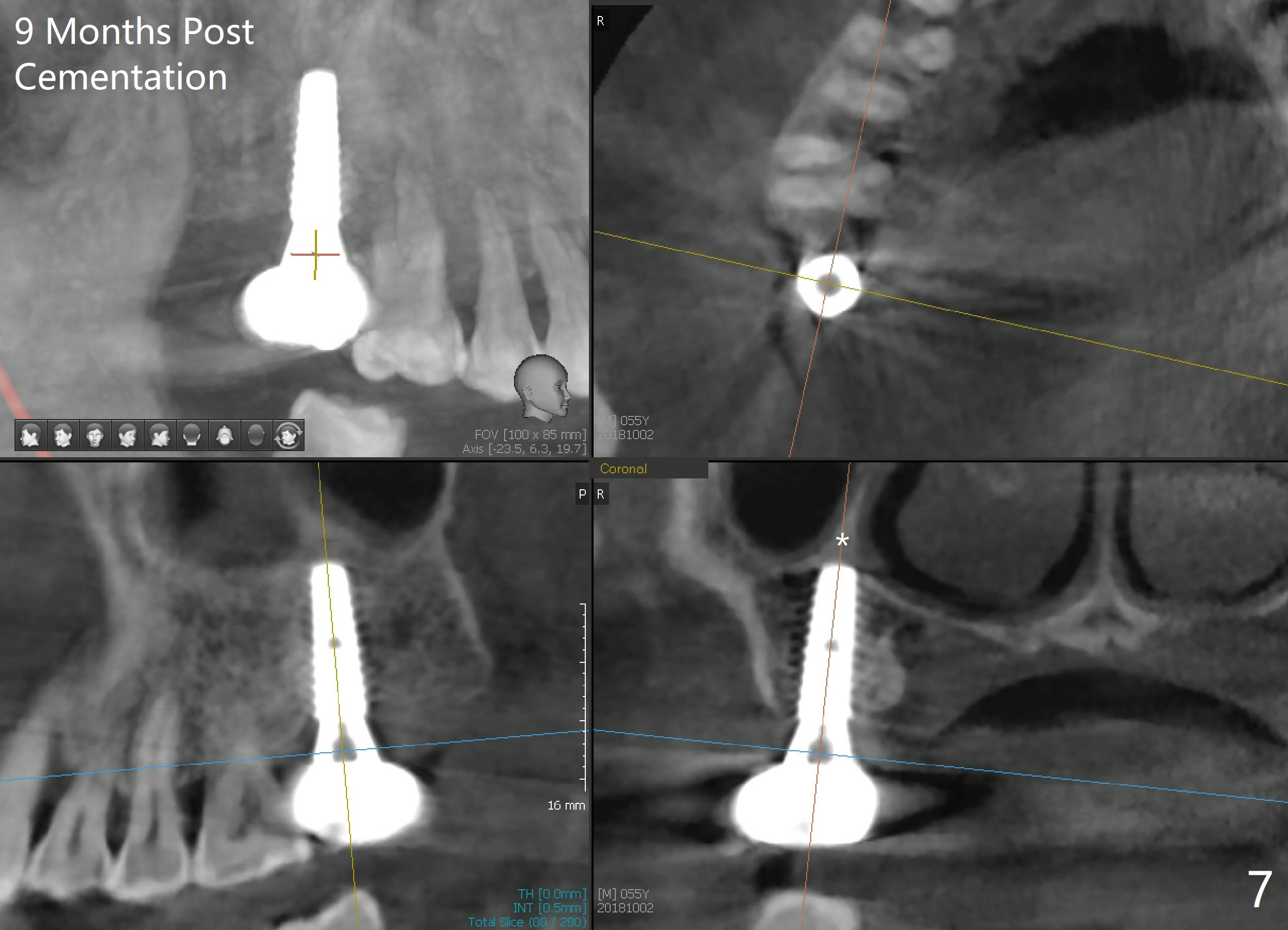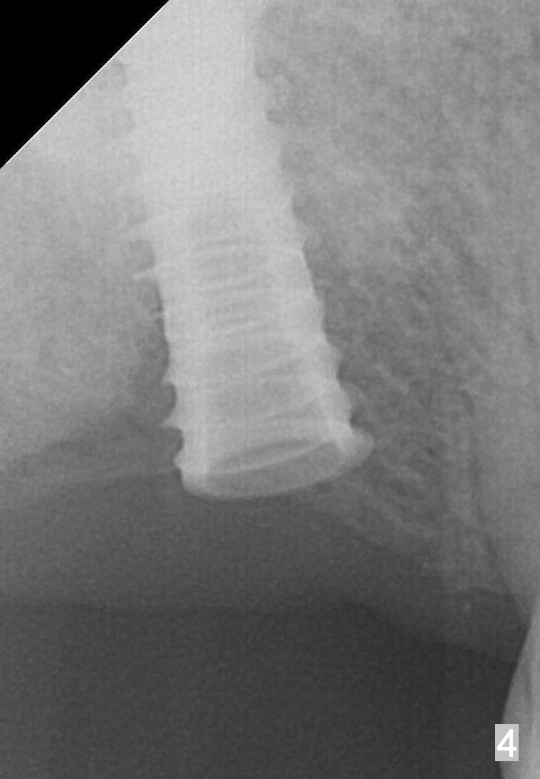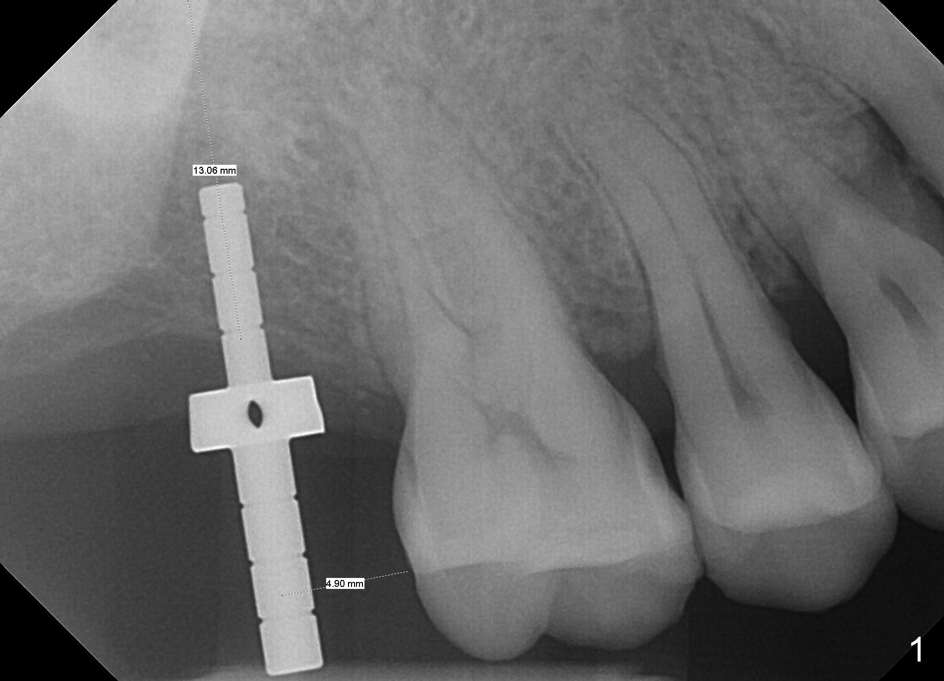 The edentulous ridge at the site of #2 is wide. Magic split is used to gain access, test bone density and start osteotomy for 9 mm (gingival level). A 1.6 mm drill is used to extend the osteotomy for depth of 13 mm. The osteotomy position and trajectory is confirmed with a parallel pin (Fig.1), which is ideal. The remaining osteotomy is finished with Magic Expanders from 3 to 4.3 mm for 15 mm. The trajectory is confirmed again with insertion of a 4.5x11 mm dummy implant at the depth of 15 mm (Fig.2). When a definitive IBS implant (5x13 mm) is placed with insertion torque >45 Ncm, the distal coronal end is not subcrestal (Fig.3-5). As the implant is placed deeper, it started to lose primary stability. When a pair abutment is placed, it keeps turning. Finally a healing abutment (6x3 mm) is placed unstable. In brief, taking several X-ray films help control osteotomy and implant position and trajectory. The implant is unstable 7 months postop (Fig.6). With local anesthesia, the implant is placed deeper by 1 mm with apparent increase in torque and a 6x4 healing abutment placed. The implant is stable 11 months postop. With 5.5x4(4) mm abutment placed, impression is taken. PA and BW will be taken after cementation of the crown. There is no bone loss 9 months post cementation (Fig.7). Return to Upper Molar Immediate Implant, 18-20, 29,30 Xin Wei, DDS, PhD, MS 1st edition 01/09/2017, last revision 08/15/2021