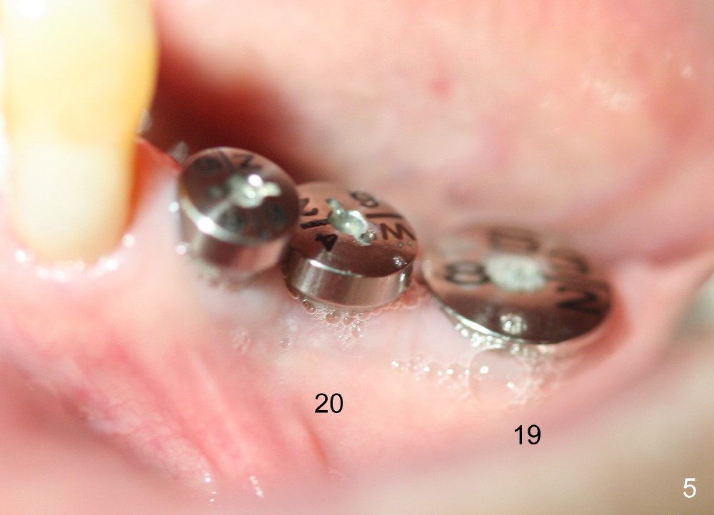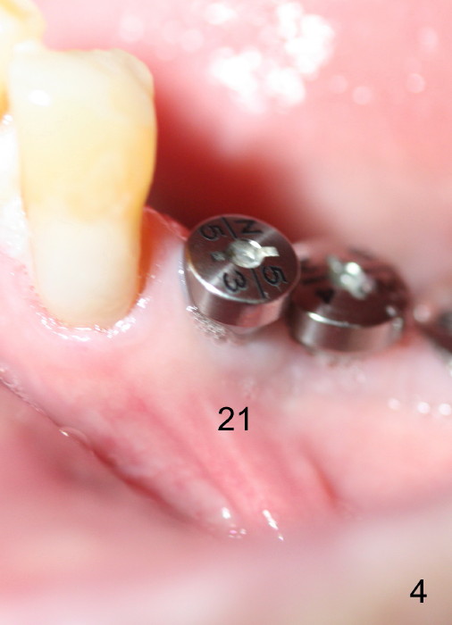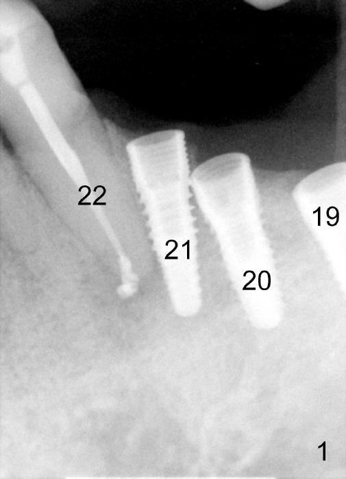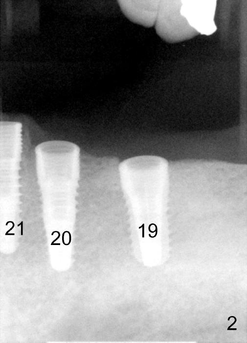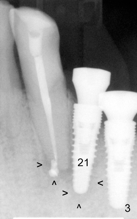 Three weeks post RCT for #22, the patient returns for implant placement at the sites of #19-21 (Fig.1,2). He is asymptomatic. But pain is not well controlled when osteotomy is being done at the site of 21. A shorter and smaller implant (4.1x12 mm, insertion torque <15 Ncm) is placed than planned (4.5x14 mm). One month postop, the implant is not stable at the site of 21 (Fig.3-5). There is a space around the implant, which is continuous with periapical radiolucency (Fig.3 arrowheads). It appears that the immediate implant should have been placed longer following RCT of the neighboring tooth. The tooth #21 has also pre-existing periapical infection.