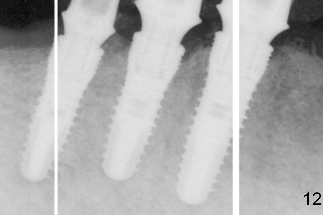 The patient returns for definitive restoration 5 months postop. There is no gross bone resorption around the implants (Fig.12).