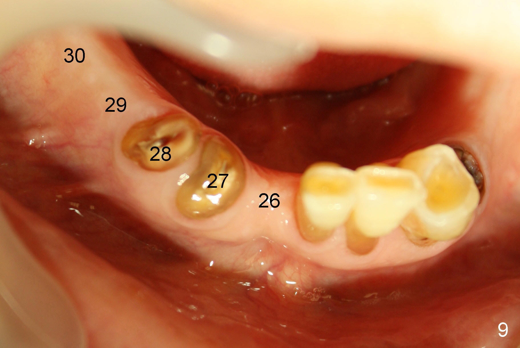 A 85-year-old man has poor dentition (Fig.9). Multiple implants are to be placed at one or two stages (#26-30). If primary stability is obtained for individual implants, they are splinted and immediate provisional is fabricated.