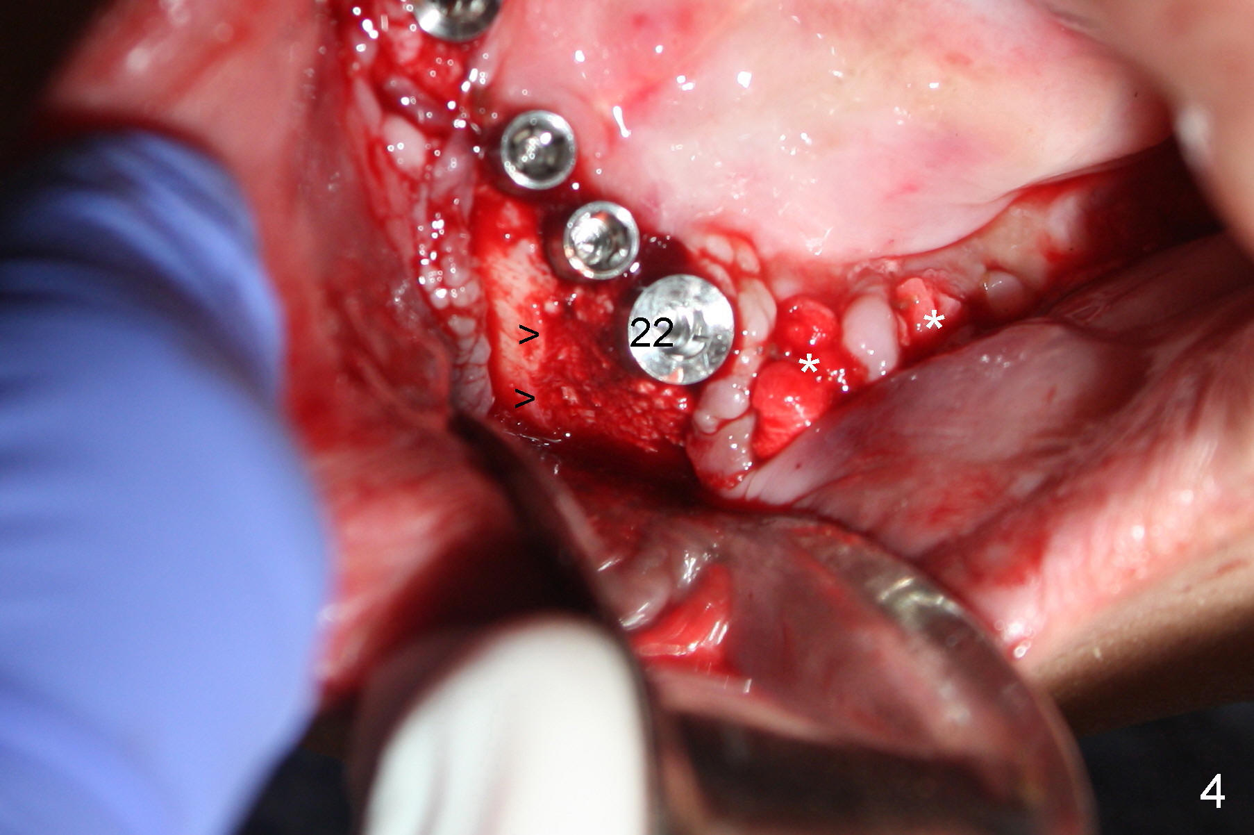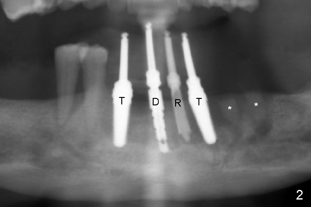Treatment plan of the 1st surgery consists of extraction of #20 and 21/immediate implants (Fig.1 x), and placement of 4 implants between #22 and 27. Osteotomy at the extraction sites without incision (close surgery) turns out to be difficult; it appears to encroach the inferior alveolar nerve and mental loop. The sockets are subsequently bone grafted (Fig.2 *: mixture of autogenous bone and allograft). Incision is the made in the incisor edentulous region for placement of 3.5x17 mm implants (Fig.3 I).