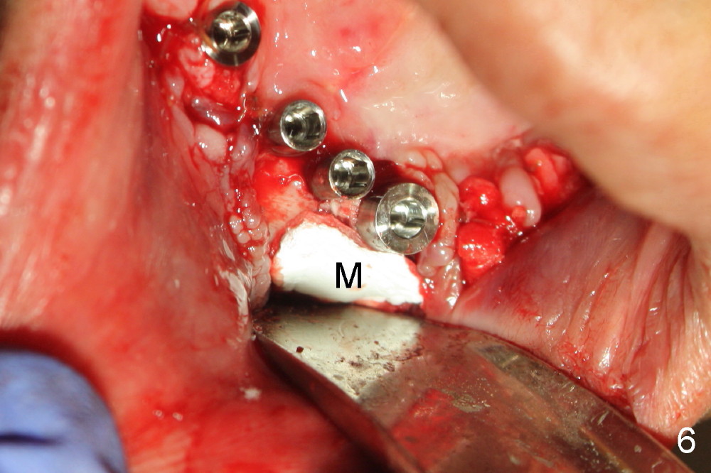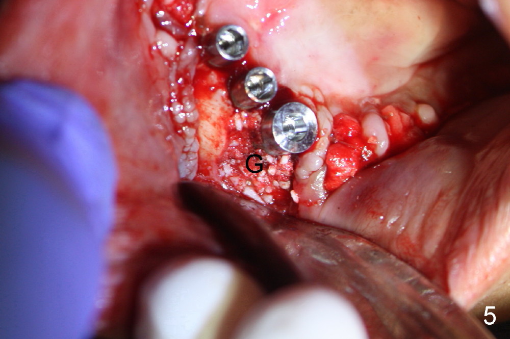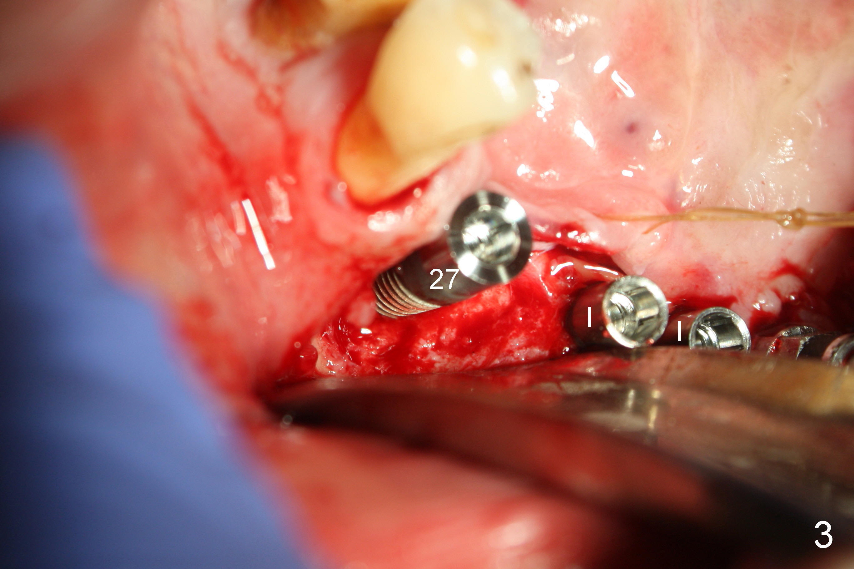 Osteotomy is initiated through the gingiva of the healing sockets at the sites of #22 and 27 (Fig.1) with difficulty (close surgery). The incisor crest incision is extended distal to the canine areas; an accessory oblique incision is supplemented to facilitate implantation (#22: 5x14 mm; #27: 4.5x17 mm) and expose the buccal defects (Fig.3,4, open surgery). The defects are grafted (Fig.5) and covered by collagen membrane (Fig.6). The incisions are closed and abutments are placed for immediate provisional (Fig.7).