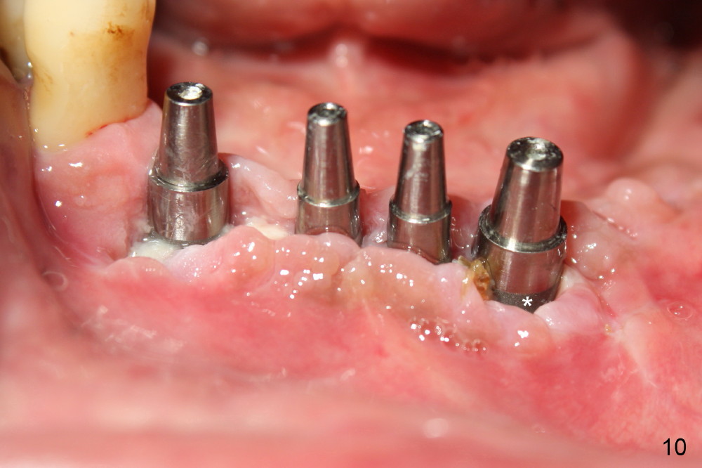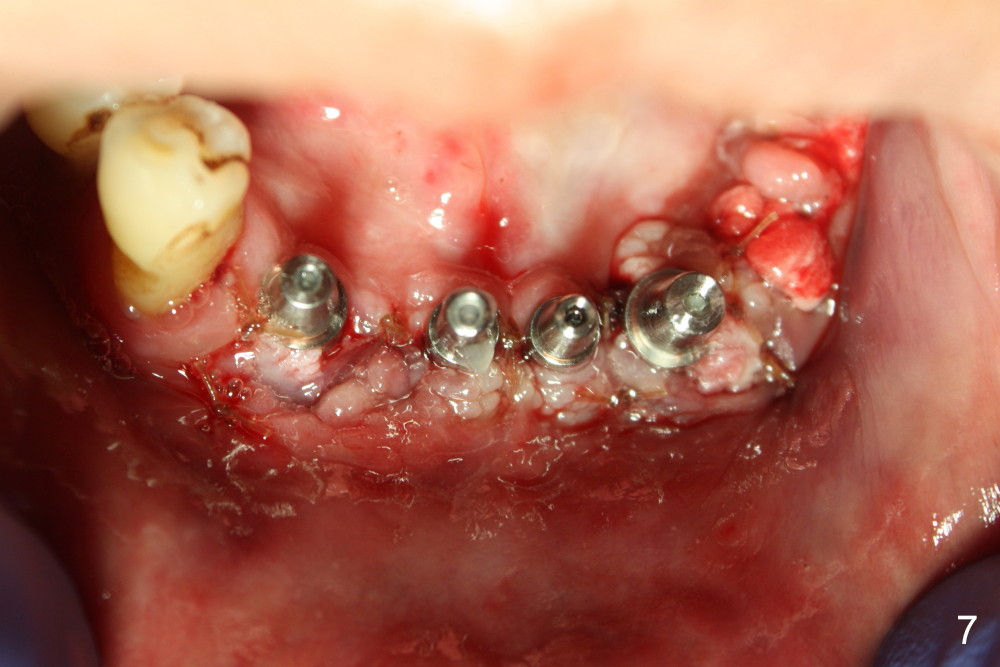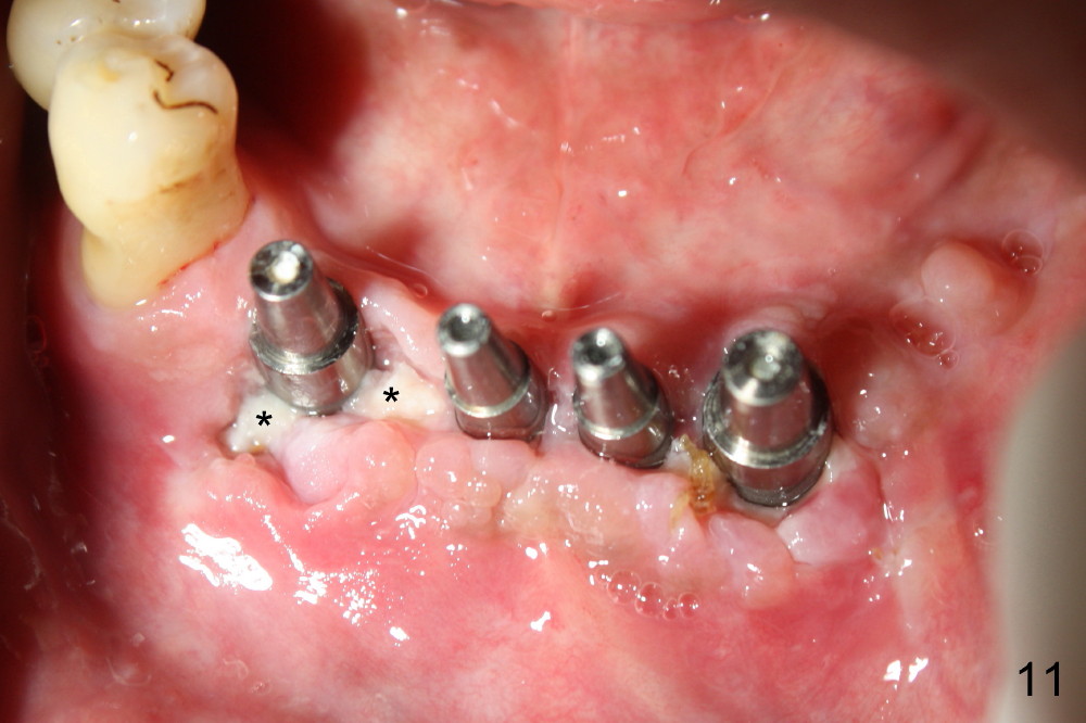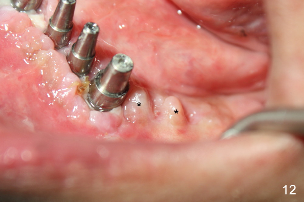 Once the patient improves oral hygiene as instructed, the wound around the implants begins to heal (Fig.10,11) one week later, while that continues healing around guided tissue regeneration area (Fig.12).