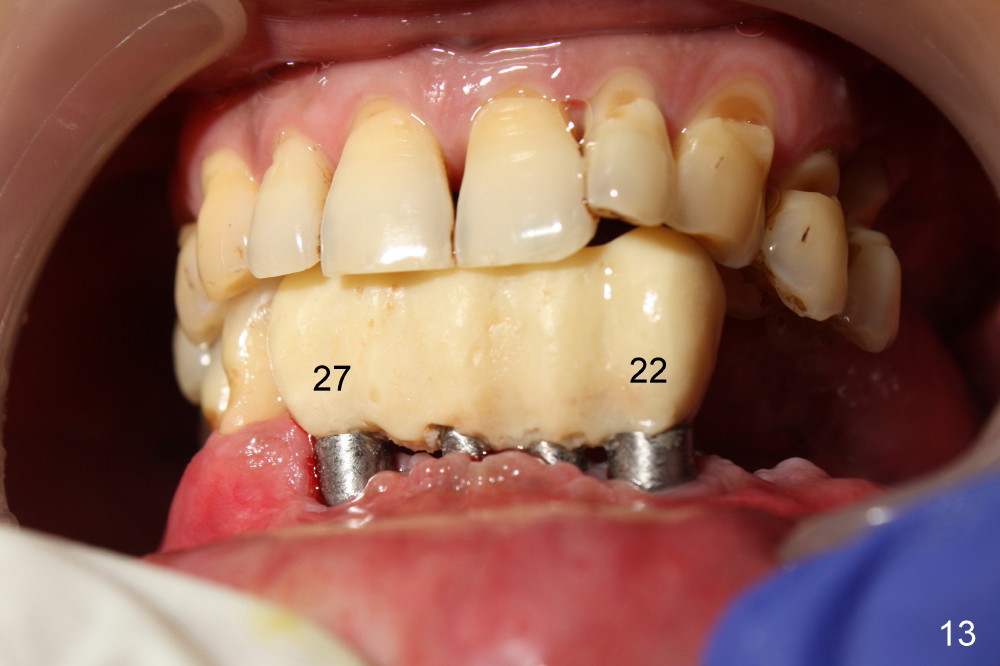 The rough surface of the implants at the sites of #22 and 27 is covered by the gingiva 2 months postop(Fig.13, as compared to Fig.10).