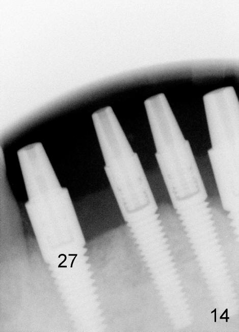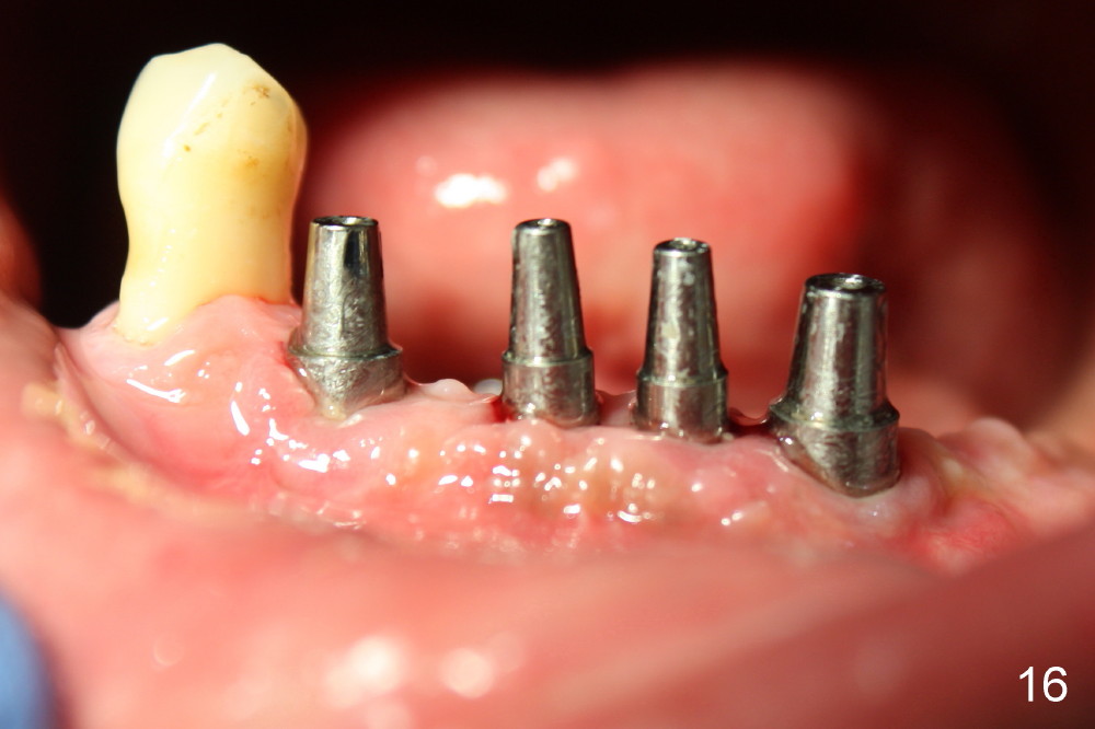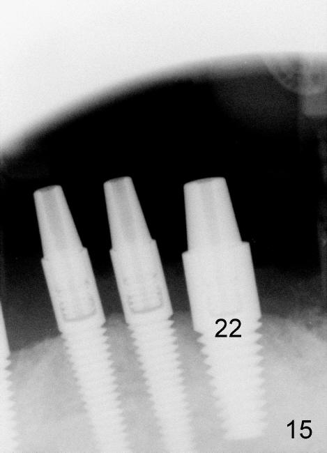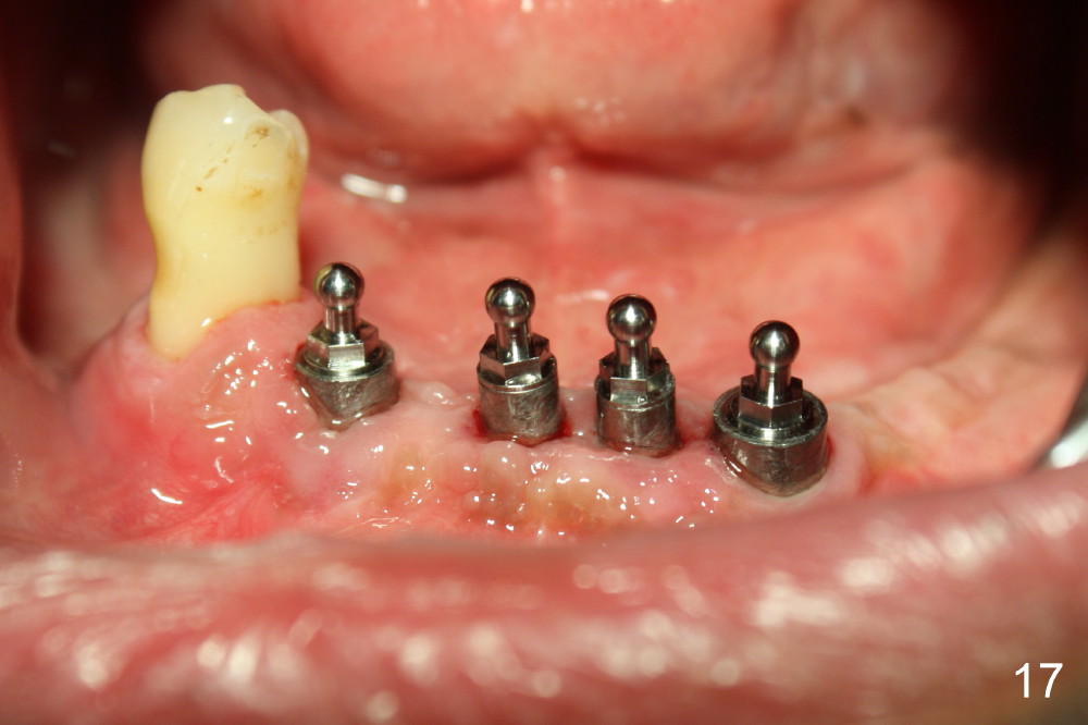 The 4 anterior implants appear to have been osteointegrated 5 months postop (Fig.14,15). More gingiva has covered the top portion of the implants (Fig.16). Ball abutments are placed for an overdenture (Fig.17).