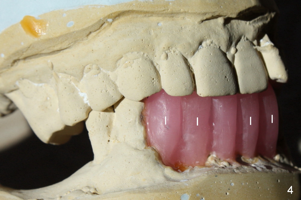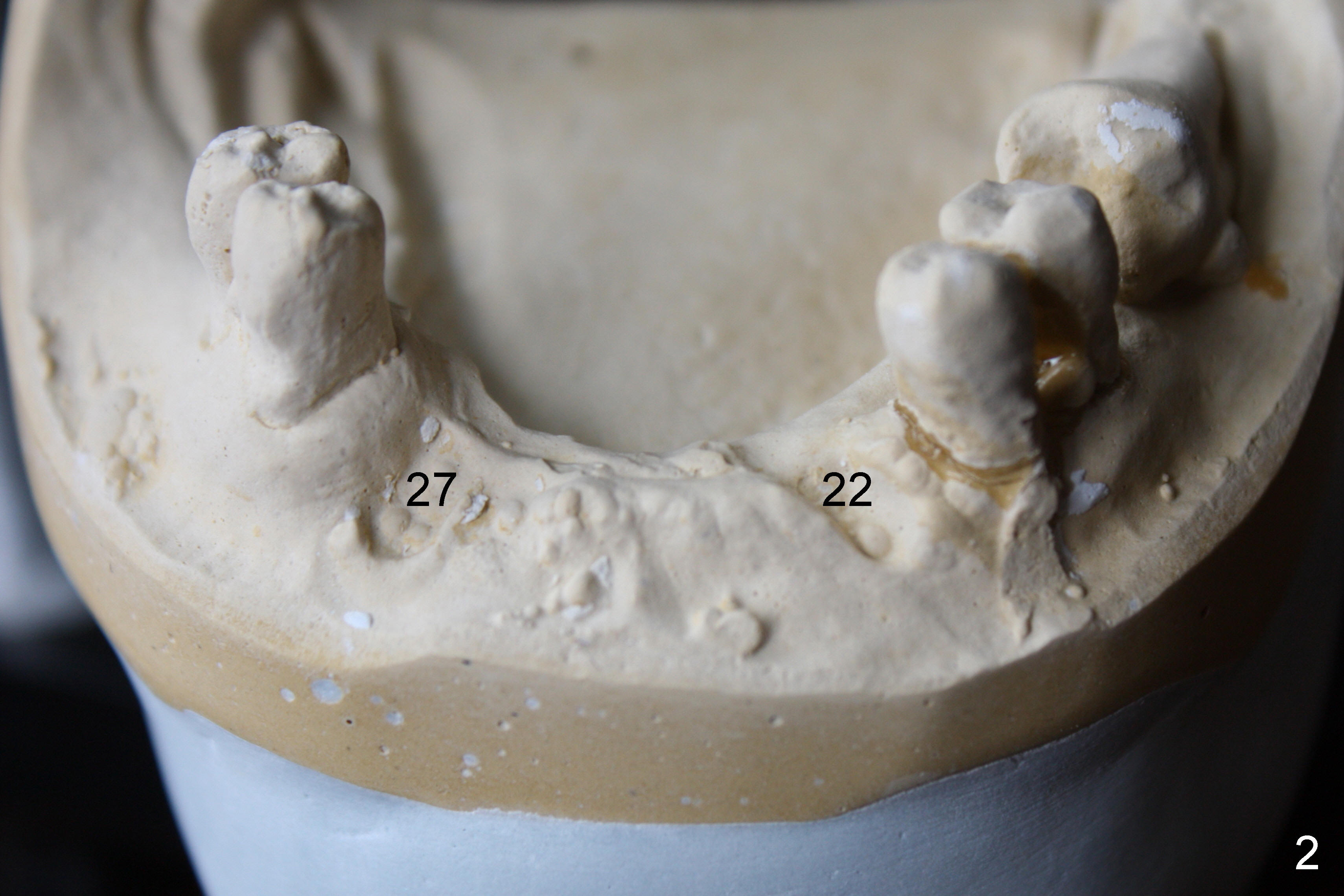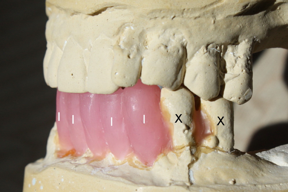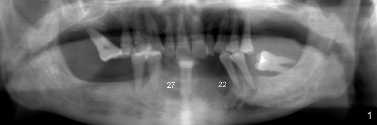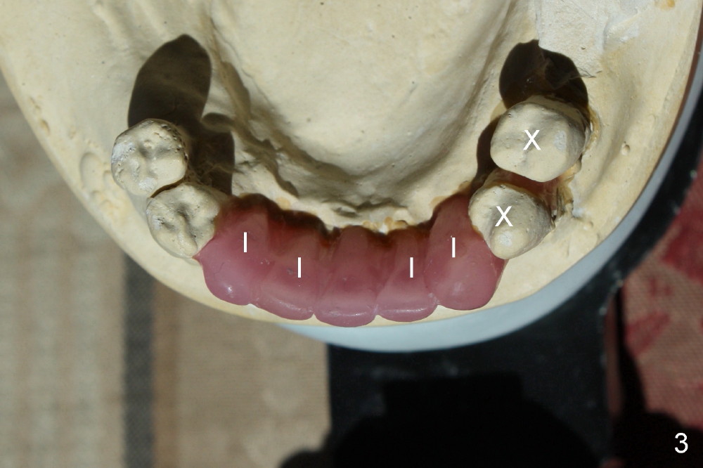 A 52-year-old man seeks treatment 2 months following loss of #22-27 fixed partial denture (FPD) (Fig.1,2). The remaining dentition has moderate to severe chronic periodontitis. Scaling & root planing has been done for the upper arch. Full mouth reconstruction is planned for the lower one in two steps. In the first procedure, the teeth #18, 20 and 21 are extracted; an incision is made from #20 to #27; two immediate implants are placed at the sites of #20,21 (one or two piece, Fig.3,5 X); another two implants at #22,27 (recently healed sites: Fig.3-5: I) and two one piece implants at lateral incisor region (I: for an implant supported FPD). In case one of the lower left premolars cannot have an implant due to proximity to the nerve, a FPD can be fabricated in the canine/premolar sextant. A splinted immediate provisional restoration will be fabricated from #20-27 immediately.