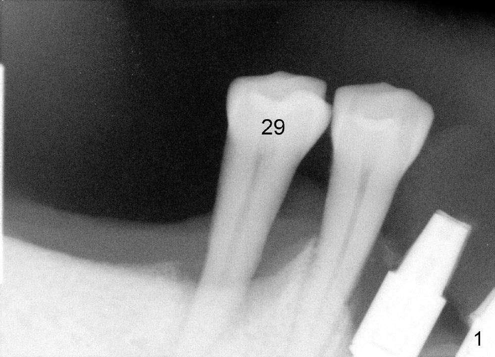 Once the anterior implant-supported immediate provisionals are stabilized, the tooth #29 is planned to be extracted and have an immediate implant as the second stage of lower arch reconstruction. At the first stage, left inferior alveolar nerve paresthesia occurs probably due to complete block of mental nerve with Articaine. The patient is not cooperative in intraop X-ray.