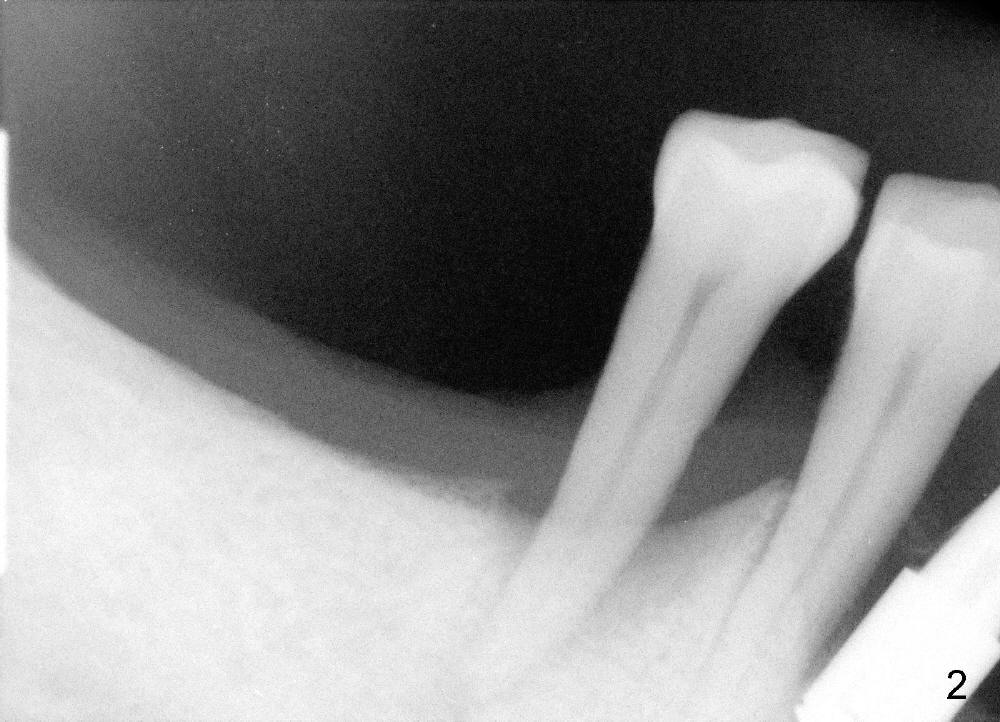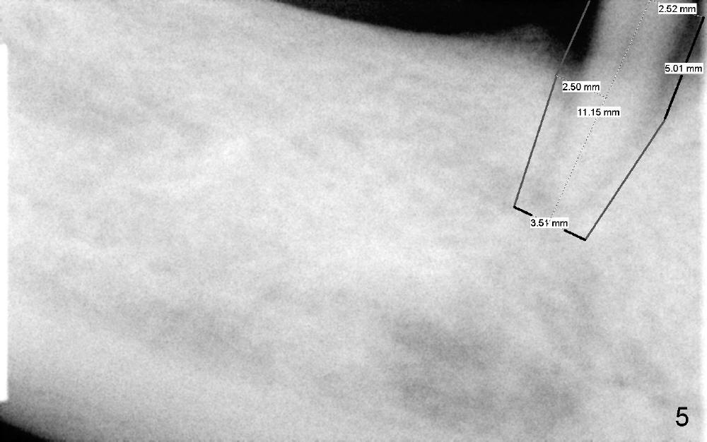 The third step to avoid paresthesia is called no drill osteotomy. When the tooth is extracted, the depth of the socket is measured. Tap(s) will be used to create the osteotomy (to form threads); the depth is controlled with precision. How to decide the diameter of the implant? It should be large enough to obtain primary stability, but an oversized implant may also injury the loop. It is estimated that a 5x11 mm tissue-level tapered implant will be used (Fig.5) or 4.5x11 mm. Mesiodistally the implant should be a little larger than the root, since buccolingual width of the socket is larger. The osteotomy will be as lingual as possible, since the mental loop is buccally located. A photo is going to be taken to show the oval shape of the socket. If visibility is poor, a flap may be raised.