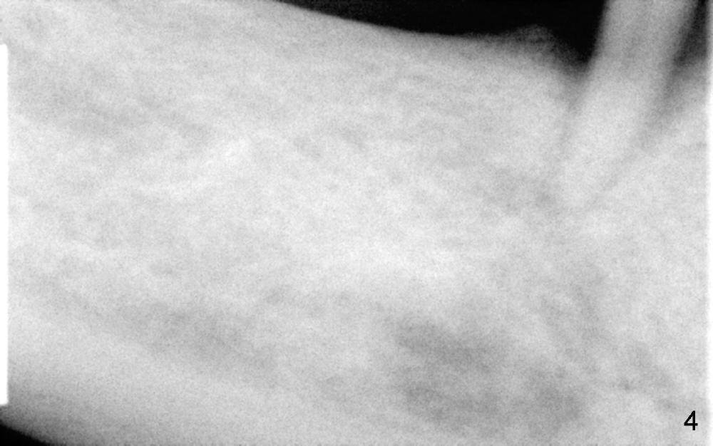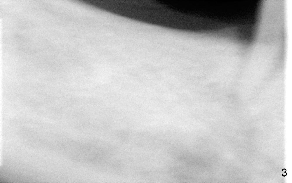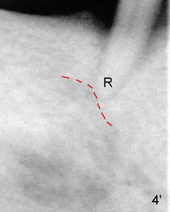 To avoid paresthesia on the right side, several preop PAs are taken (Fig.1-4) so that we know how to take good X-ray for this gagging patient. At first, #2 Sensor is used to take the first PA (Fig.1). It does not show the apex of the tooth #29. The second PA is a little better (Fig.2), but the mental nerve is out of view. Then #1 sensor is used. It allows us to position the sensor lower (Fig.3), but the image is blurred. When it is retaken, the image is clear (Fig.4), showing the proximity of the mental nerve loop (Fig.4': red dashed line) to the root tip of the tooth #29 (R).