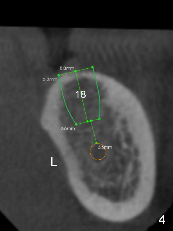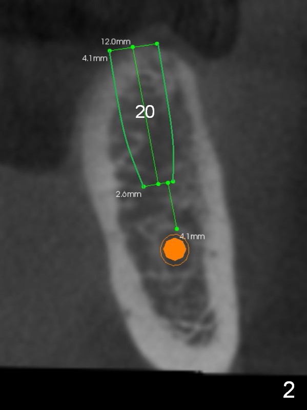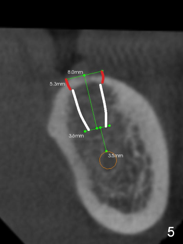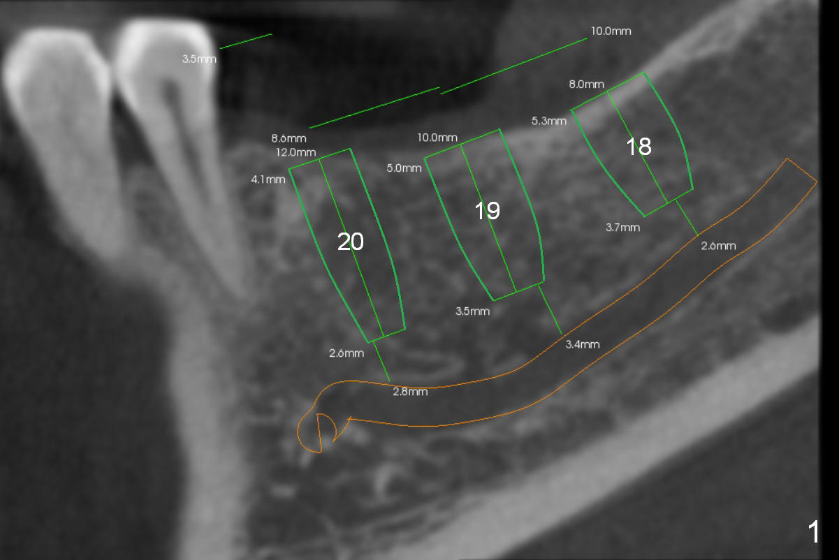 A 52-year-old lady has lost totally 5 lower posterior teeth (2 on the right, 3 on the left (#18-20, Fig.1 (CBCT sagittal section)).  Fig.2-5 are coronal sections of the individual edentulous areas.  It appears that the cortex is thick and dense, whereas the cancellous bone is loose (50-300 Housfield units).  To obtain higher primary stability without microfacturing the cortical plate, use one size smaller drill for the cancellous bone (Fig.5 white line, as compared to Fig.4 green line); the last drill barely touches the coronal portion of the osteotomy (Fig.5 red line).  If primary stability is too high, a profile or tap drill can be used from UF cassette.